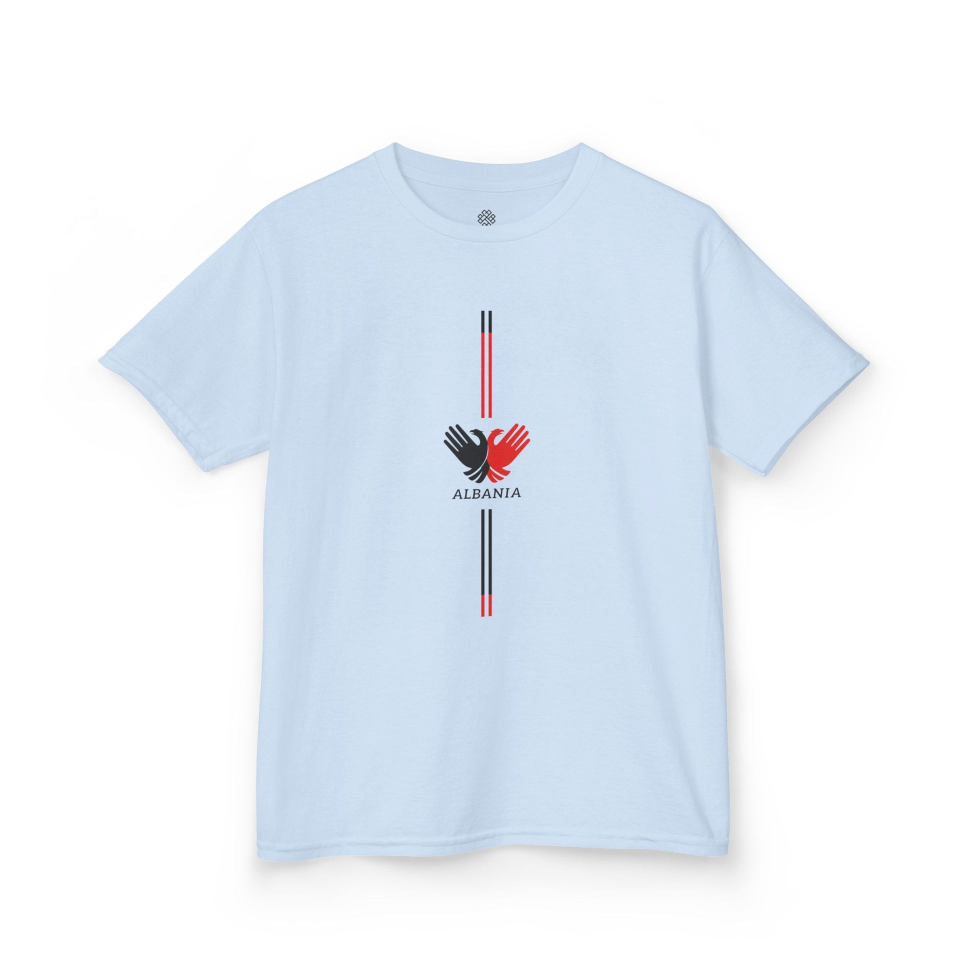 Celebrate culture from a young age with this stylish and meaningful Albanian kids' t-shirt. Featuring a minimalist design of two hands forming the iconic double-headed eagle in black and red—Albania's national colors—this tee is both playful and proud. Vertical heritage-inspired stripes add a sleek touch to the front, while the soft heather gray fabric ensures all-day comfort. Perfect for holidays, cultural events, or everyday wear for little ones who carry big pride in their roots.