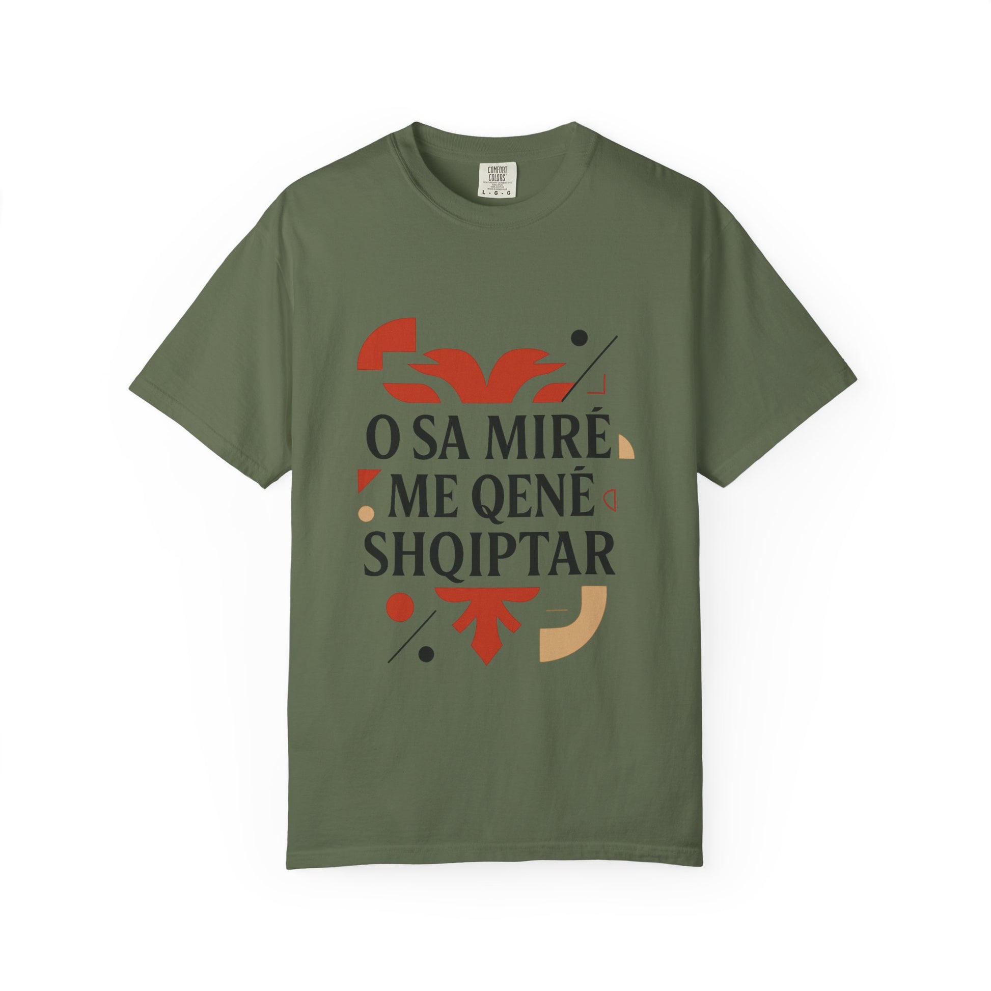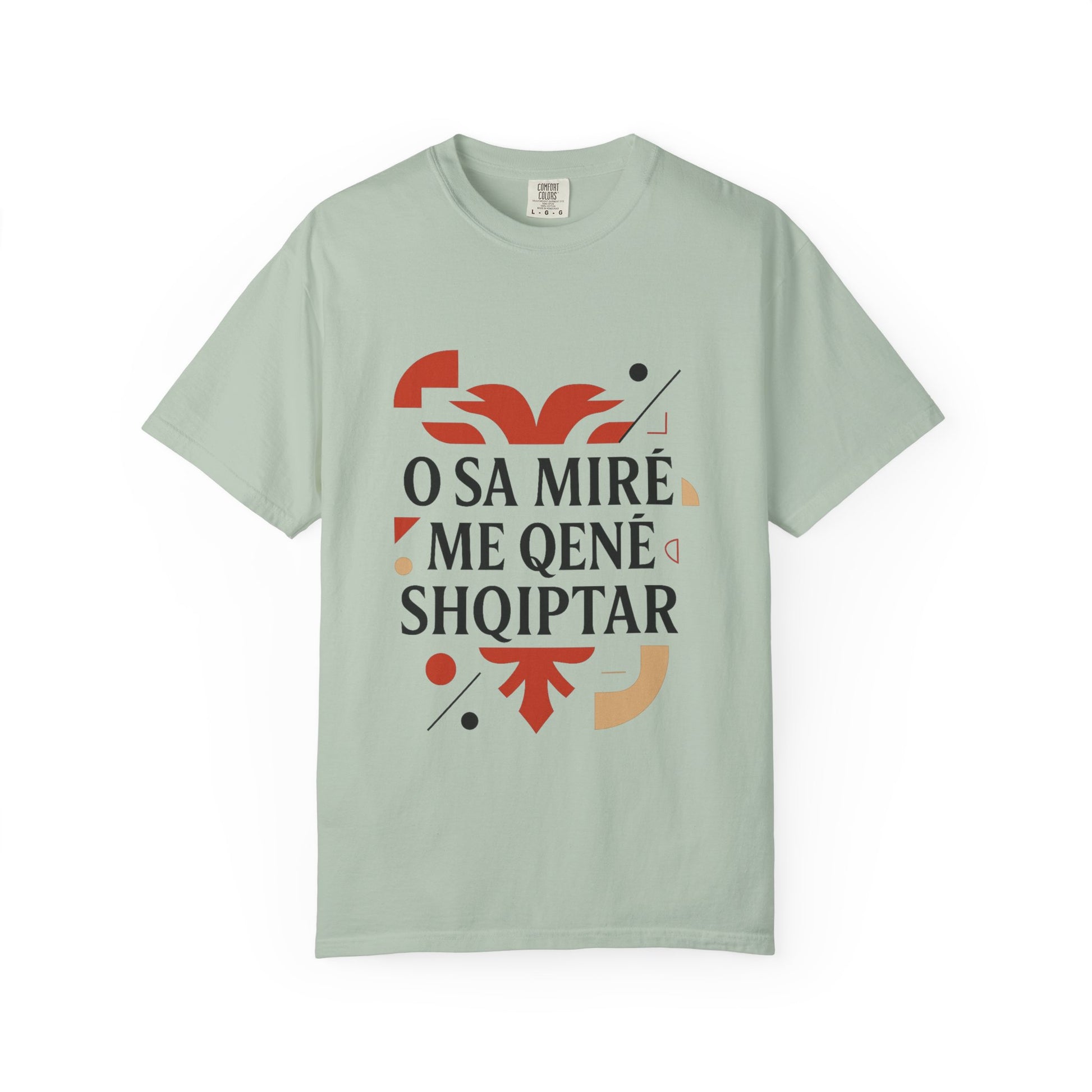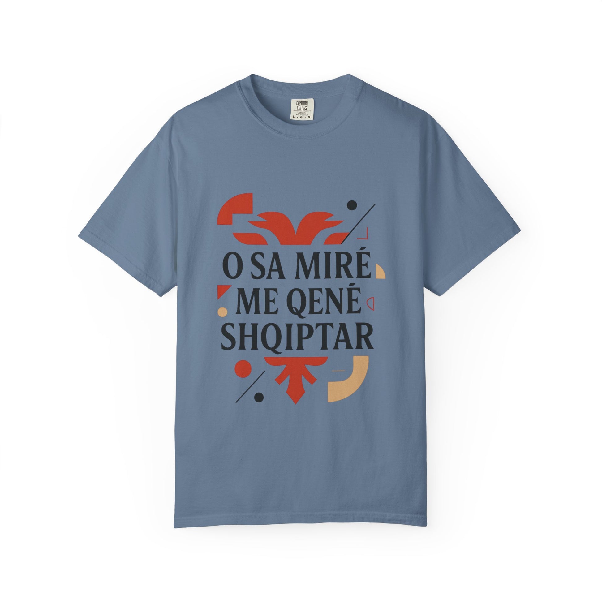 A unisex garment-dyed t-shirt with a design featuring Shqip, O Sa mire me qene shqiptar, Albania, Kosovo. This t-shirt is perfect for those proud of their Albanian heritage and is a great addition to their wardrobe. Ideal for celebrating Albanian holidays and events.