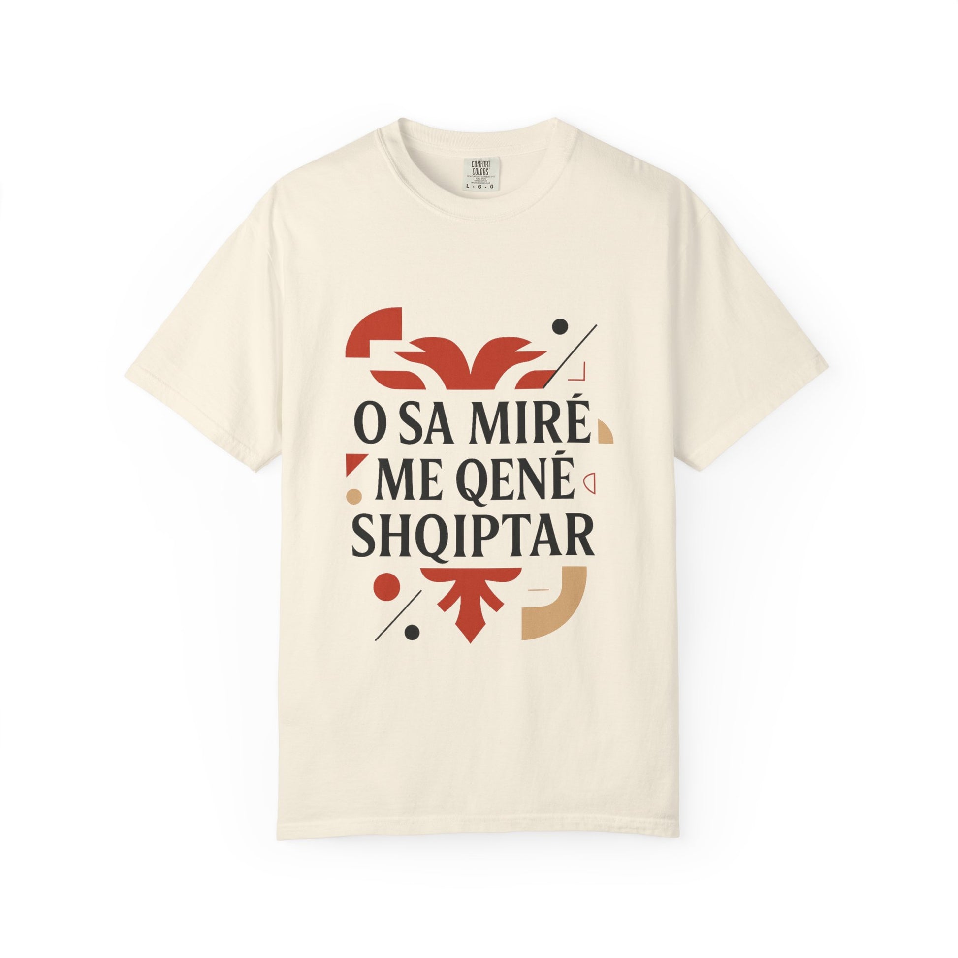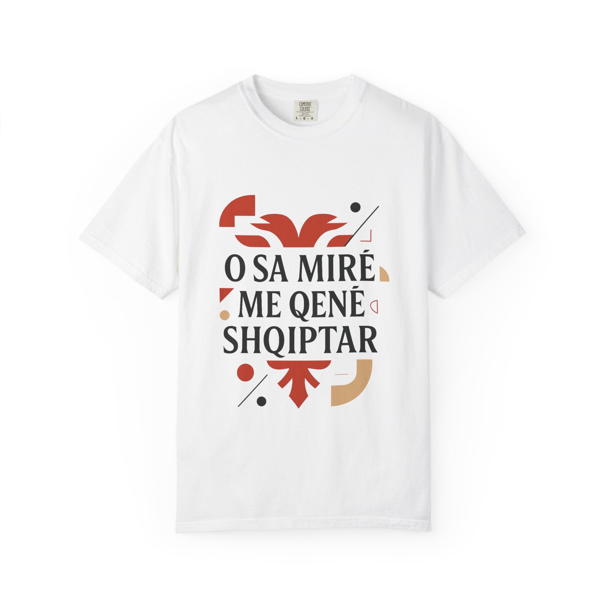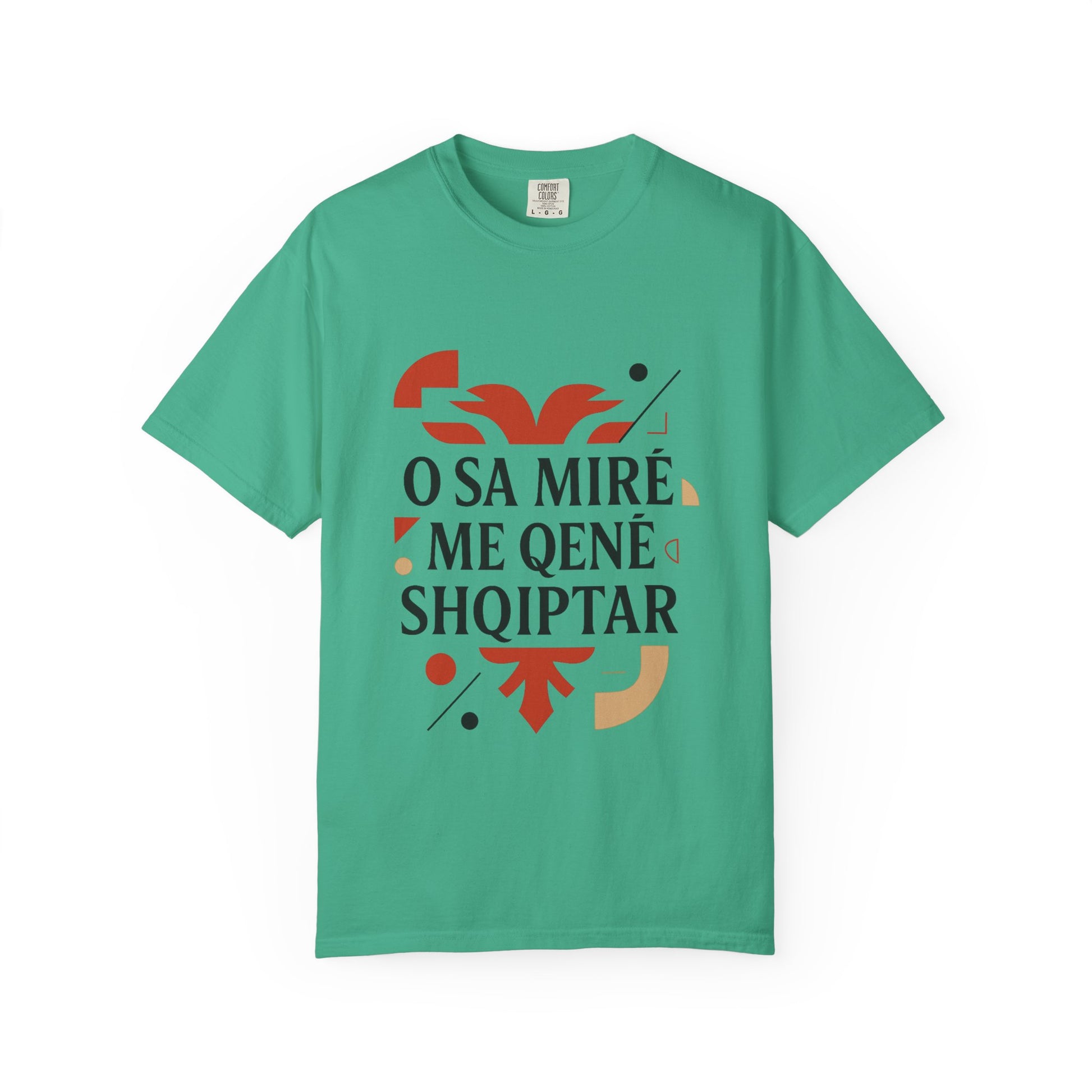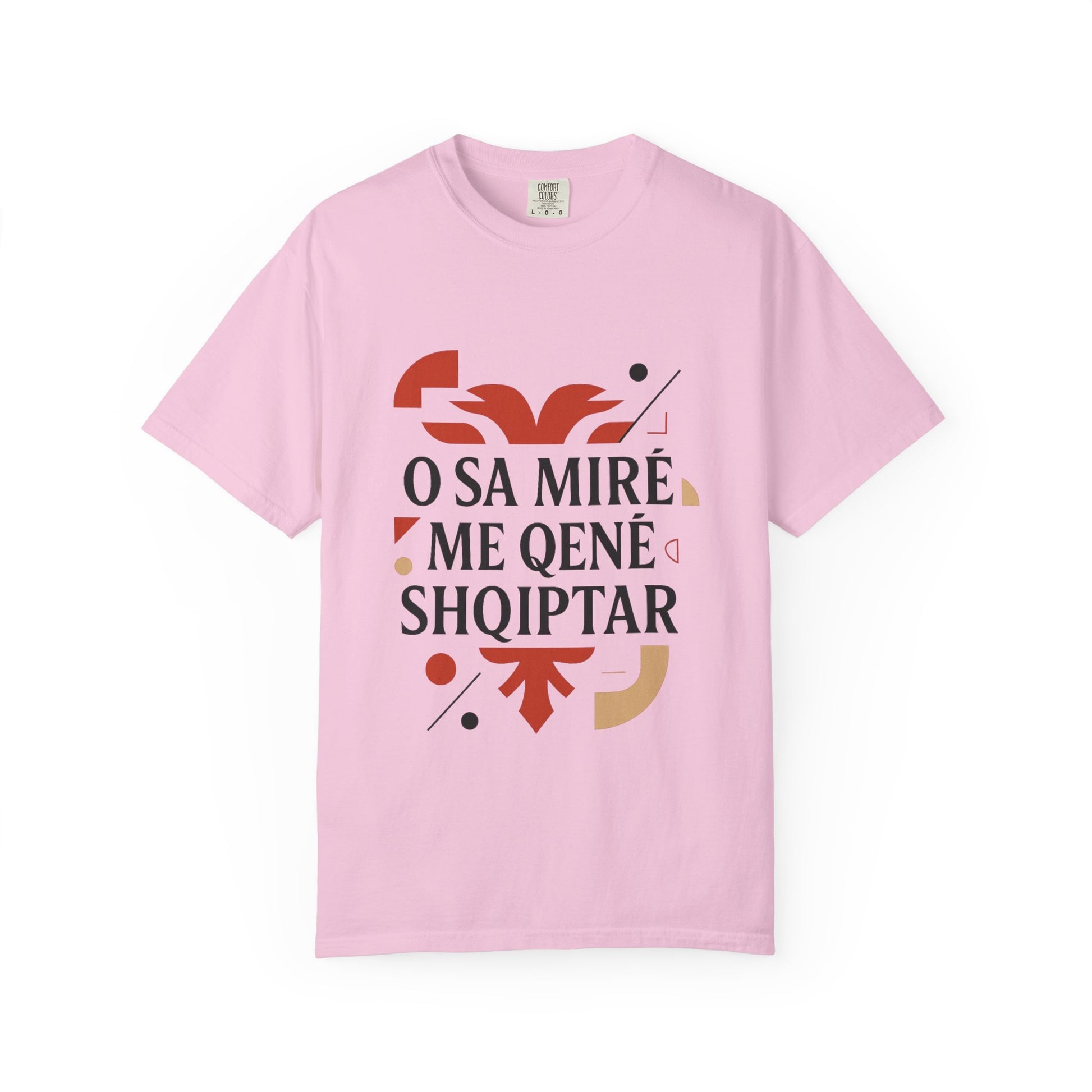 A unisex garment-dyed t-shirt with a design featuring Shqip, O Sa mire me qene shqiptar, Albania, Kosovo. This t-shirt is perfect for those proud of their Albanian heritage and is a great addition to their wardrobe. Ideal for celebrating Albanian holidays and events.
