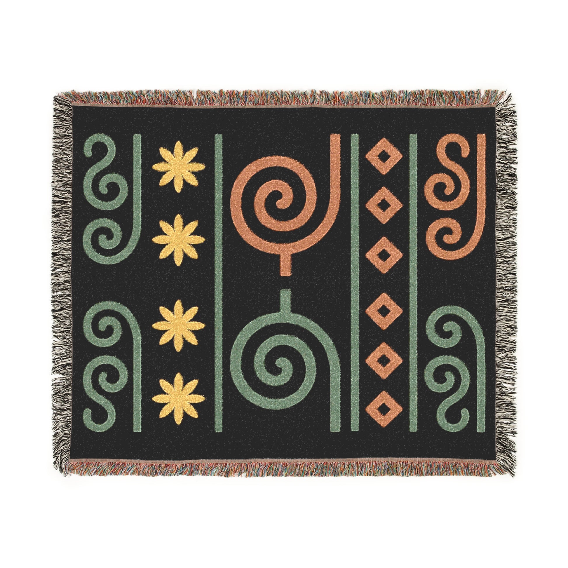 Inspired by ancient Illyrian geometry, this woven throw blends a bold black backdrop with sage, terracotta, and warm gold motifs arranged in a rhythmic, heritage-inspired layout. Spirals, star-flower shapes, diamonds, and flowing wave lines create a lively boho aesthetic that adds depth and cultural character to any space. Soft, durable, and beautifully textured, it layers effortlessly over your sofa, reading chair, or bed. Expertly woven from premium cotton, it offers everyday comfort while celebrating timeless craftsmanship—and remains fully machine-washable for easy care.