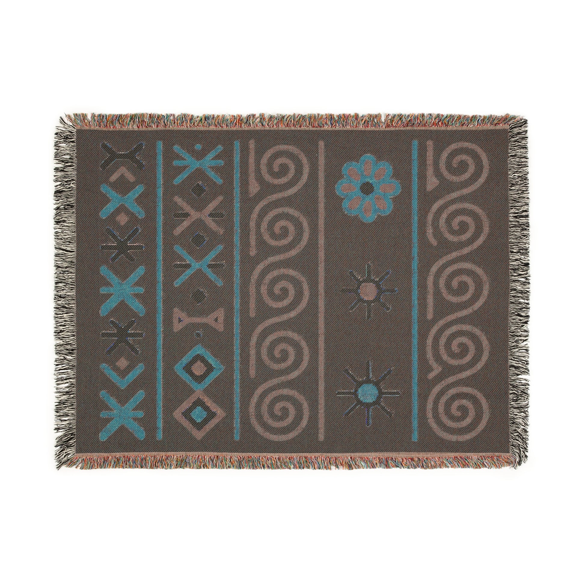 Black, Teal and Sunset Boho Sunburst Symbol Woven Throw Blanket - llyrian Weave