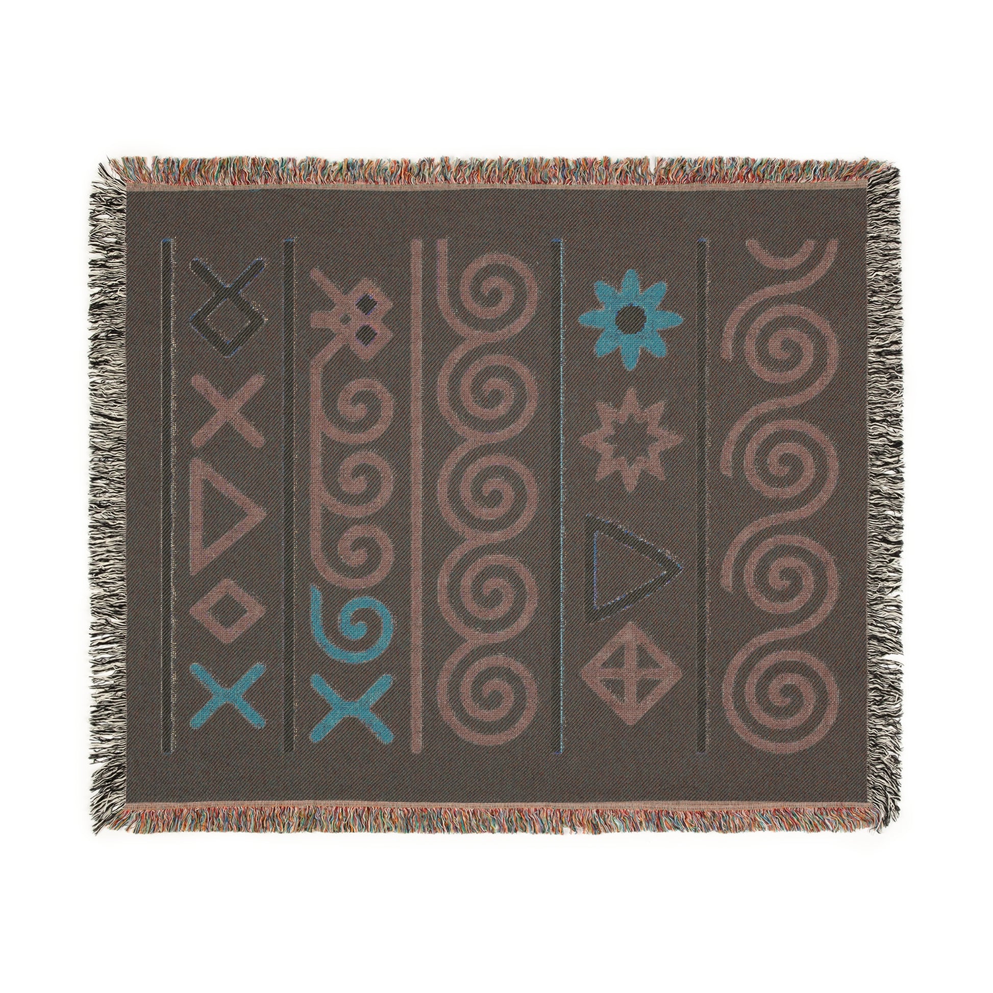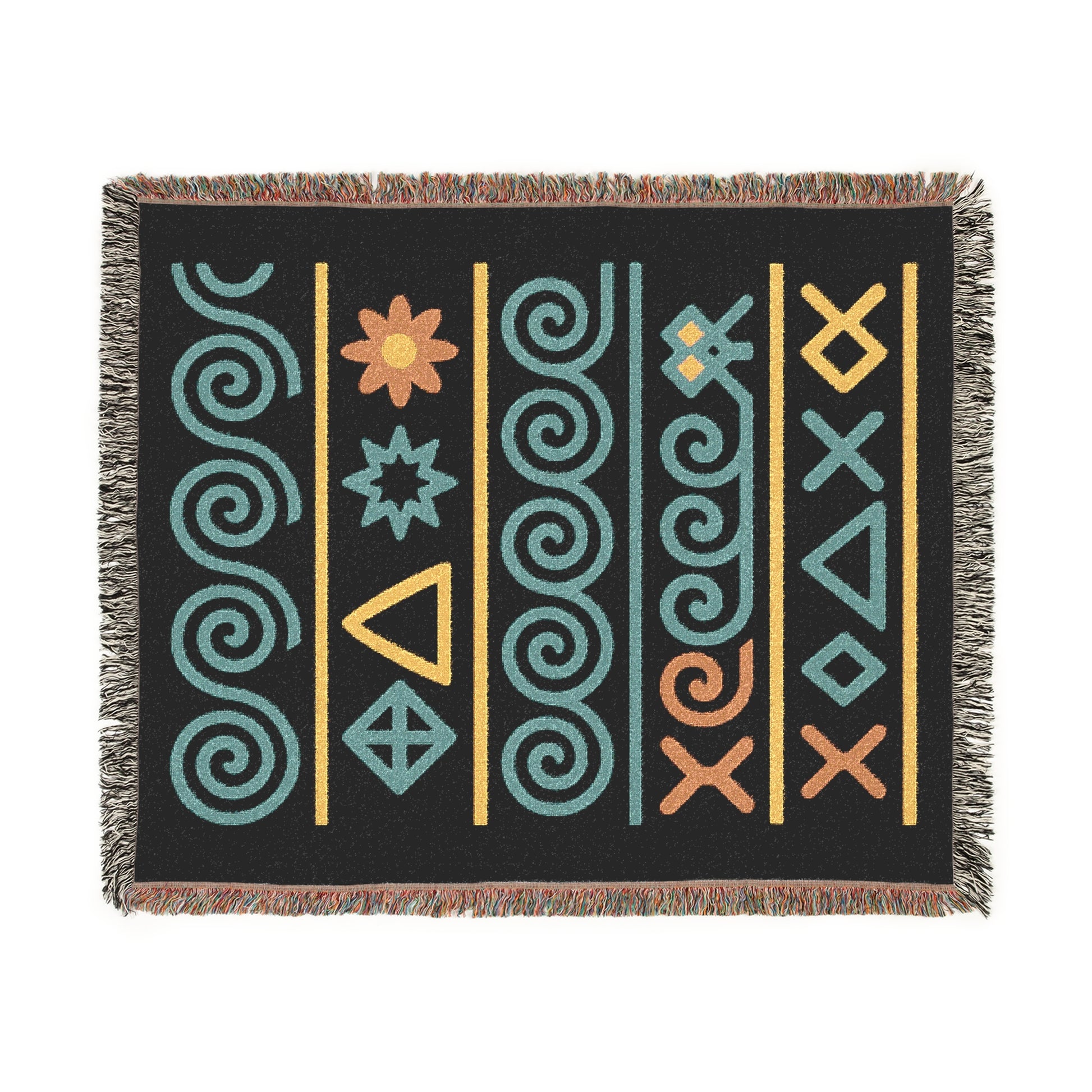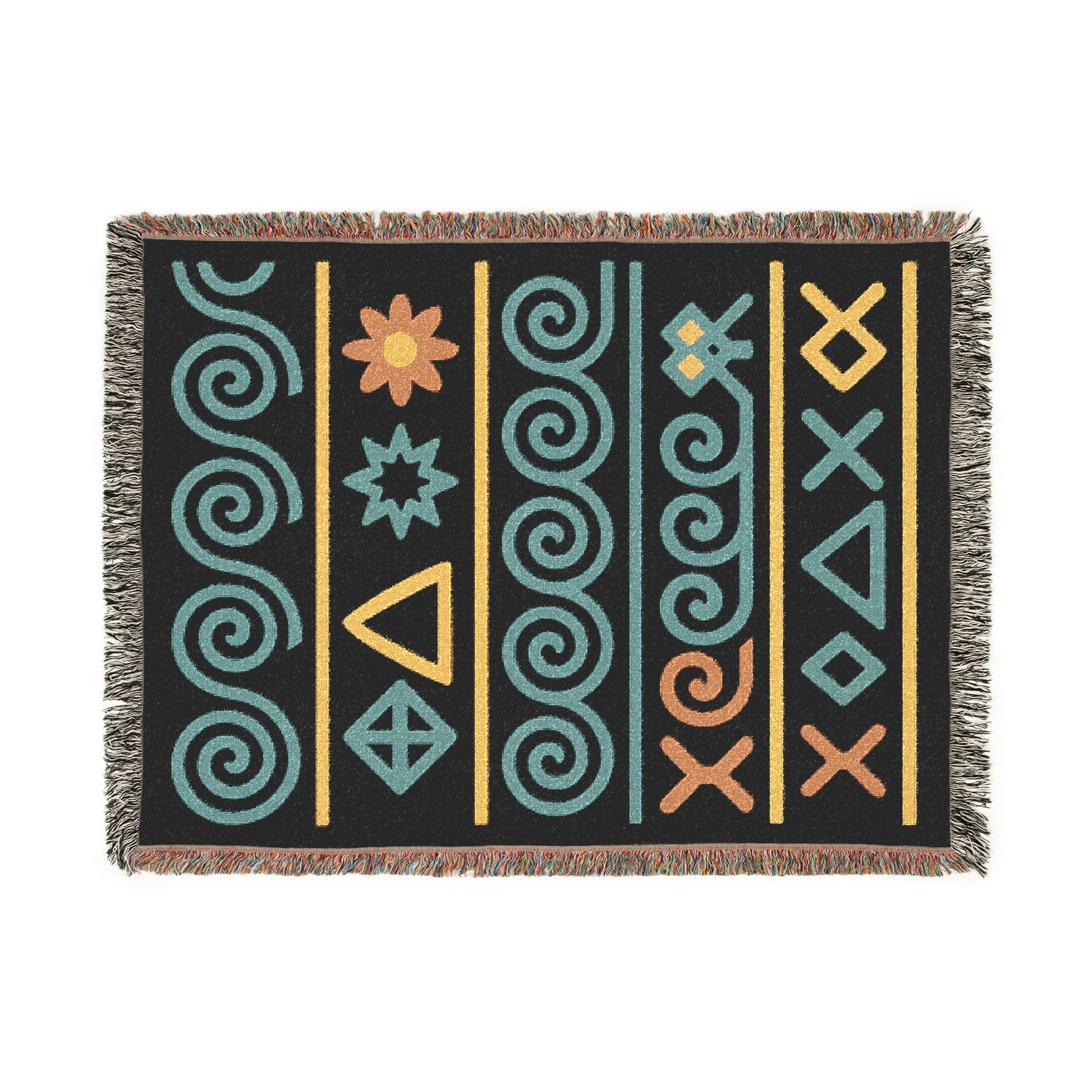 Black, Teal & Golden Boho Tribal Symbol Woven Throw Blanket - Illyrian Weave