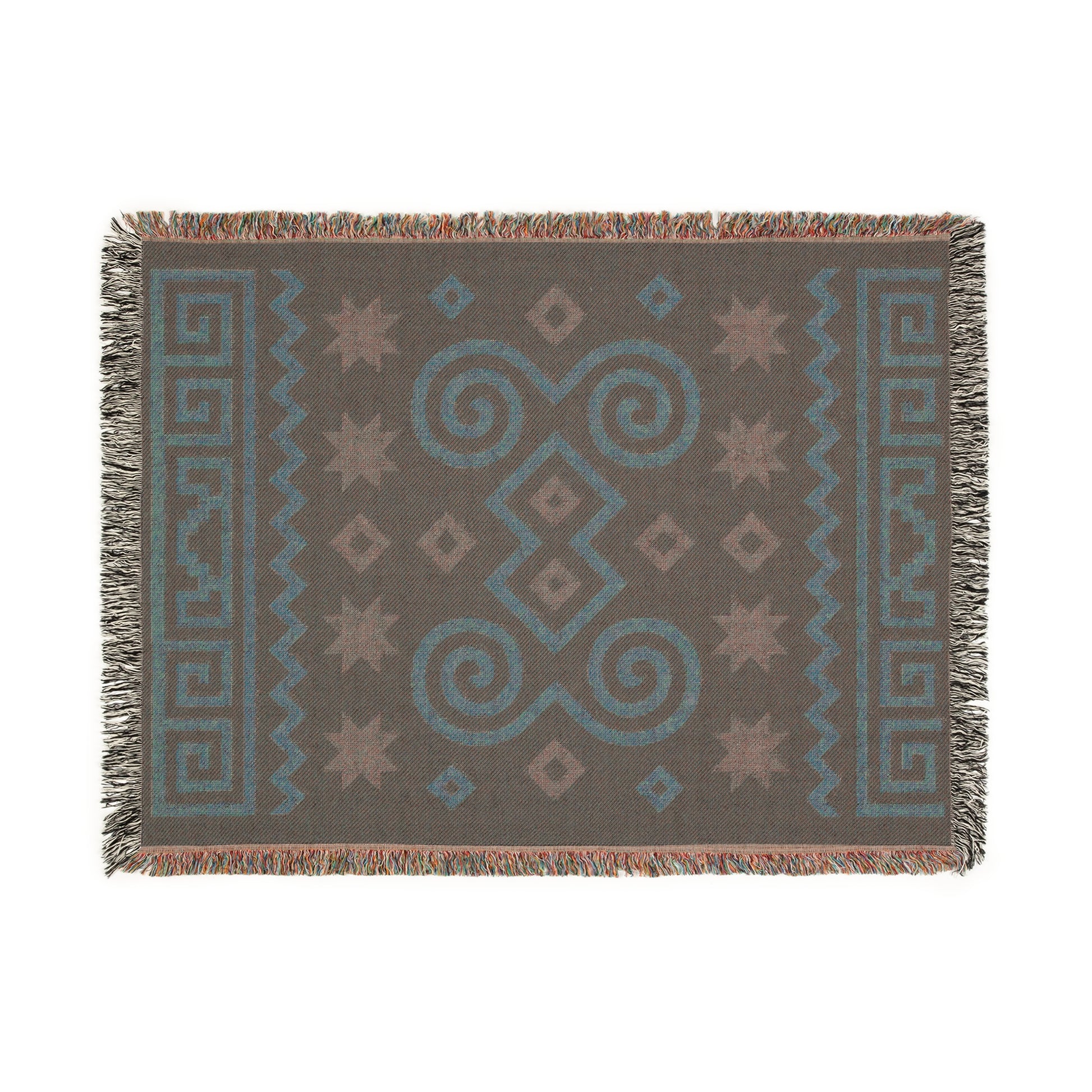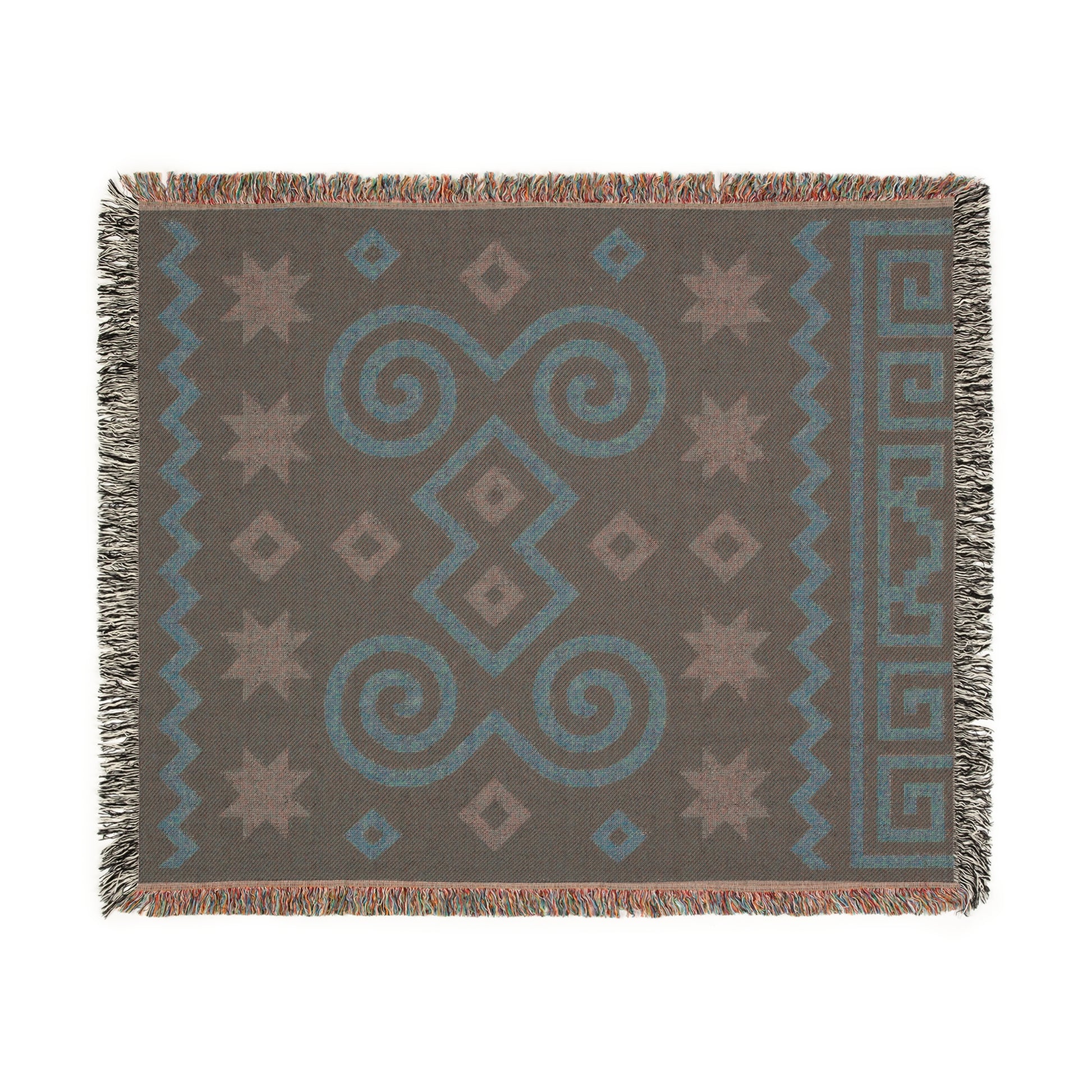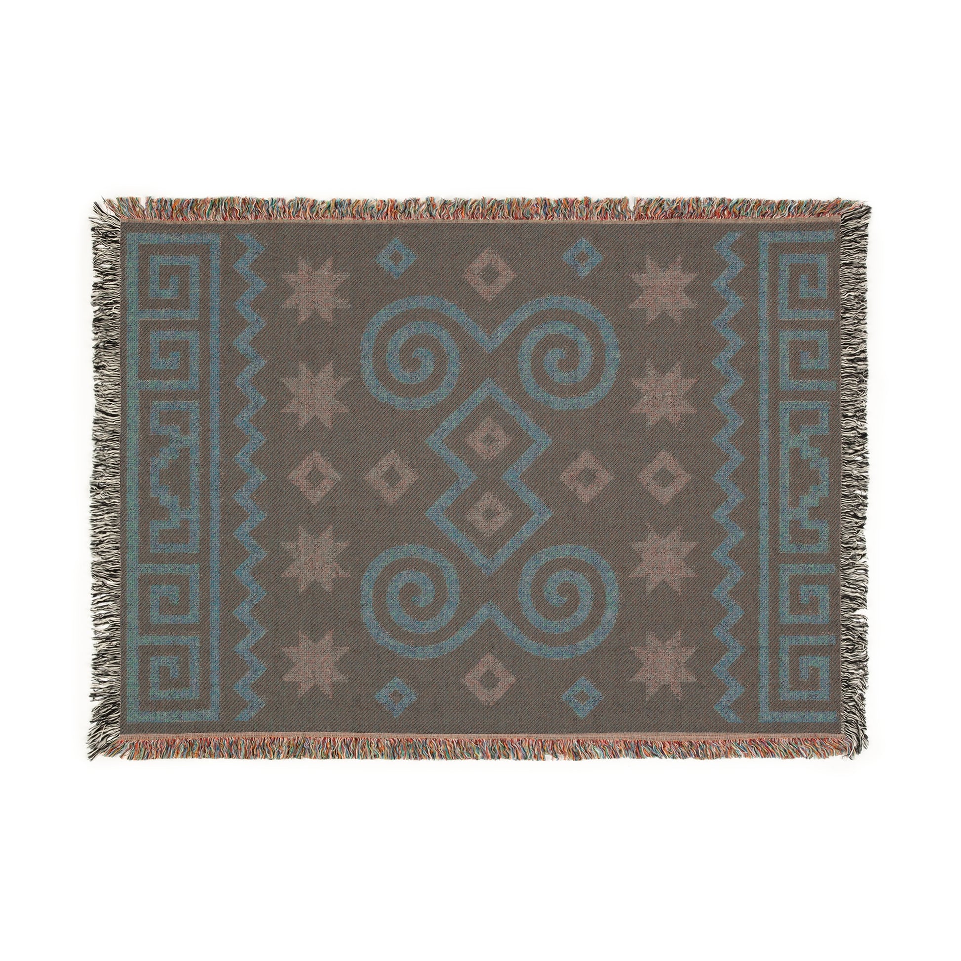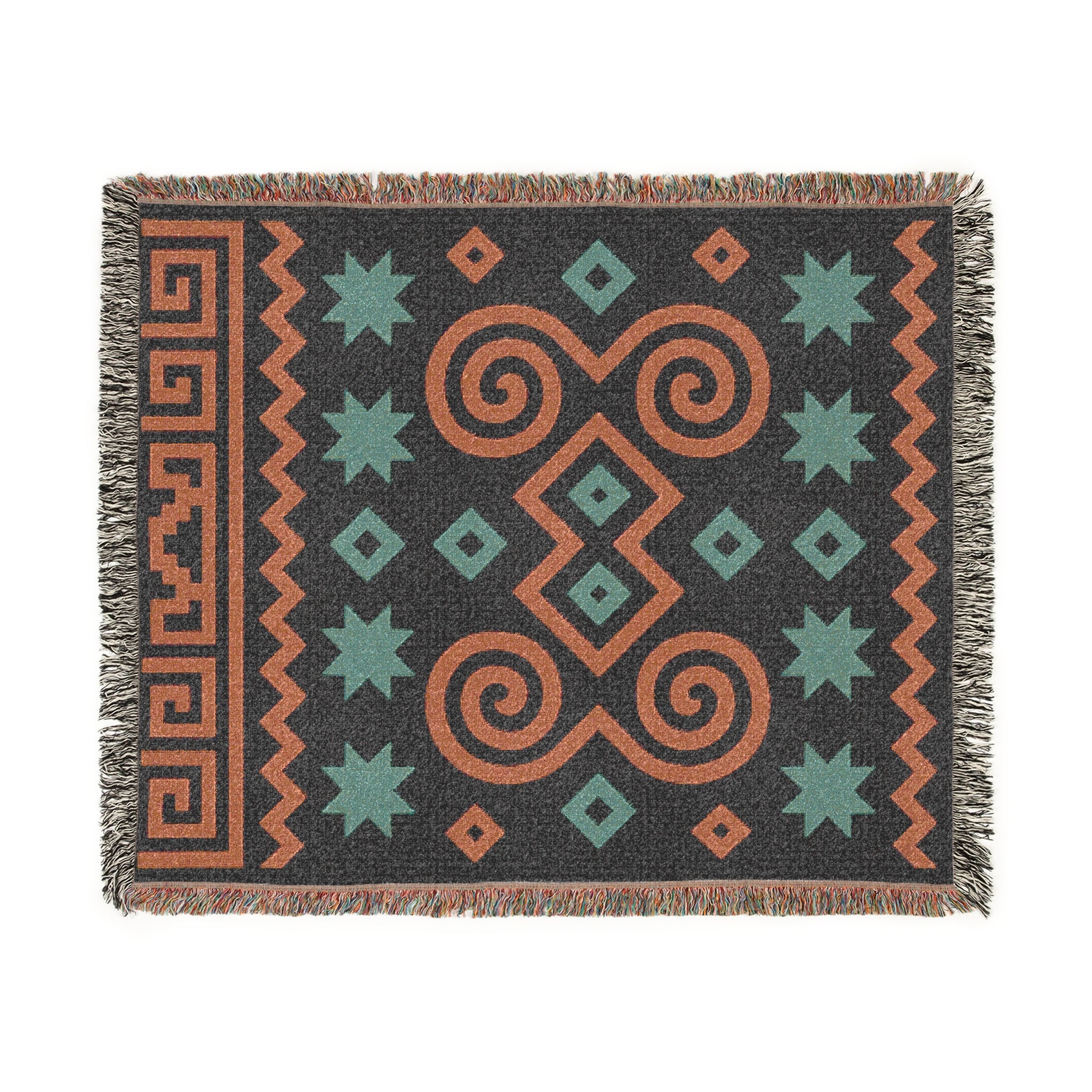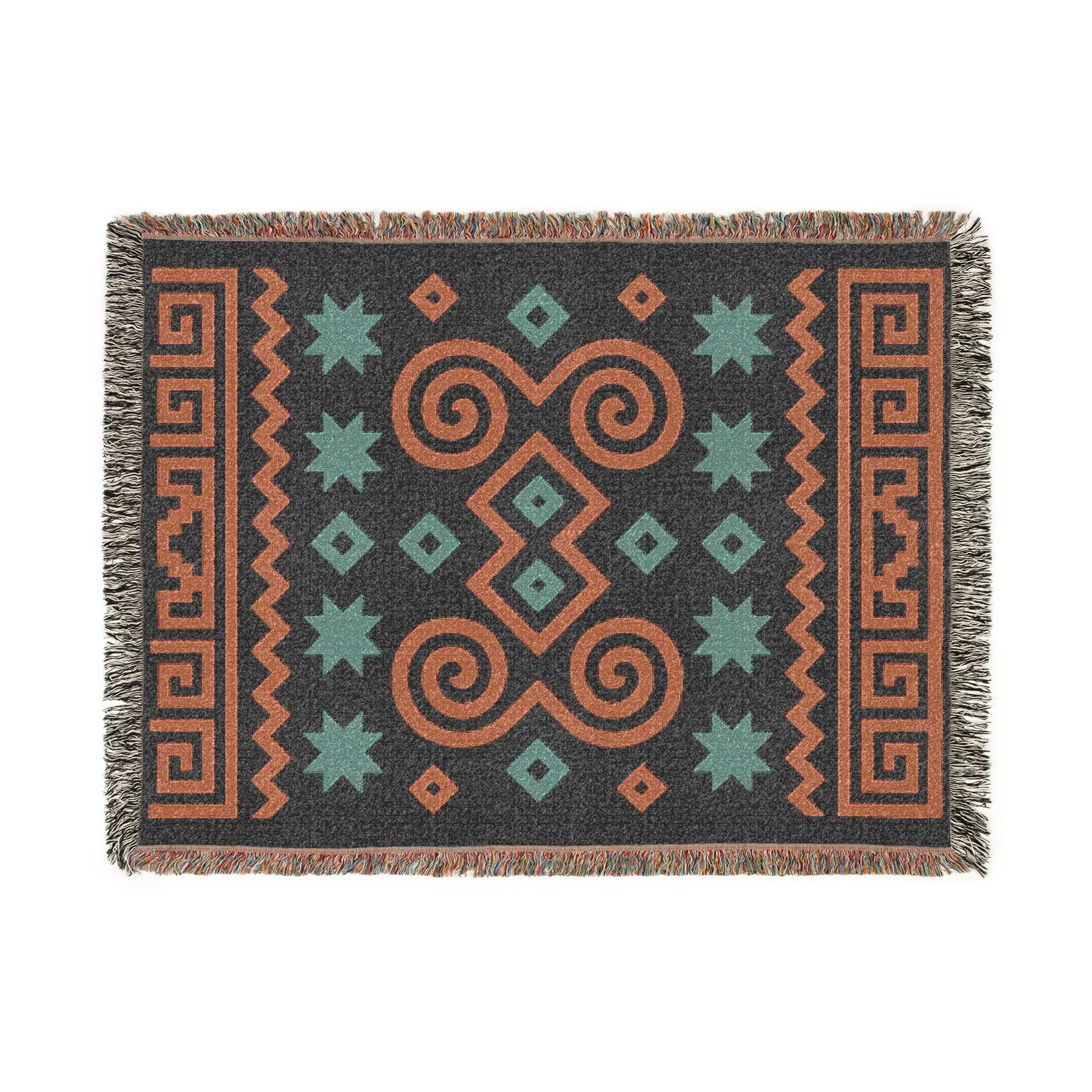 Inspired by ancient Illyrian folk geometry, this woven throw features a striking interplay of terracotta spirals, sage starbursts, sharp diamonds, and stepped border patterns against a deep black backdrop. The bold central layout and rhythmic border details create a dramatic boho aesthetic rooted in heritage craftsmanship. Soft, durable, and richly textured, it layers beautifully across sofas, beds, or reading nooks, adding warmth, artistry, and cultural depth to any space. Expertly woven from premium cotton, it offers everyday comfort and remains fully machine-washable for effortless care.