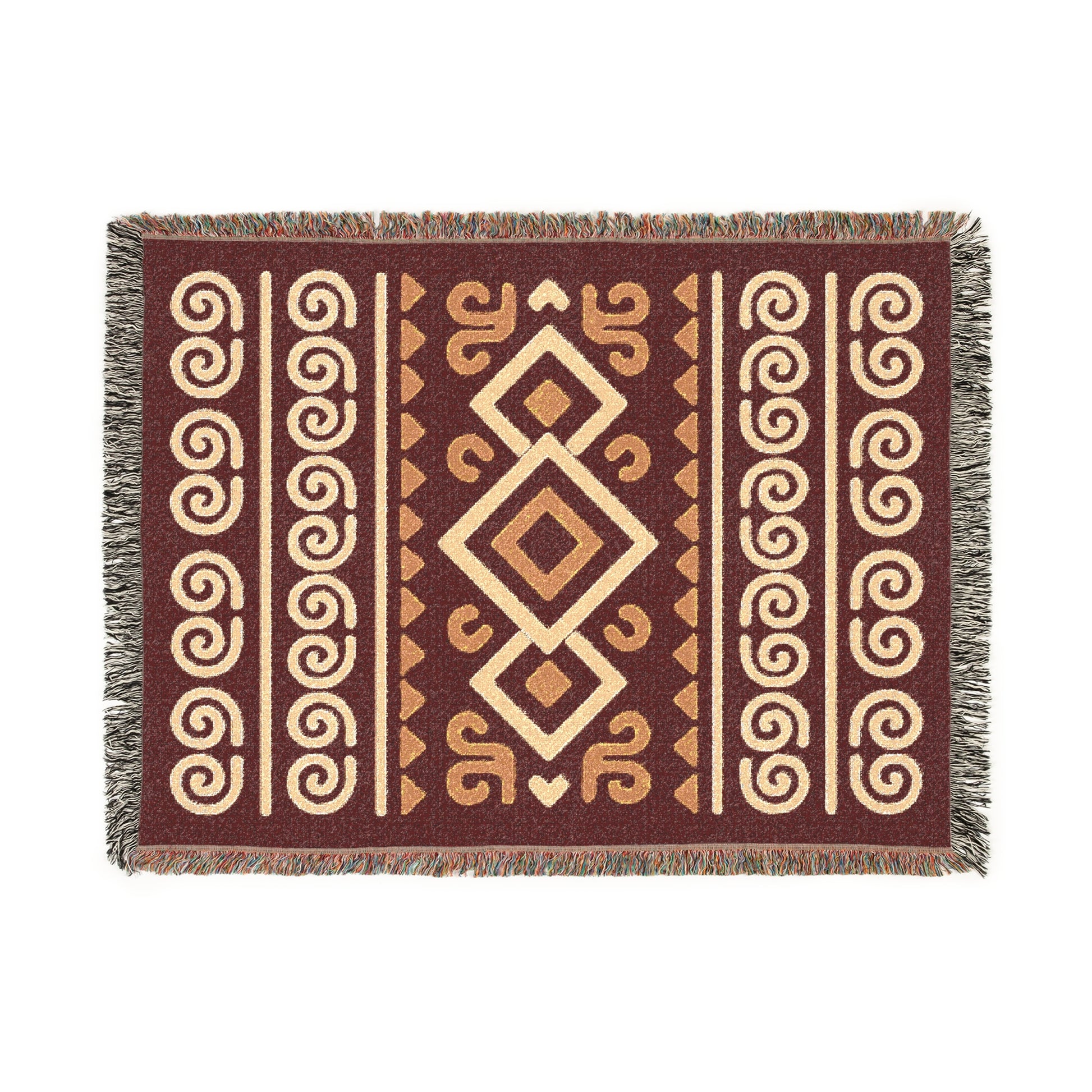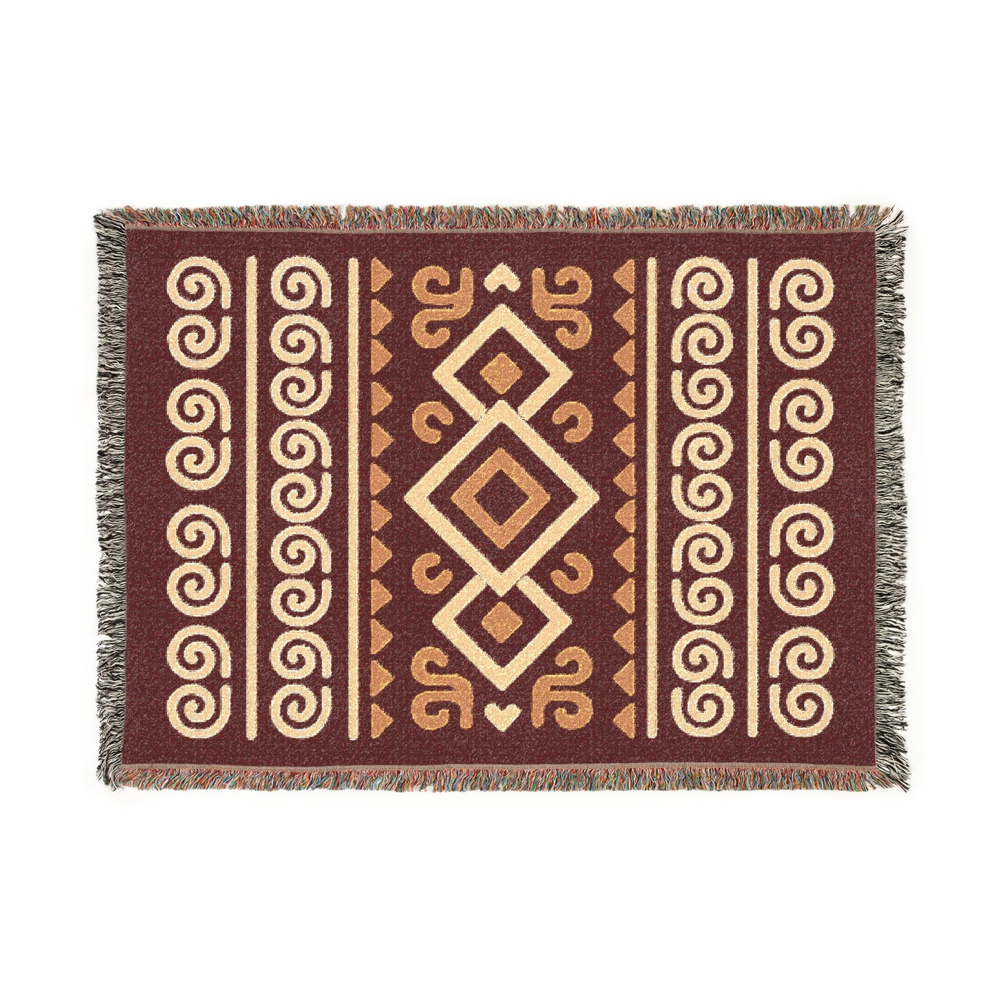 Inspired by ancient Illyrian tribal geometry, this woven cotton throw combines bold spirals, stepped diamonds, and rhythmic triangular motifs to create a warm, earthy boho aesthetic. The deep burgundy backdrop enriches the gold and cream patterns, giving the design a rich, timeless presence perfect for elevating sofas, beds, or reading nooks. Soft yet durable, it layers beautifully in both modern and rustic interiors. Expertly woven from premium cotton, it honors traditional craftsmanship while remaining fully machine-washable for effortless everyday care.
