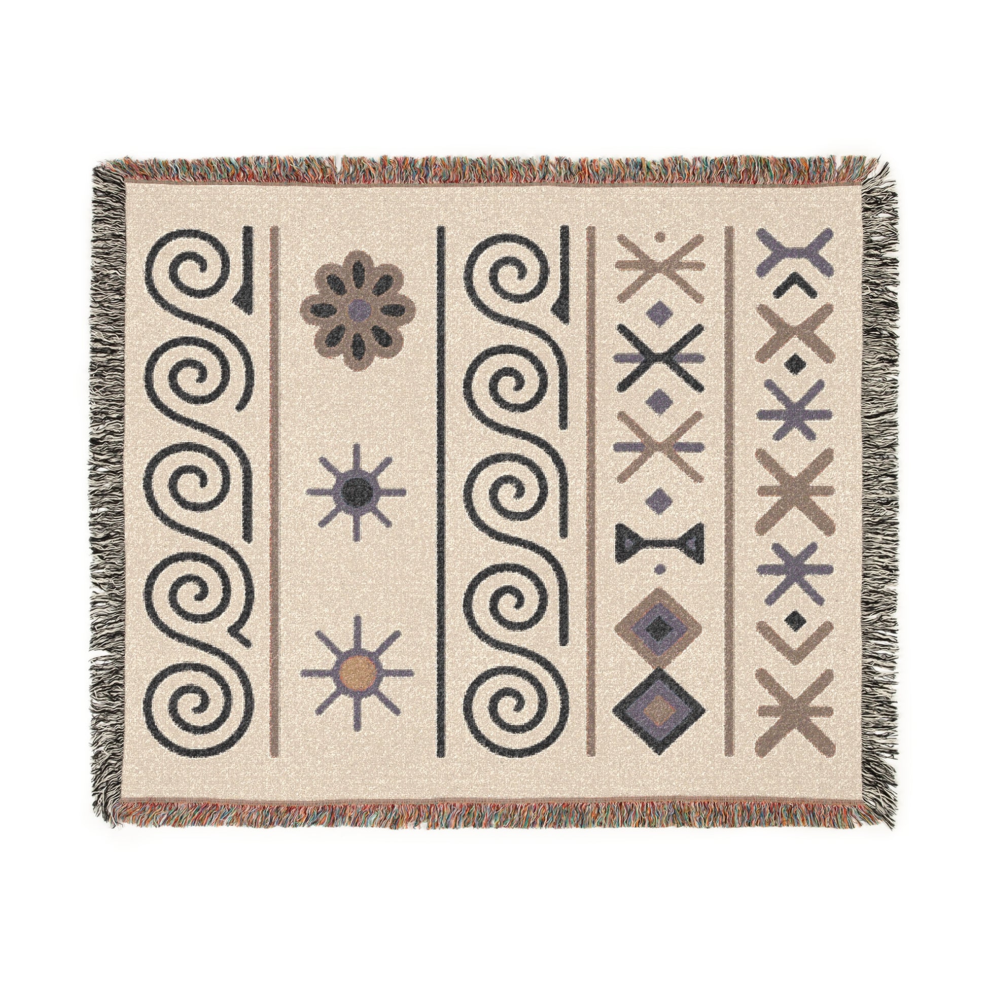 Inspired by ancient Illyrian folk motifs, this woven throw blends soft cream tones with charcoal, taupe, and warm brown accents in a beautifully layered design. Sunburst elements, floral rosettes, spiraling wave lines, and intricate geometric bands create a balanced boho aesthetic rooted in heritage craftsmanship. Soft, durable, and richly textured, it drapes effortlessly over sofas, beds, or reading chairs, adding warmth, earthiness, and cultural depth to any space. Expertly woven from premium cotton, it offers everyday comfort while remaining fully machine-washable for easy care.