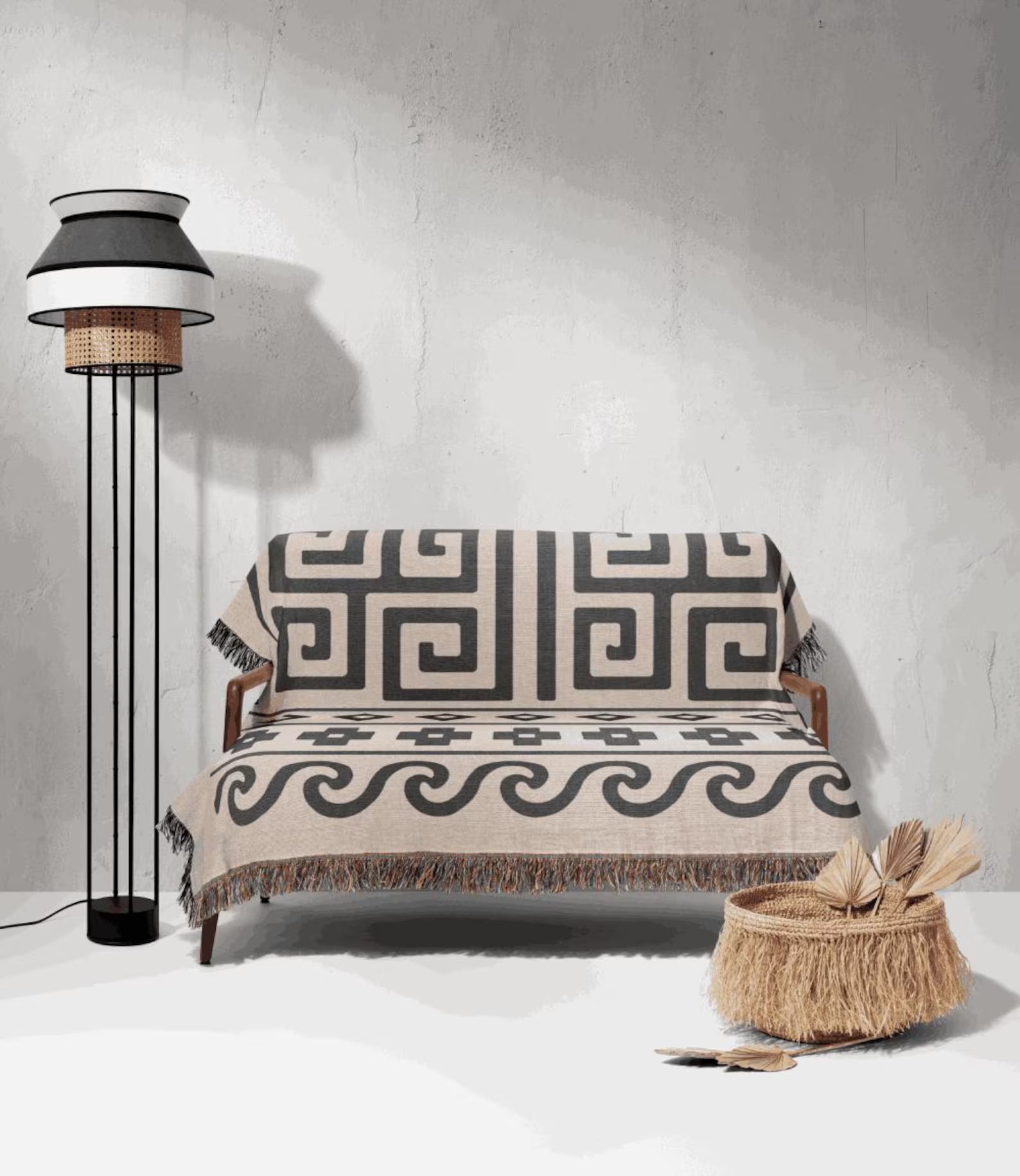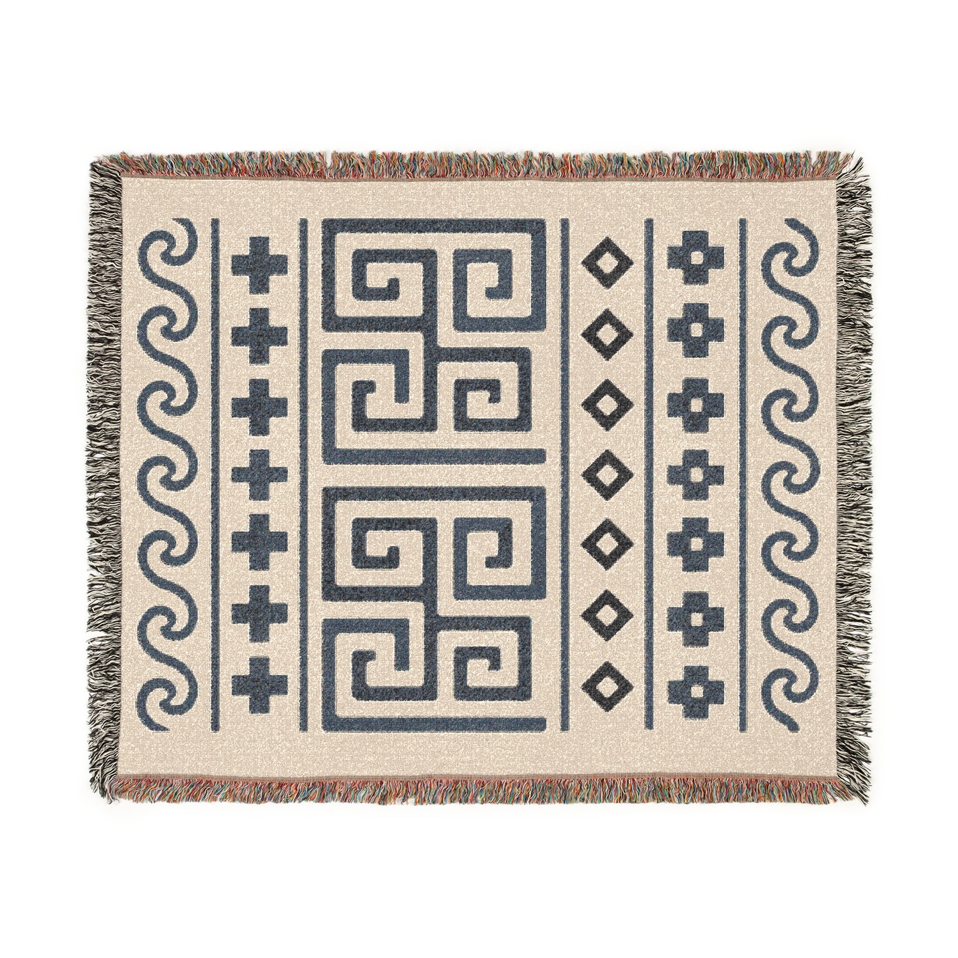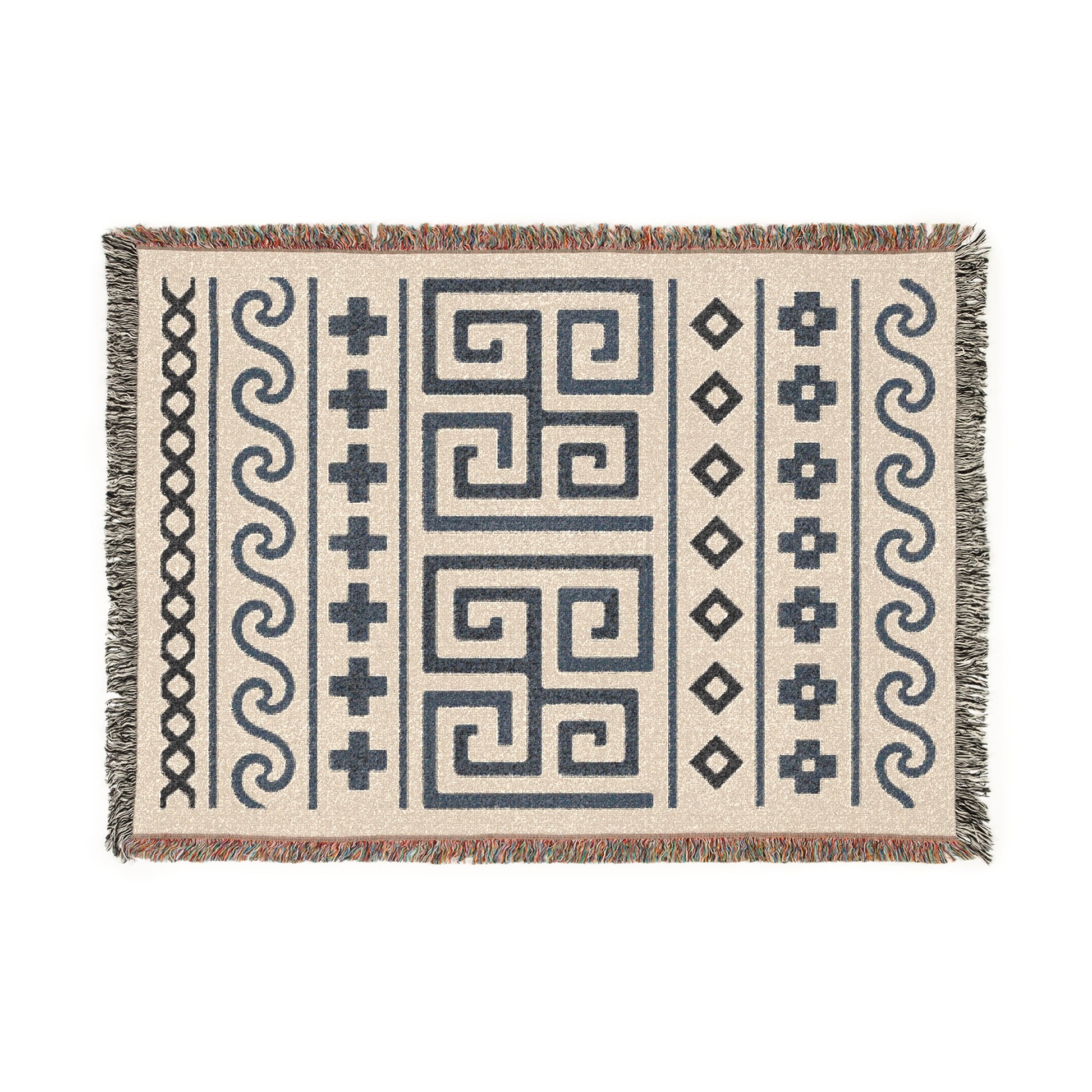 Inspired by ancient Illyrian geometric art, this woven throw features bold charcoal maze-like borders, repeating crosses, diamond accents, and flowing wave patterns set against a soft cream backdrop. The design blends structured geometry with organic movement, creating a striking boho aesthetic rooted in cultural heritage. Soft, durable, and richly textured, it drapes beautifully over sofas, beds, or reading chairs, adding warmth and visual depth to any space. Expertly woven from premium cotton, it offers everyday comfort and remains fully machine-washable for effortless care.