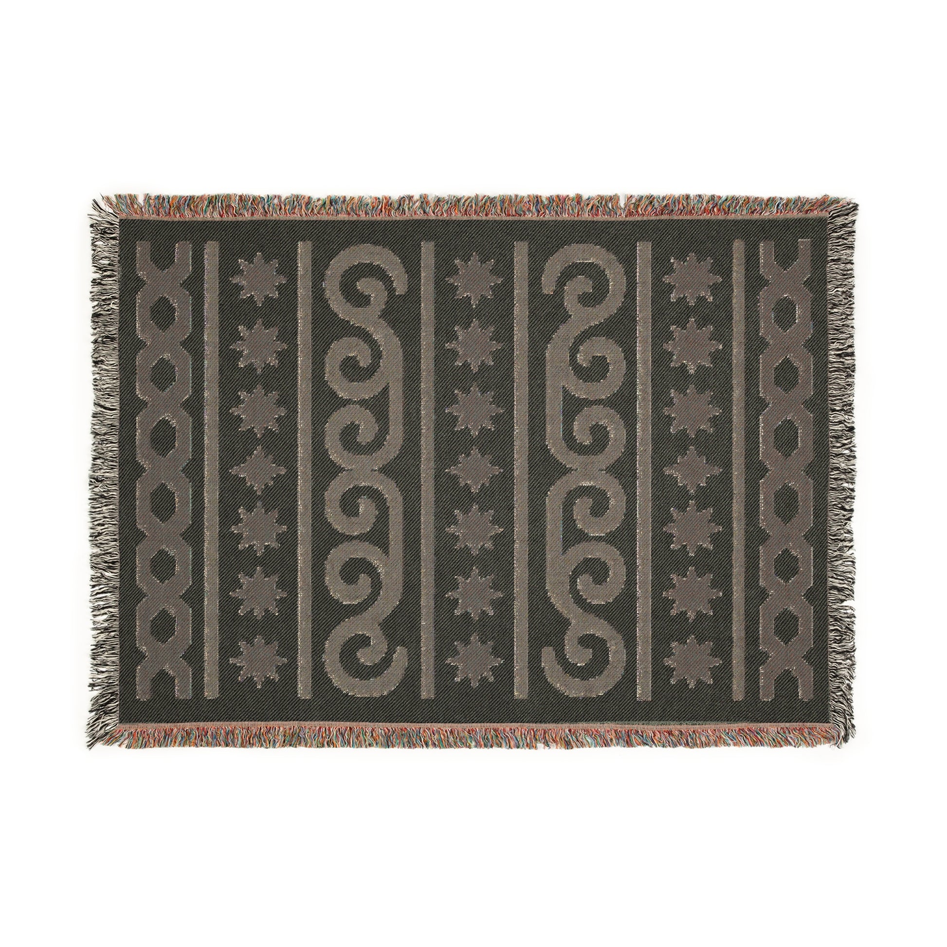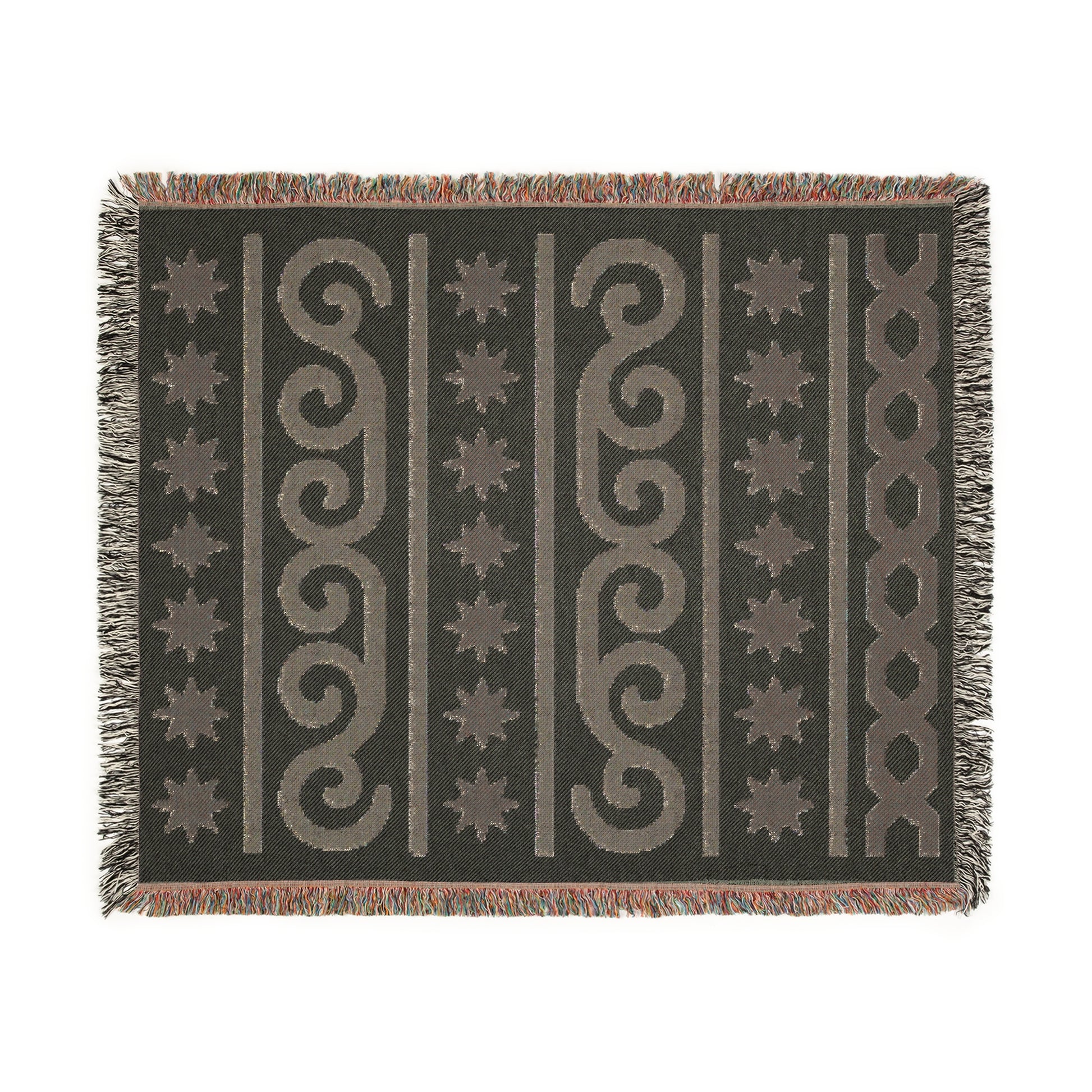 Inspired by ancient Illyrian folk motifs, this woven throw features charcoal starbursts, geometric border bands, and flowing wave patterns arranged across a warm cream backdrop. The repeating, rhythmic layout creates a refined boho aesthetic that blends heritage geometry with modern minimalism. Soft, durable, and richly textured, it layers beautifully over sofas, beds, or reading chairs, adding understated warmth and cultural depth to any space. Expertly woven from premium cotton, it offers everyday comfort and remains fully machine-washable for effortless care.