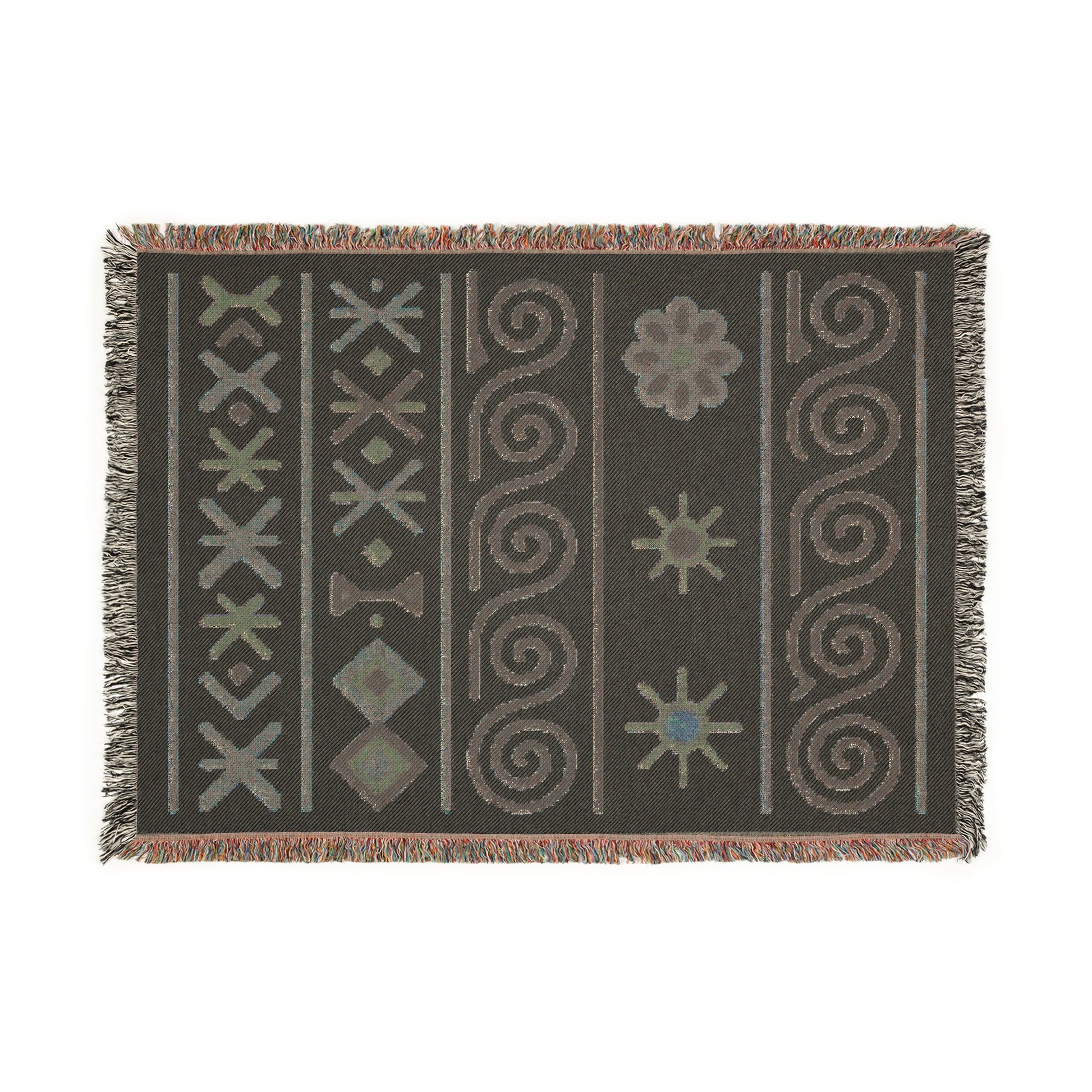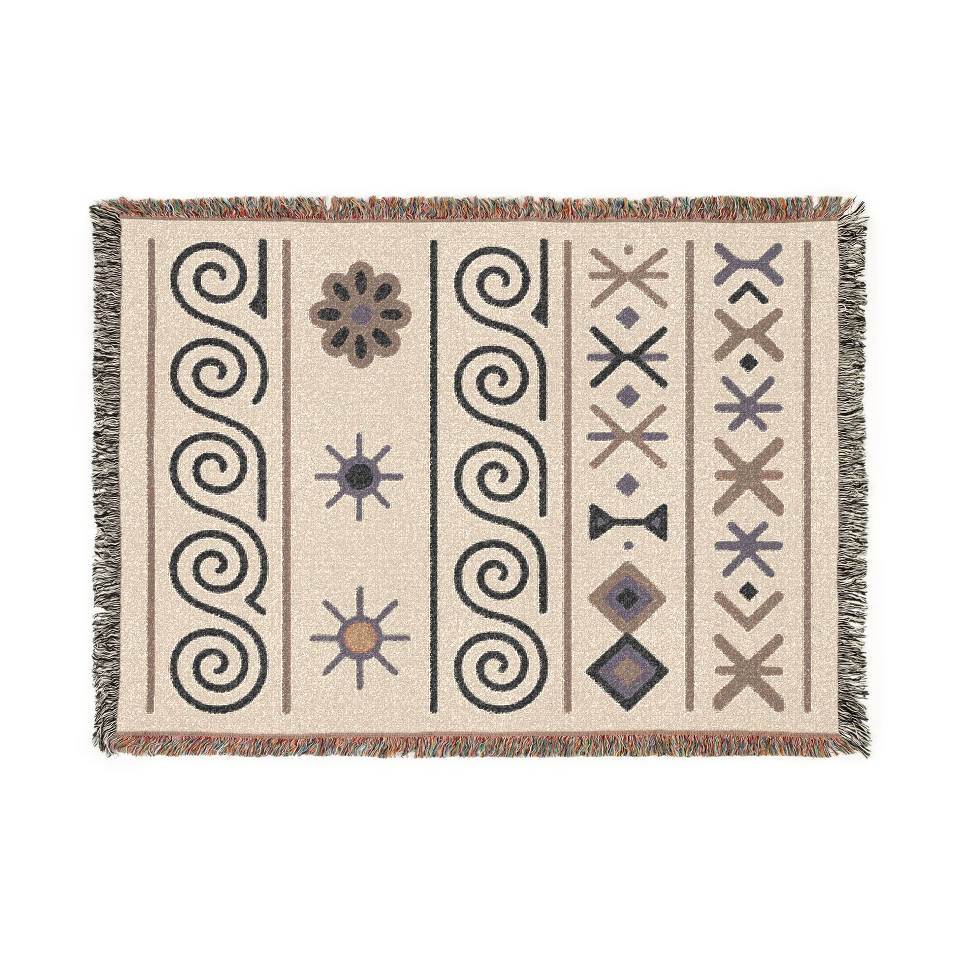 Inspired by ancient Illyrian folk motifs, this woven throw blends soft cream tones with charcoal, taupe, and warm brown accents in a beautifully layered design. Sunburst elements, floral rosettes, spiraling wave lines, and intricate geometric bands create a balanced boho aesthetic rooted in heritage craftsmanship. Soft, durable, and richly textured, it drapes effortlessly over sofas, beds, or reading chairs, adding warmth, earthiness, and cultural depth to any space. Expertly woven from premium cotton, it offers everyday comfort while remaining fully machine-washable for easy care.