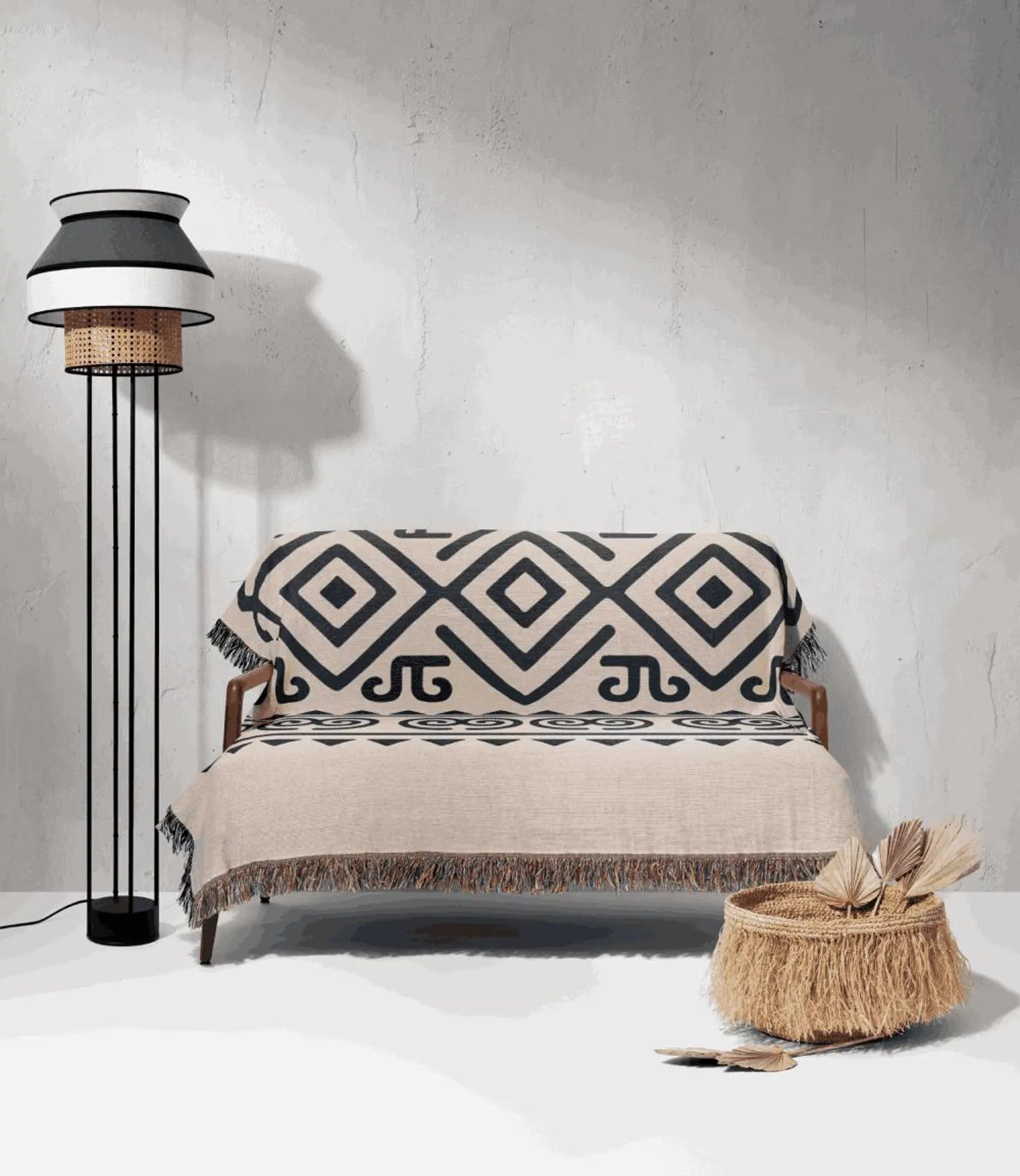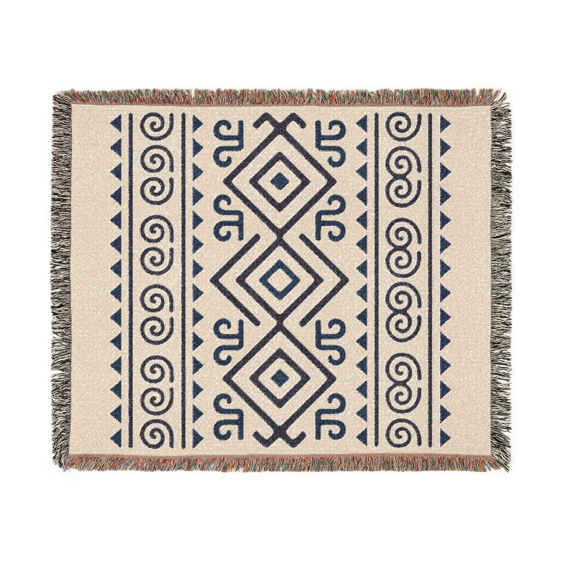 Inspired by ancient Illyrian geometric artistry, this woven throw pairs a warm cream backdrop with deep navy diamonds, spirals, and stepped border patterns for a bold yet balanced boho aesthetic. The central diamond chain, framed by rhythmic scroll motifs and triangular accents, creates a striking heritage-inspired design that brings texture, storytelling, and visual depth to any space. Soft, durable, and beautifully woven from premium cotton, it drapes effortlessly across sofas, beds, or reading nooks. Crafted for everyday comfort, it remains fully machine-washable for easy care while celebrating timeless craftsmanship.