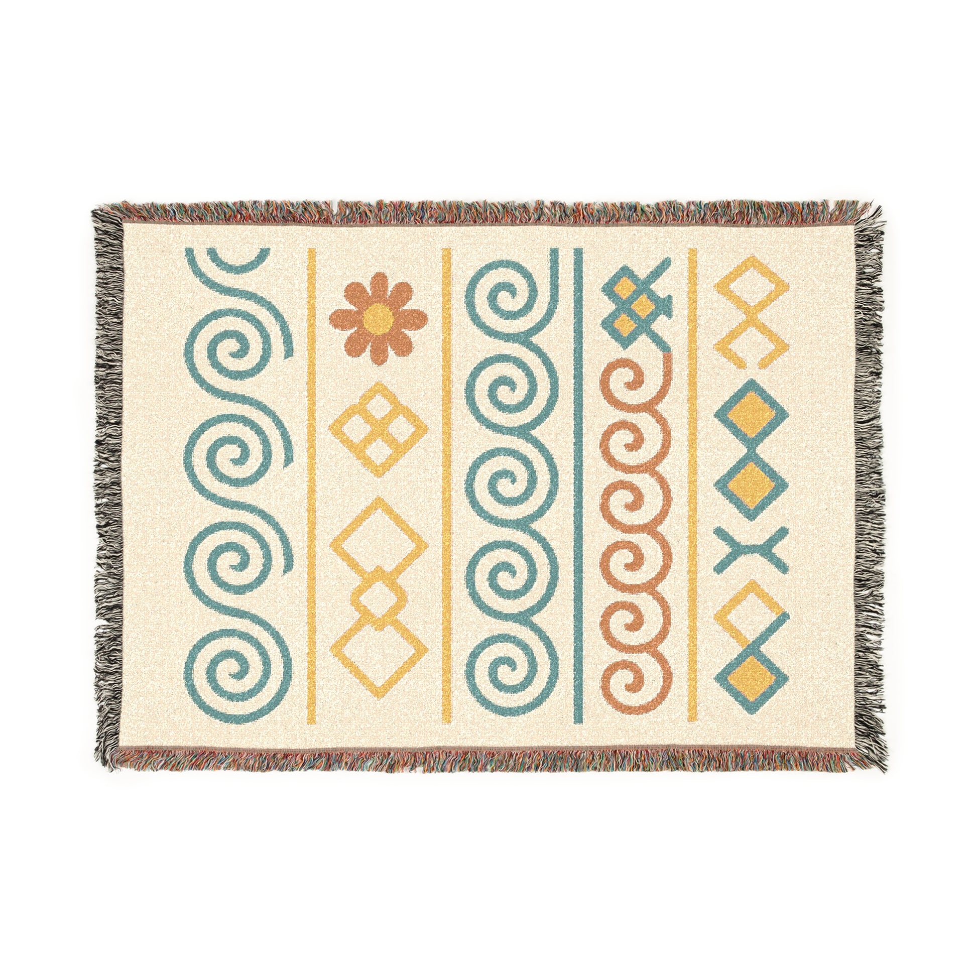 Inspired by ancient Illyrian spirals and traditional folk symbols, this woven cotton throw showcases a joyful mix of geometric motifs—crosses, triangles, stars, florals, and flowing wave patterns. The soft cream background highlights the teal, golden yellow, and warm orange accents, creating a bright, uplifting boho aesthetic that brings warmth and personality to any space. Soft yet durable, it layers beautifully over sofas, beds, or outdoor seating. Expertly woven from premium cotton, it honors heritage craftsmanship while remaining fully machine-washable for everyday comfort and care.