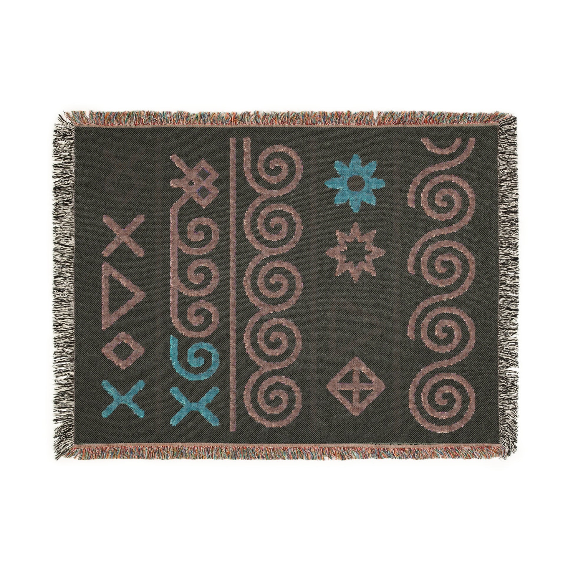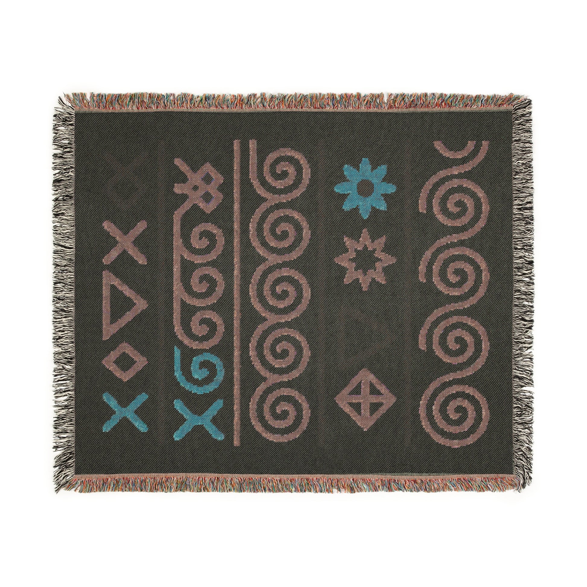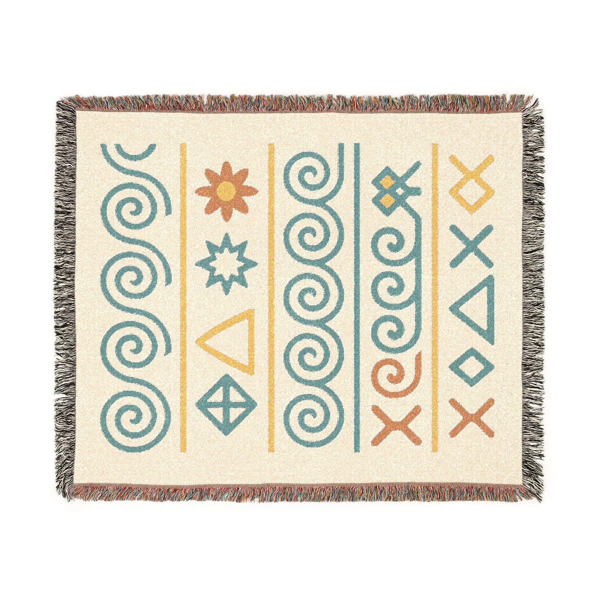 Cream, Teal & Golden Boho Tribal Symbol Woven Throw Blanket - Illyrian Weave
