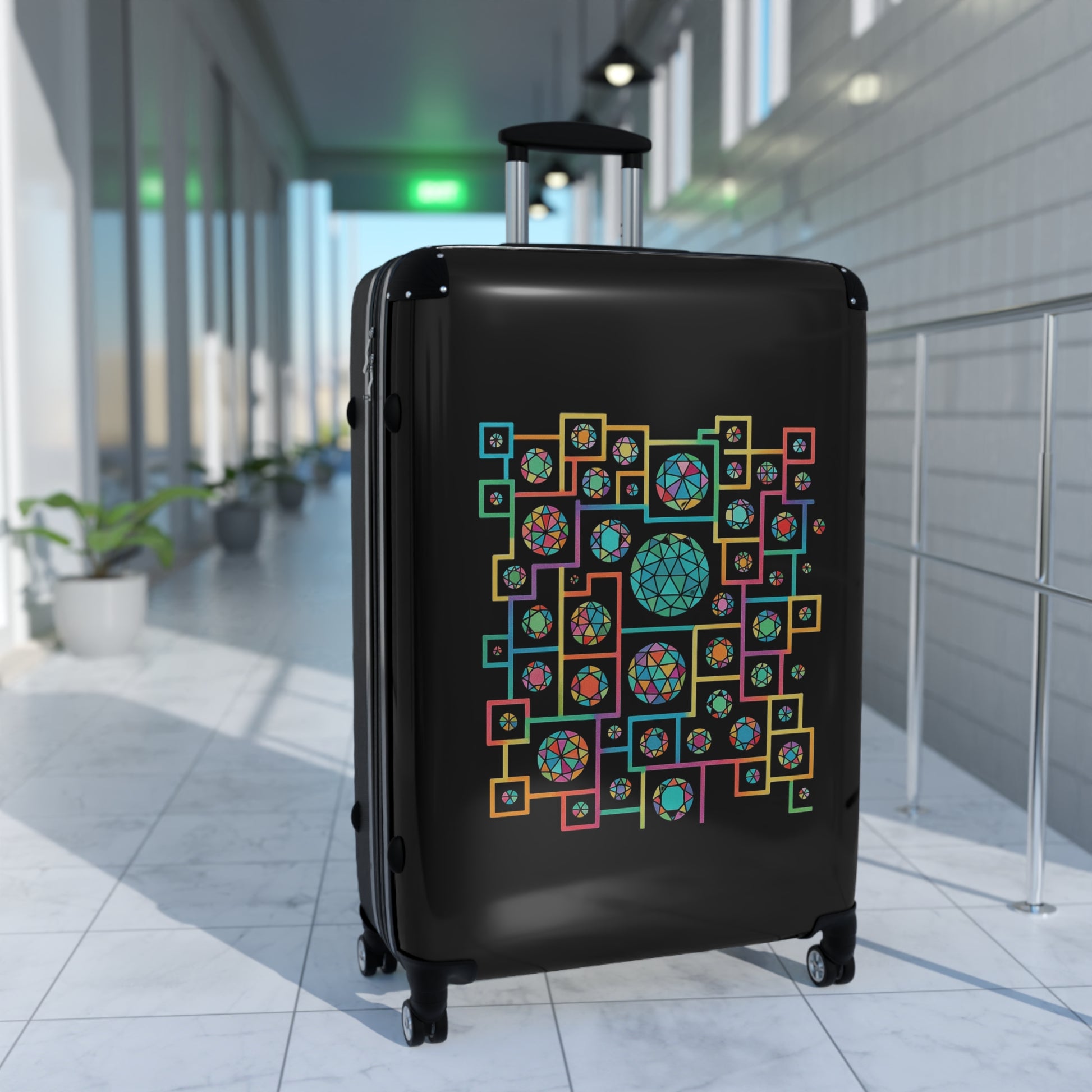 Travel boldly and meaningfully with this Geometric Heritage Carry-On Suitcase, designed with a vibrant and symbolic pattern inspired by the plis-shaped domes of the National Library of Kosovo. The geometric arrangement of circles and squares on a sleek black background is a tribute to Albanian identity, tradition, and creative resilience—making this more than just luggage, it’s a statement piece. Travel in style with this vibrant suitcase, designed to turn heads at airports and train stations alike. Its eye-catching colors and unique designs not only add a personal touch but also make it easy to spot among luggage. Suitable for frequent travelers, vacationers, or anyone who wants to carry their essentials with flair, this suitcase is perfect for weekend getaways, holiday trips, or business travels. The built-in lock offers peace of mind, while the spacious design and handy inner pockets make organizing a breeze. Whether you're jetting off for a family vacation or a solo adventure, this suitcase is your reliable companion to help you embrace life's journeys. Product features - Durable 100% polycarbonate front for impact resistance - Lightweight ABS back that withstands temperature changes - Vibrant colors achieved through advanced printing techniques - Extended storage option for larger packing demands - Effortless maneuverability with 360-degree swivel wheels Care instructions - Before cleaning the bag, remove all the items from the bag. Suggested to pretreat visible stains with stain remover. Mix warm water with laundry detergent and clean the bag with terry washcloth or soft bristle brush. Let the bag air dry.