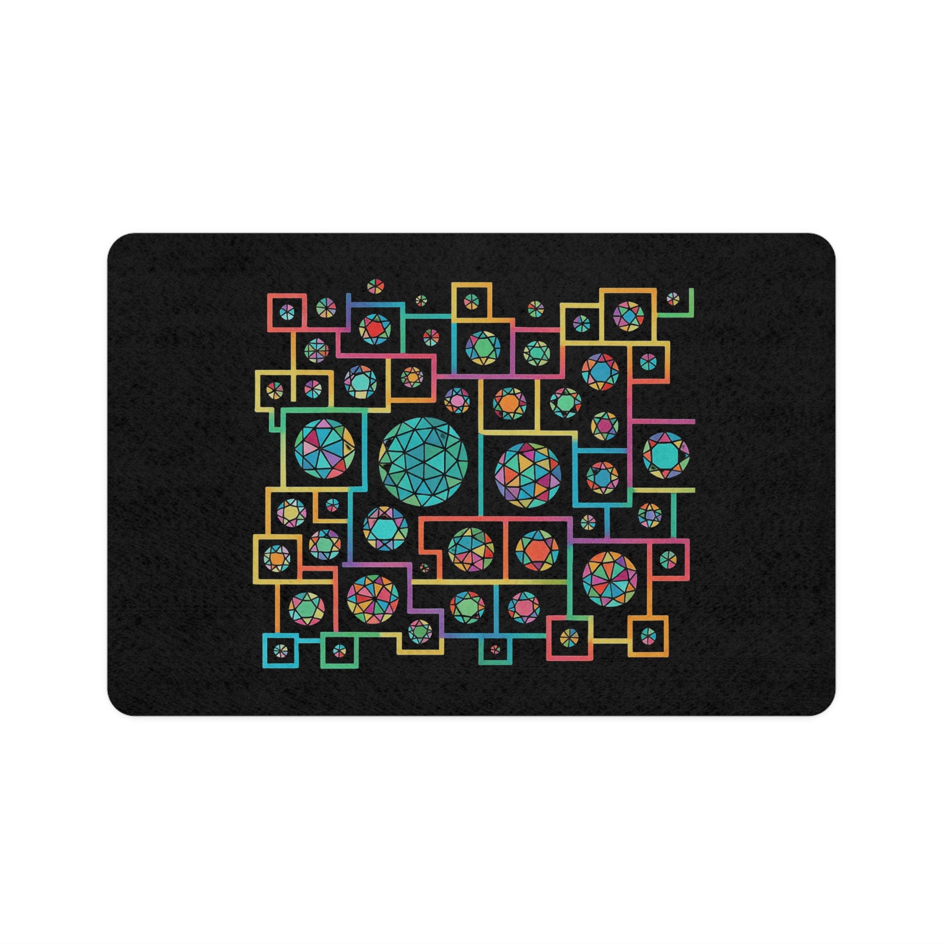 This Geometric Heritage Pet Food Mat combines practical functionality with cultural artistry, making it a visually compelling addition to any pet-friendly space. The design draws direct inspiration from the plis-shaped domes of the National Library of Kosovo, rendered here in a vibrant pattern of interlocking circles and squares. Set against a matte black background, the composition integrates vivid hues of turquoise, crimson, gold, and violet—merging heritage symbolism with modern aesthetic appeal.