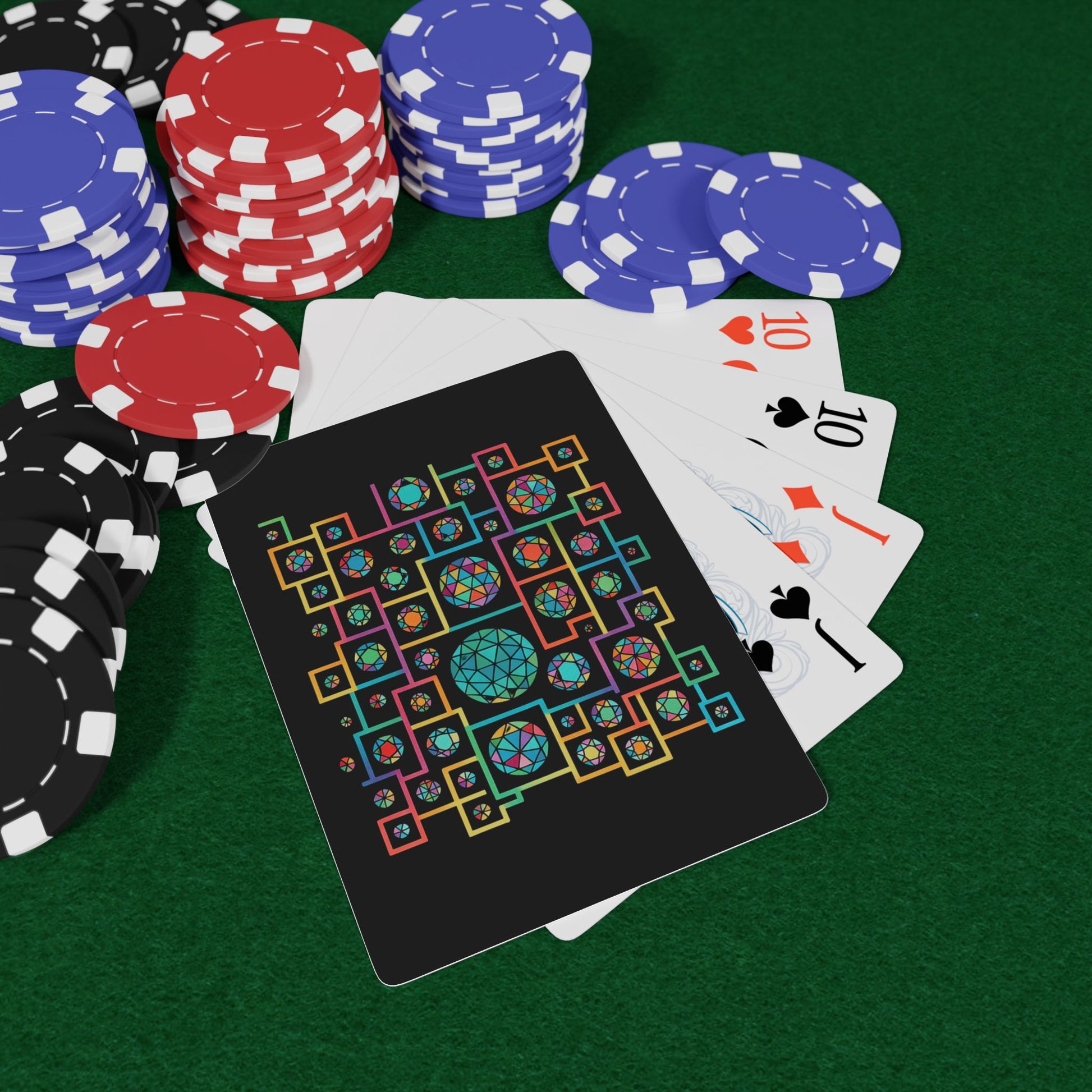 Elevate your game night with these striking Geometric Heritage Playing Cards, featuring a bold and meaningful design on the back of every card. The vibrant pattern of interlocking circles and squares is inspired by the plis-shaped domes of the National Library of Kosovo, celebrating cultural identity, intellect, and creativity.