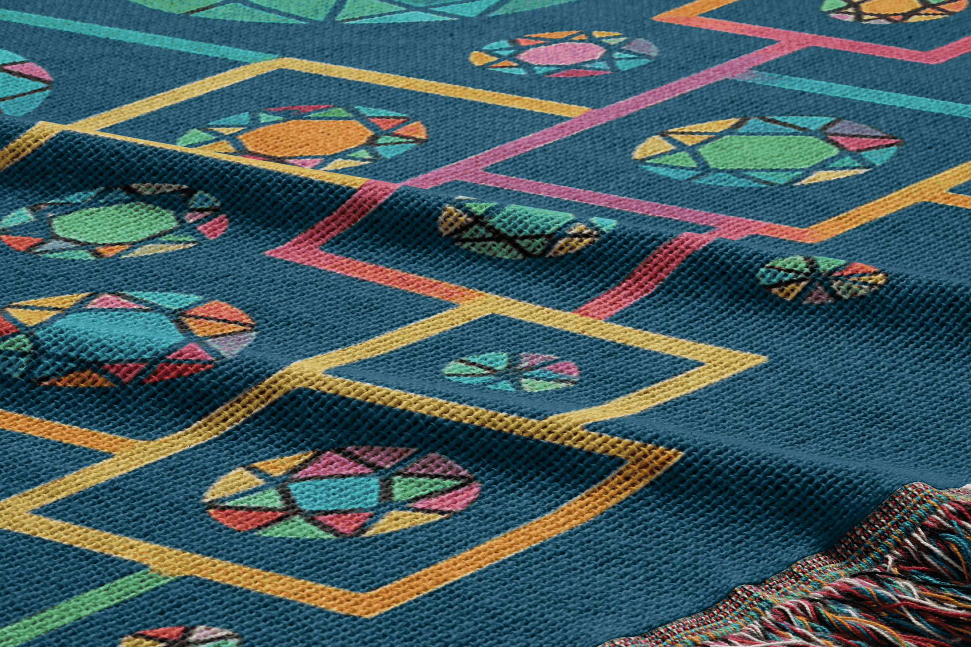 Bring bold color and cultural elegance into your space with this Geometric Heritage Woven Throw Blanket. Featuring vibrant, interlocking circular and square patterns in pink, gold, turquoise, and green, the design is inspired by the iconic architecture of the National Library of Kosovo. The rich teal background adds a modern, calming touch.