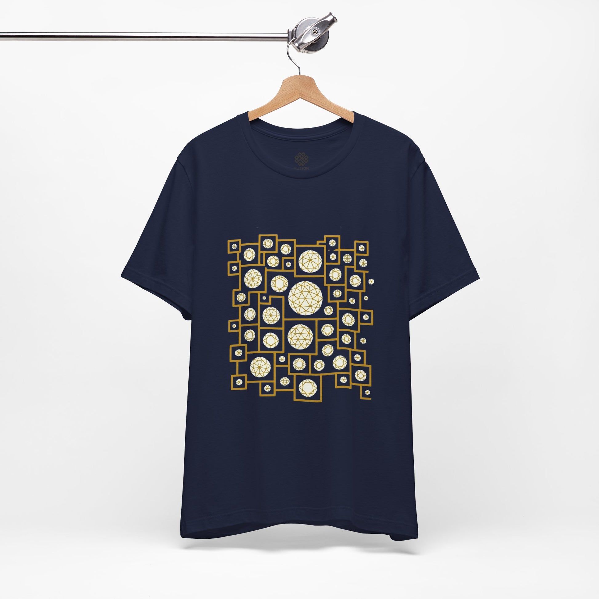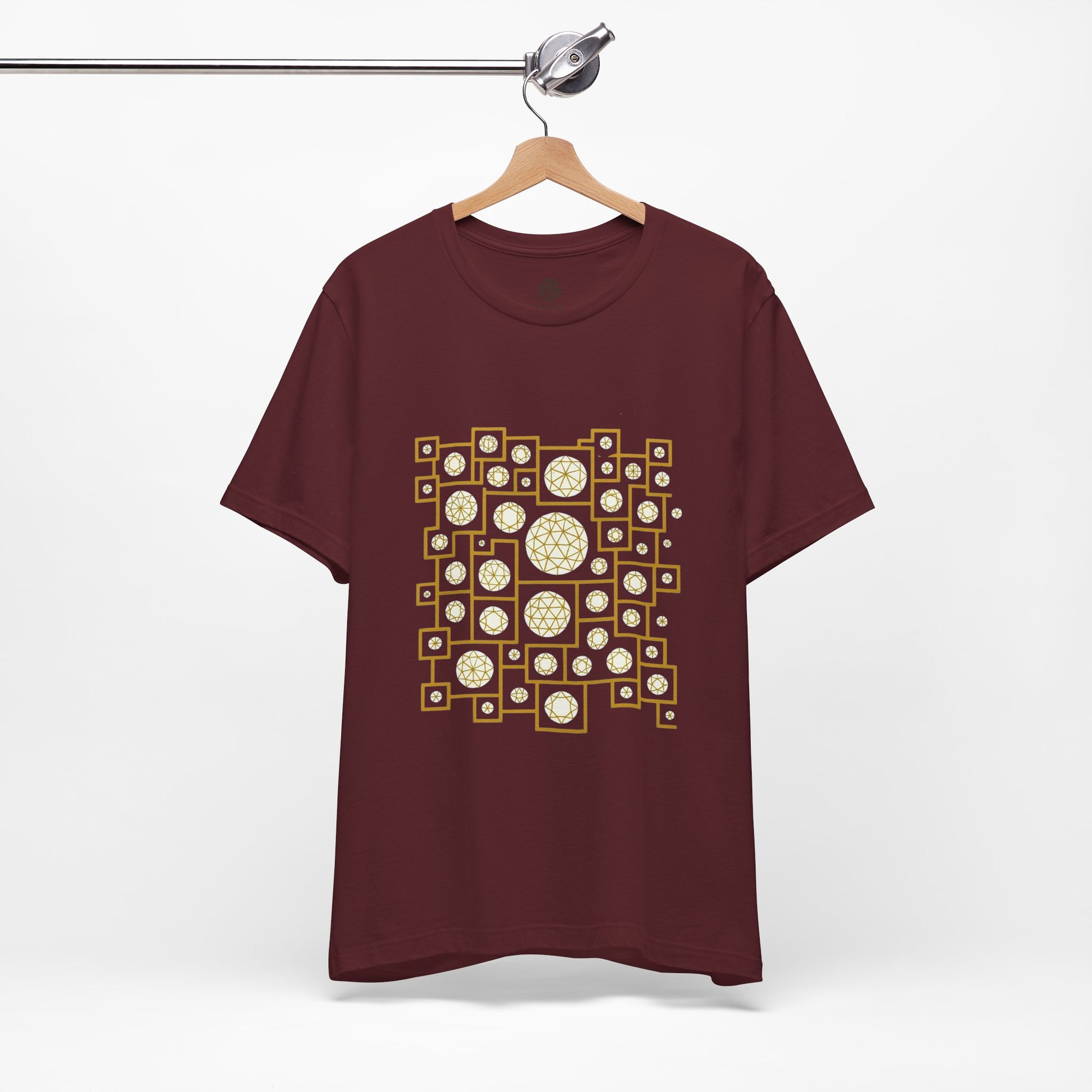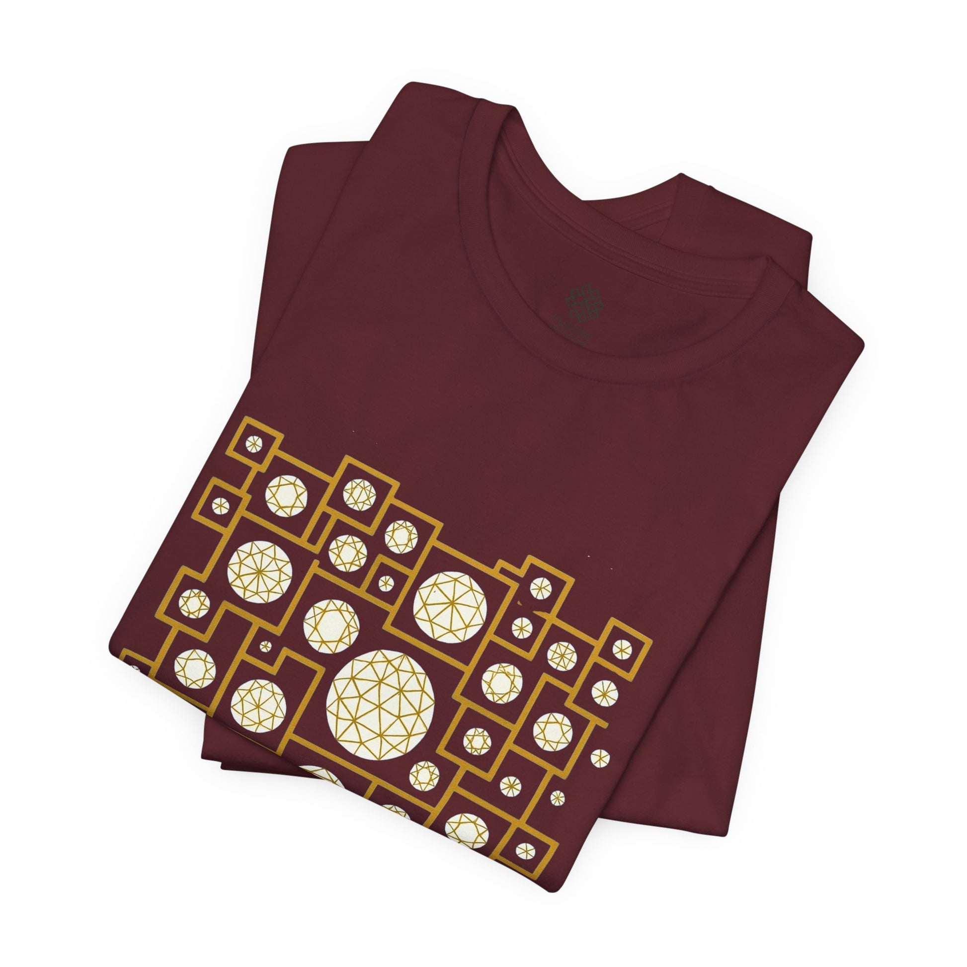 A national library of Kosovo and geometric design T-shirt that exudes an artistic and cultural vibe. Perfect for those who appreciate unique and meaningful prints. Suitable for casual wear or as a statement piece for art enthusiasts.