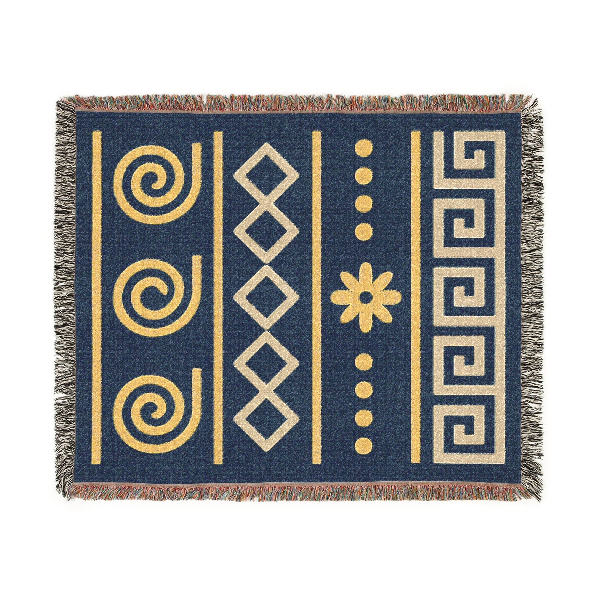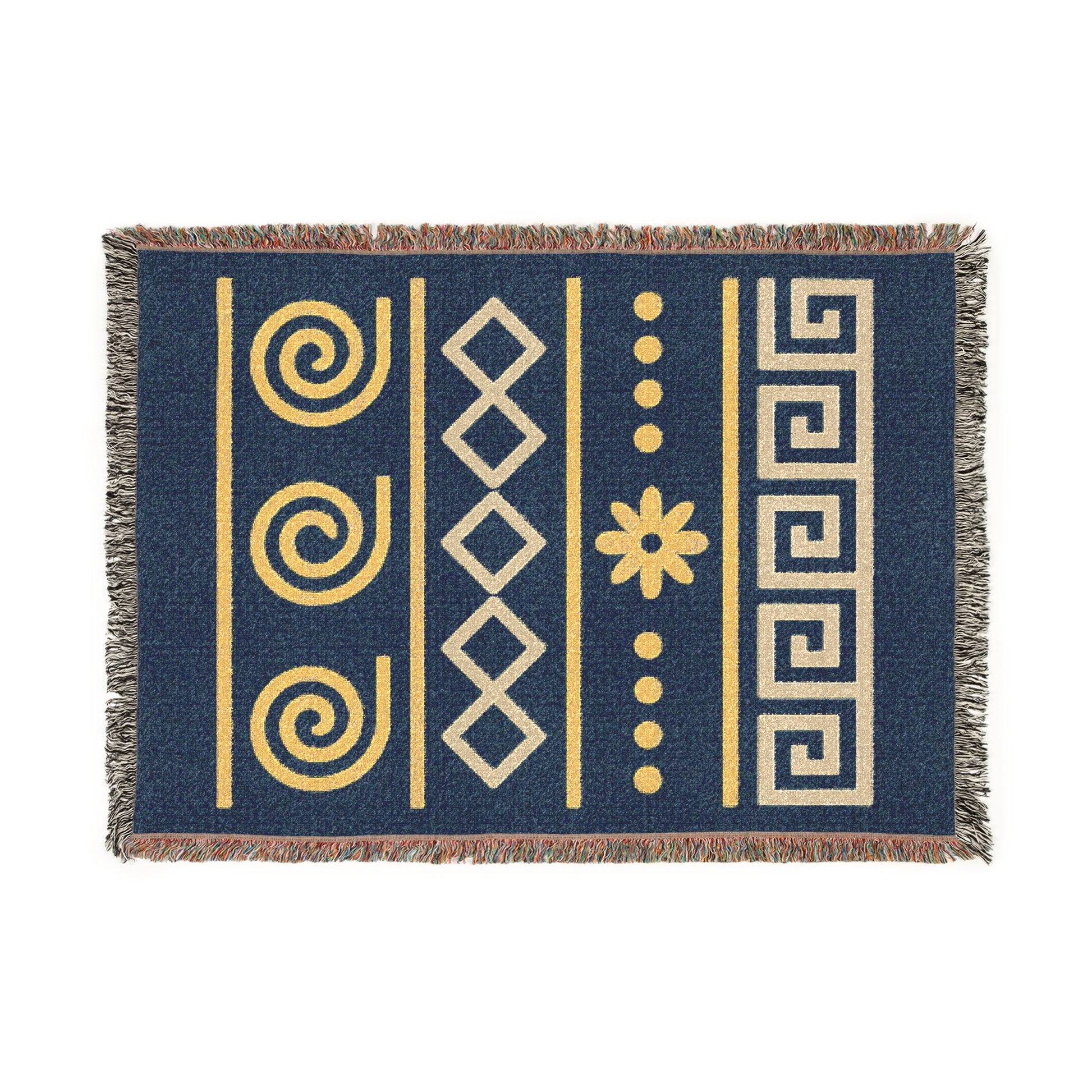 Inspired by ancient Illyrian sun and spiral motifs, this woven cotton throw radiates harmony and warmth through its geometric rhythm of spirals, diamonds, and floral symbols. The golden ochre design set against a deep blue background evokes both coastal serenity and timeless artistry. Soft yet durable, this boho-inspired piece layers beautifully on your sofa, bed, or outdoor space. Expertly woven from premium cotton, it embodies craftsmanship and heritage while remaining machine-washable for easy care.