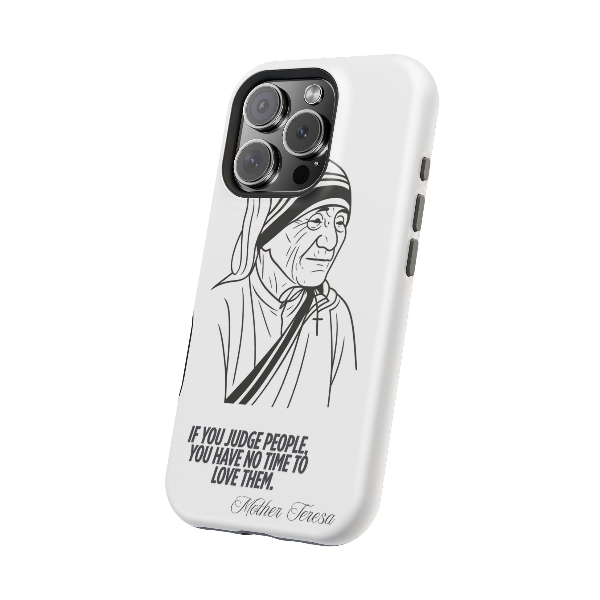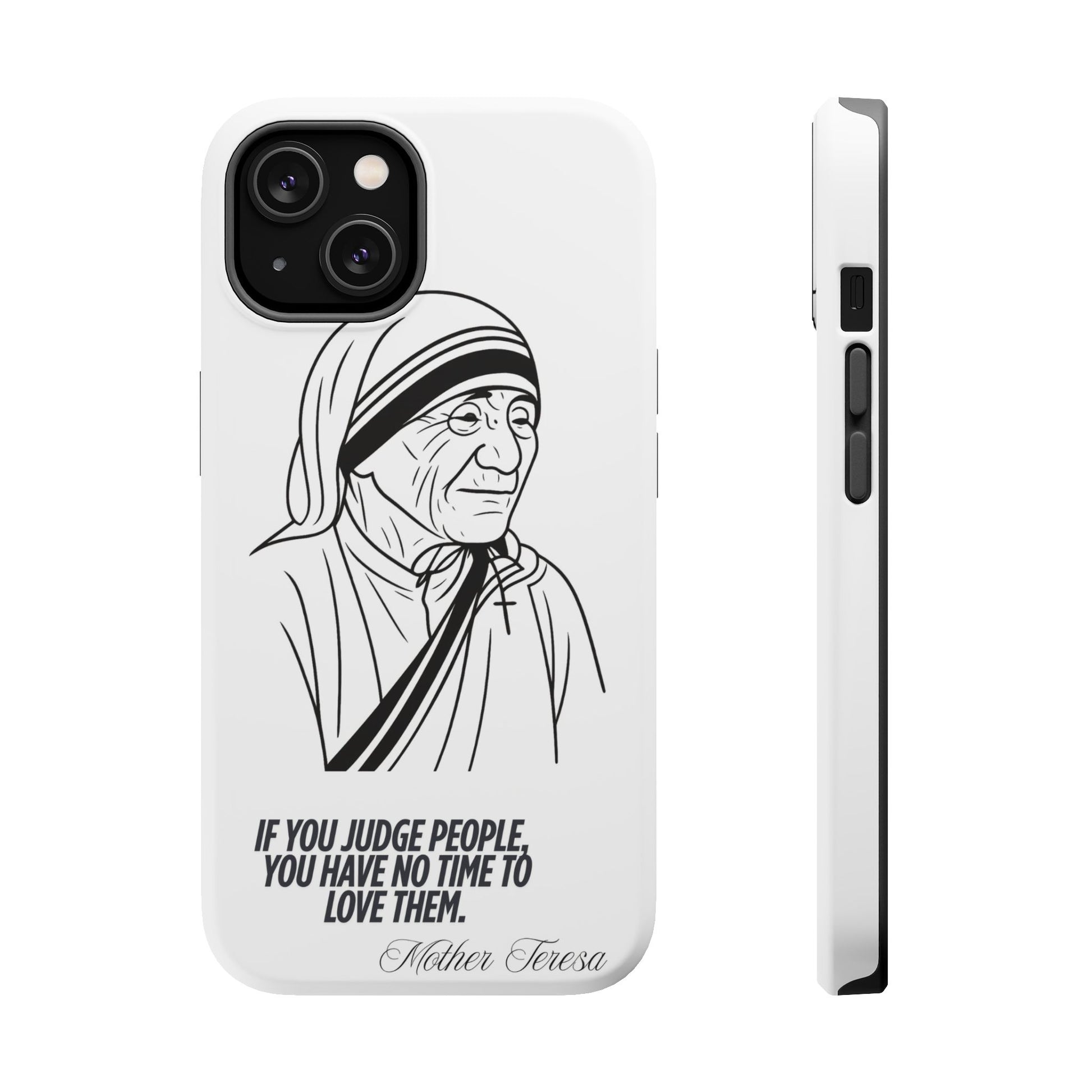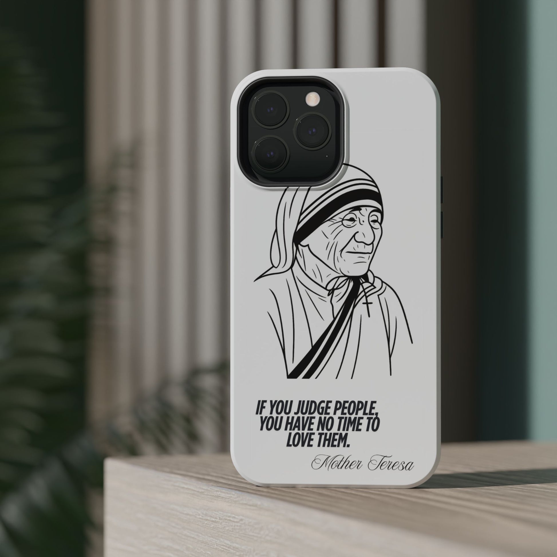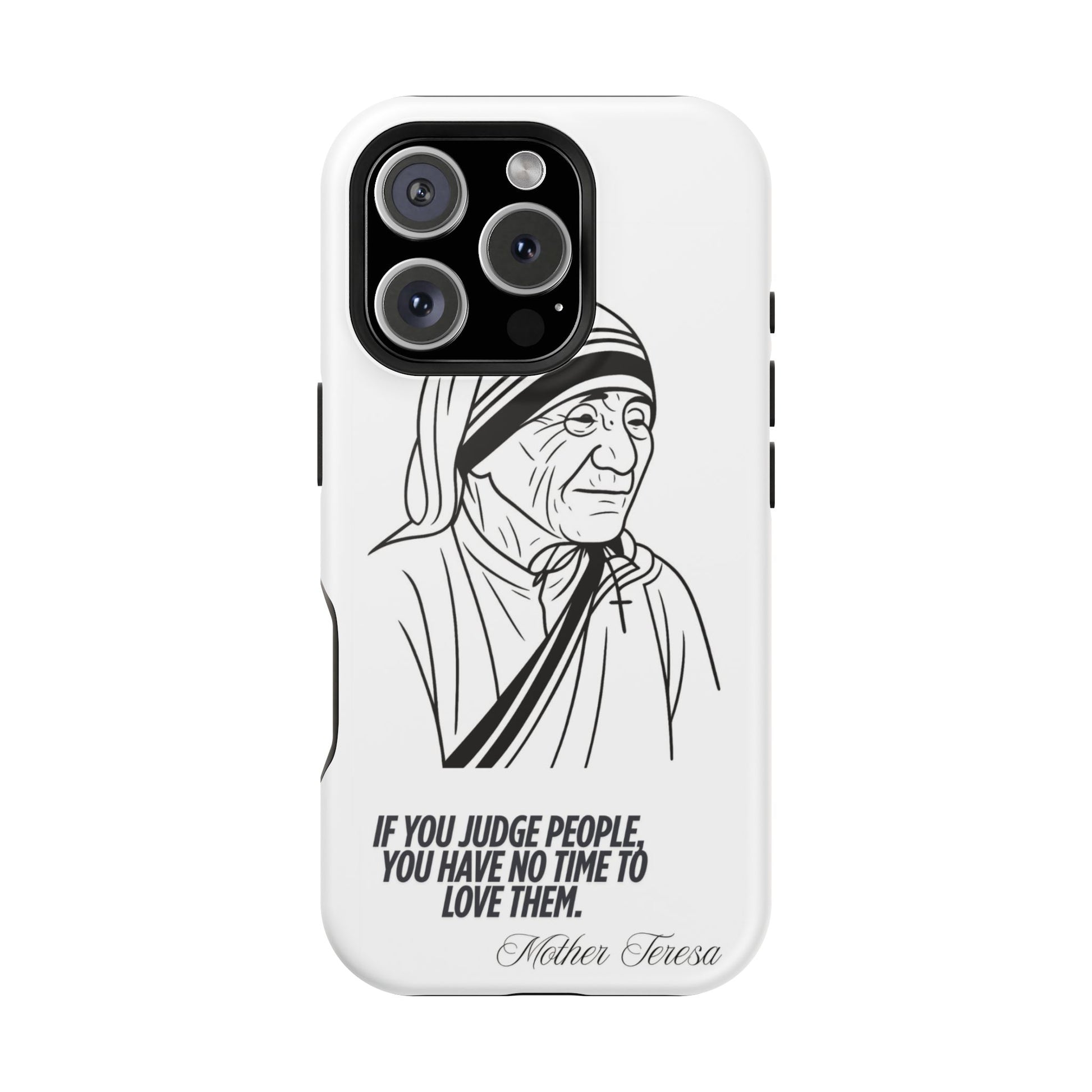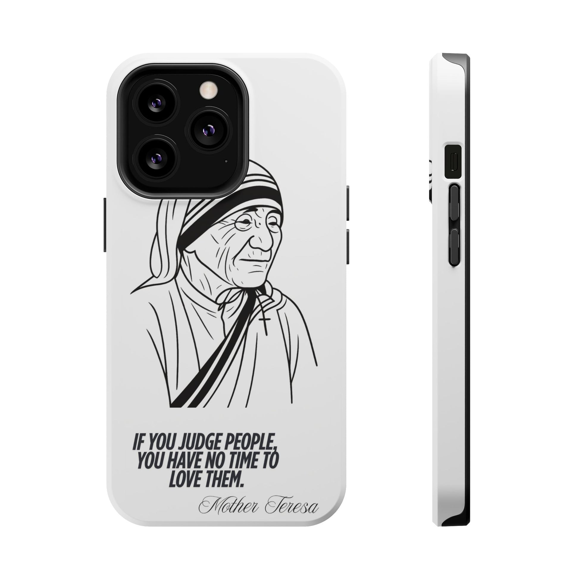 Elevate your iPhone's style while carrying a powerful message with our exclusive Mother Teresa iPhone case. Designed for models iPhone 13 to 16, this case features the inspirational quote: "If you judge people, you have no time to love them."
