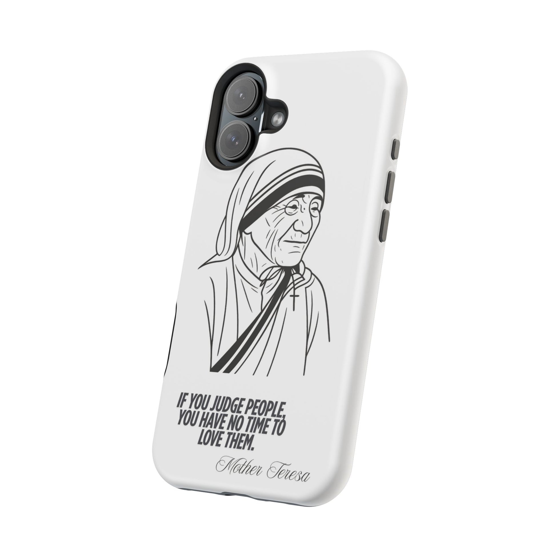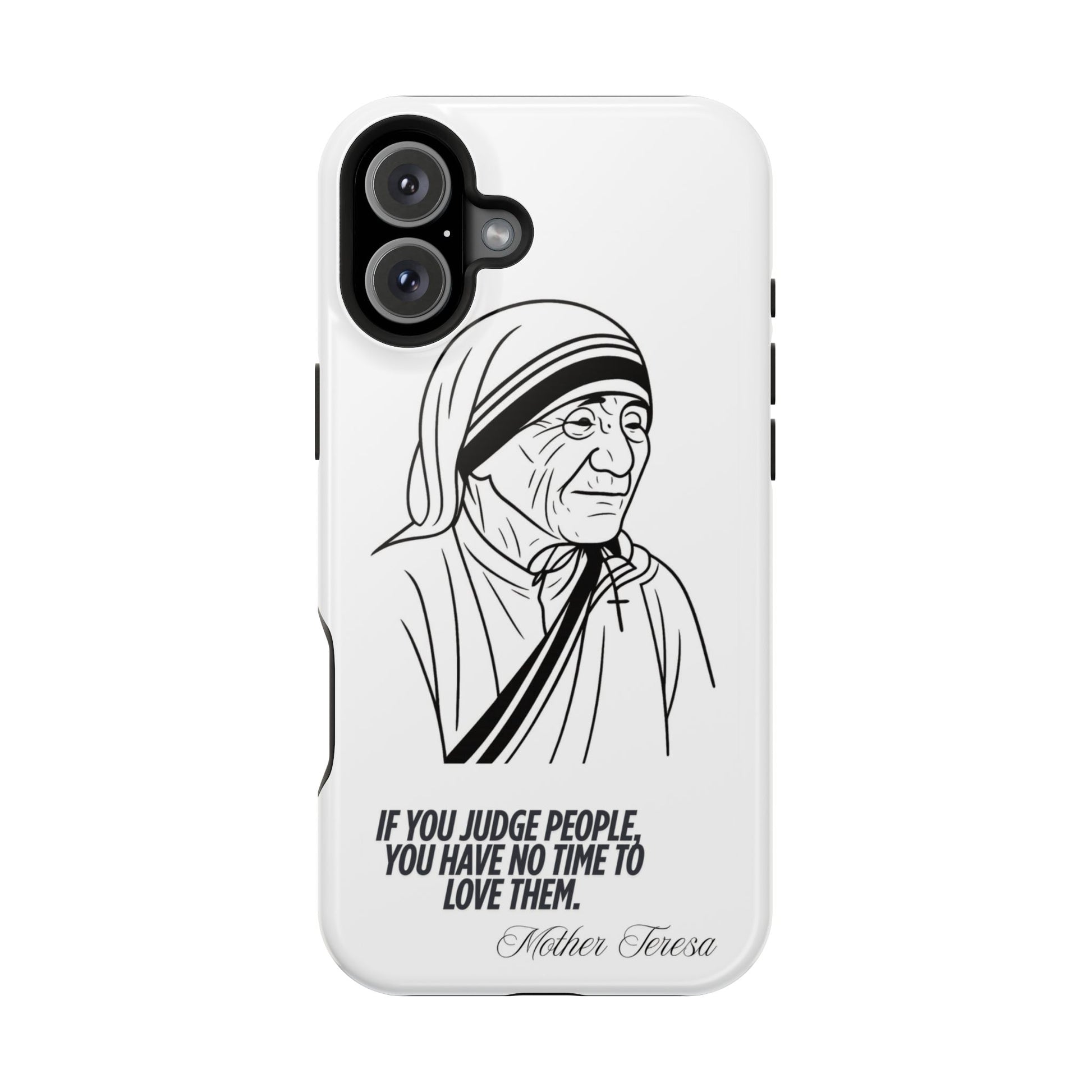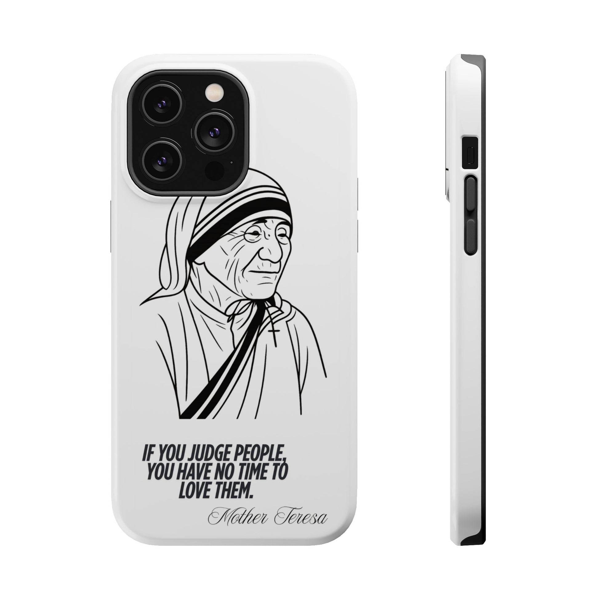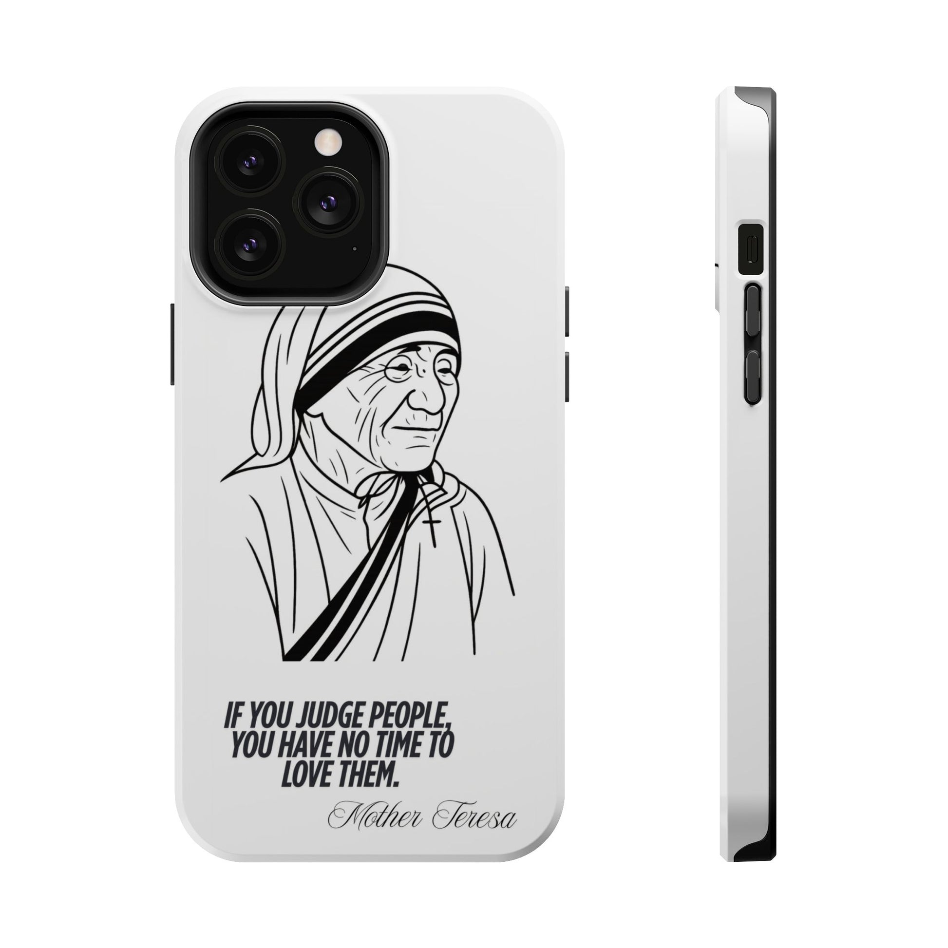 Elevate your iPhone's style while carrying a powerful message with our exclusive Mother Teresa iPhone case. Designed for models iPhone 13 to 16, this case features the inspirational quote: "If you judge people, you have no time to love them."