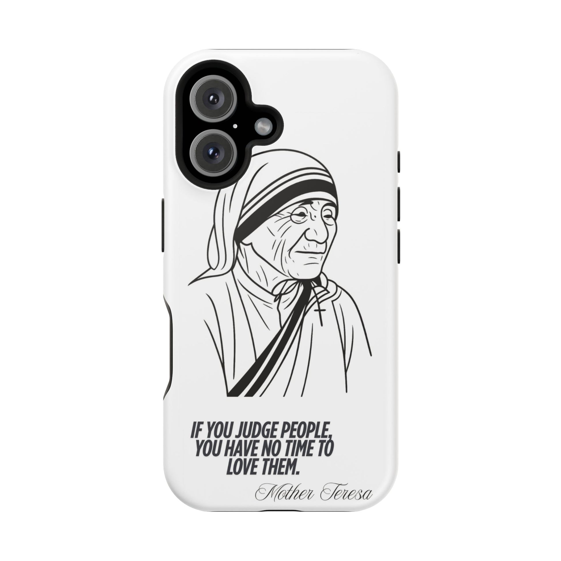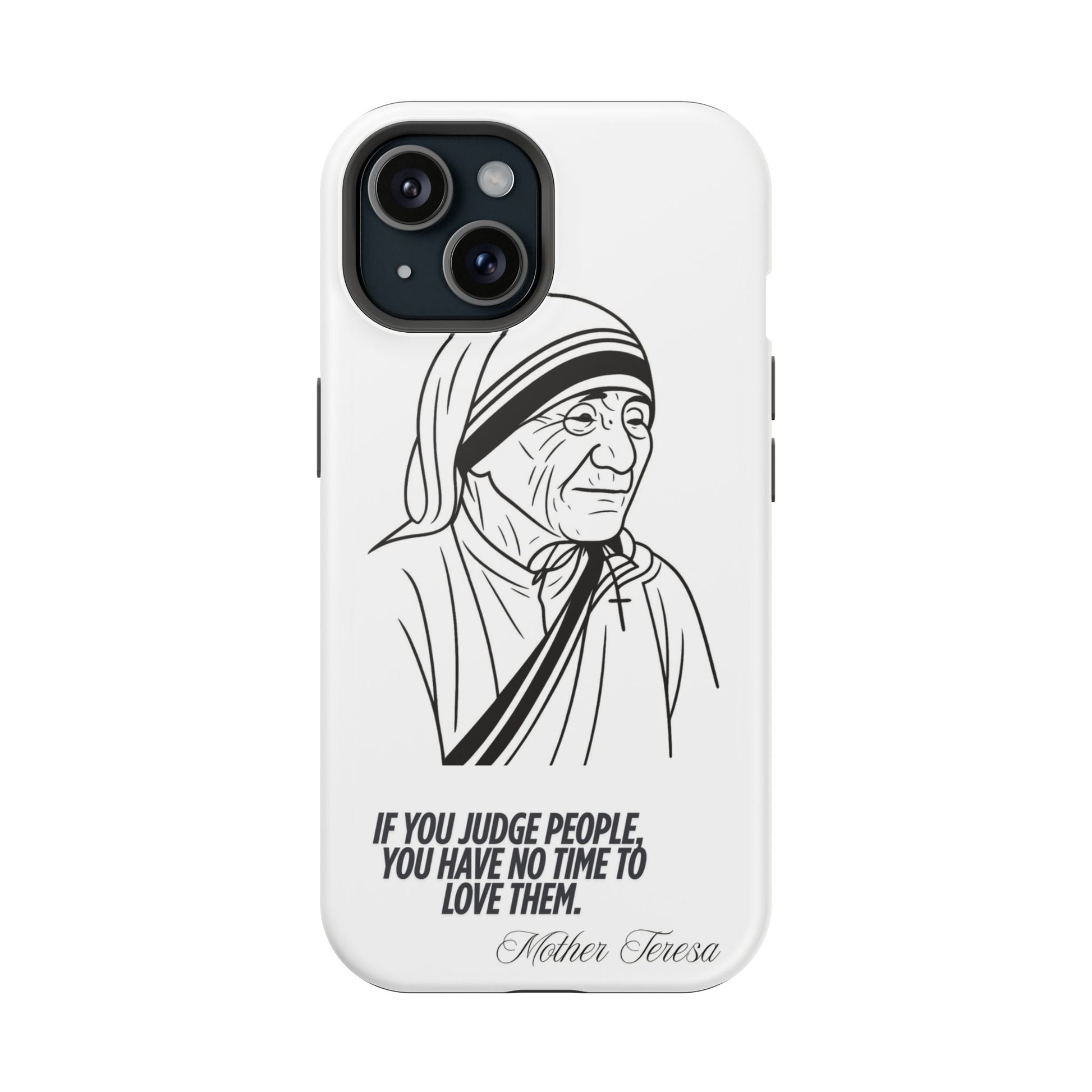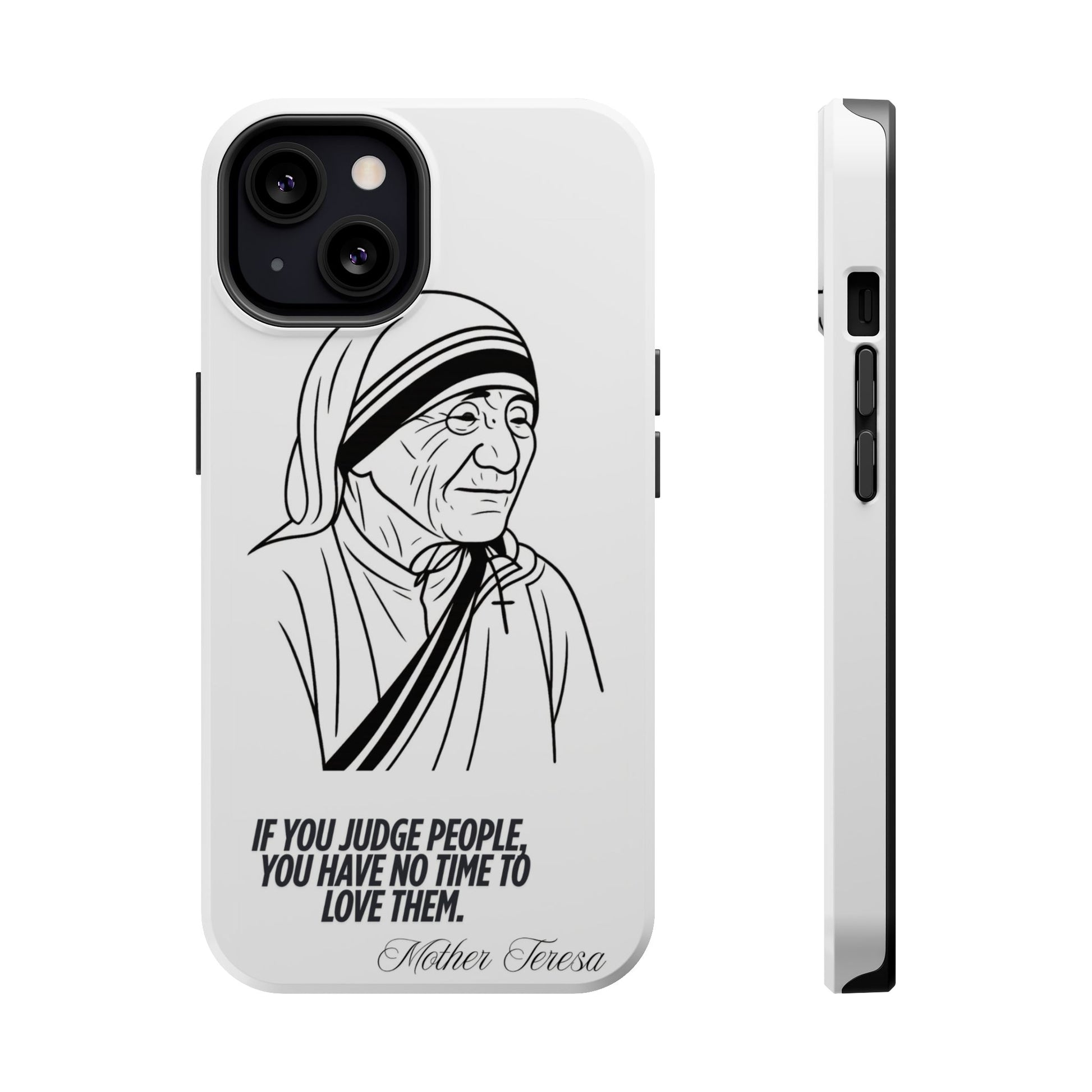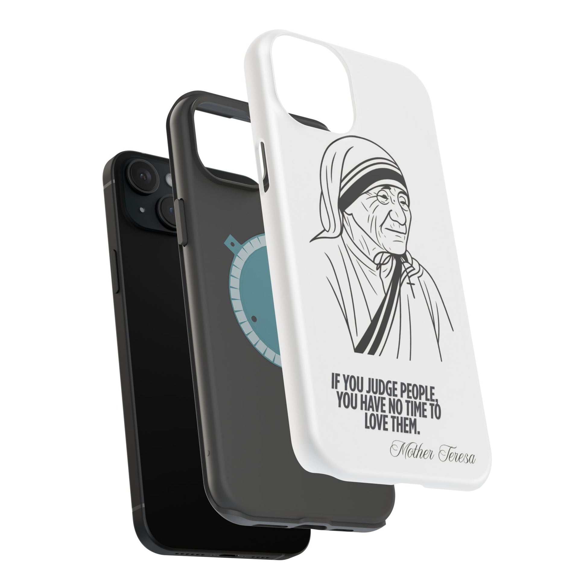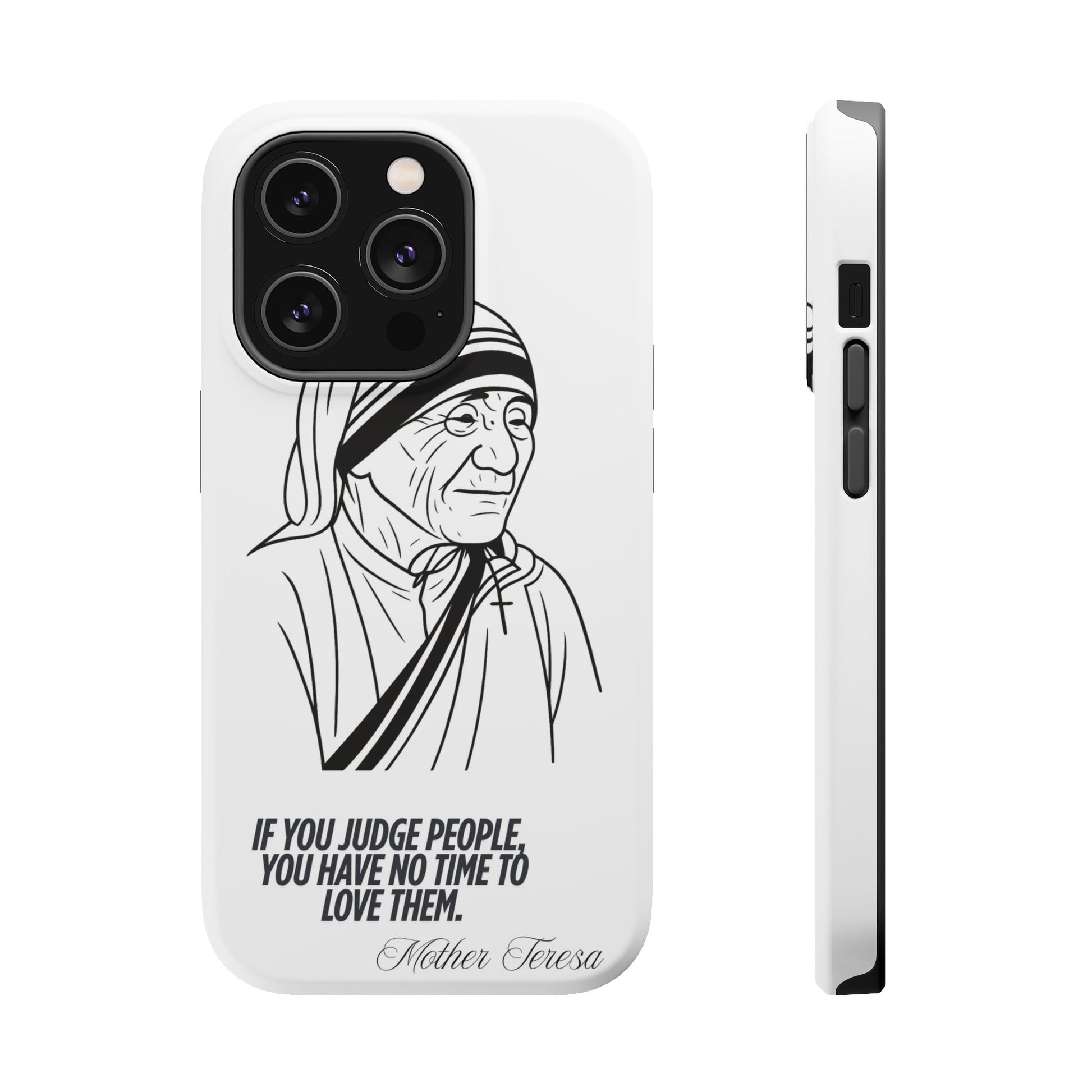 Elevate your iPhone's style while carrying a powerful message with our exclusive Mother Teresa iPhone case. Designed for models iPhone 13 to 16, this case features the inspirational quote: "If you judge people, you have no time to love them."