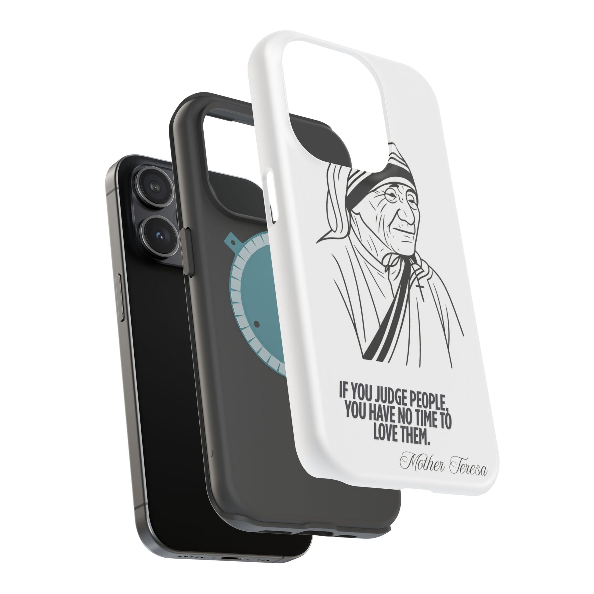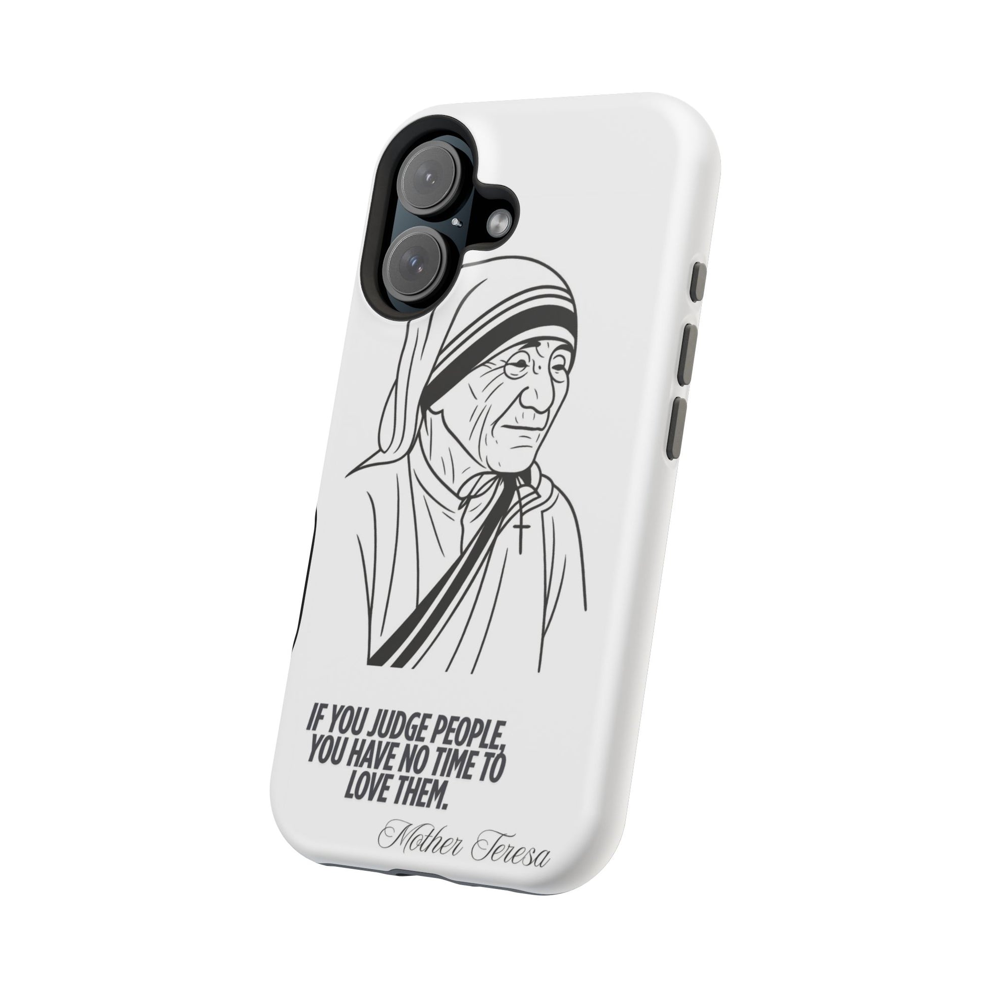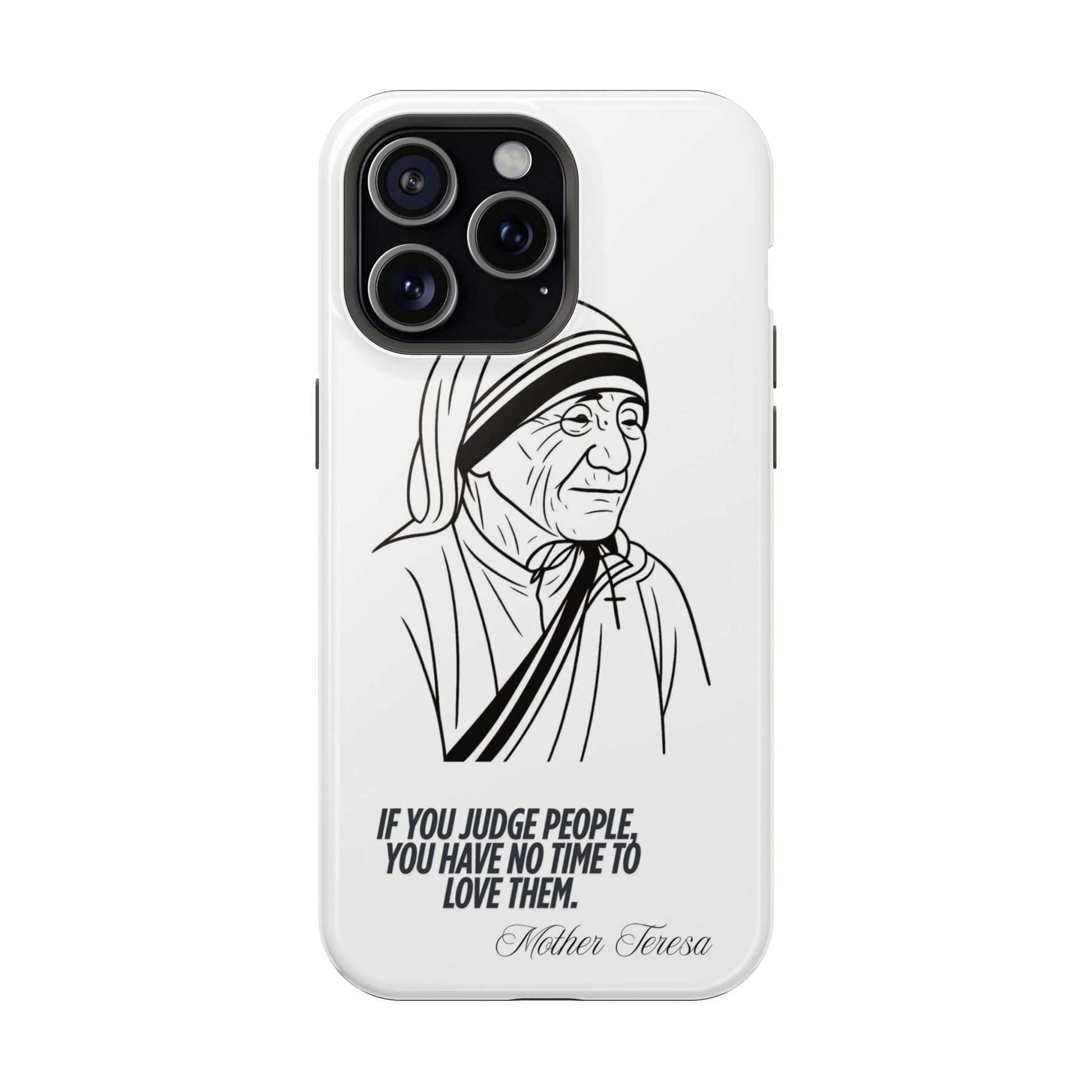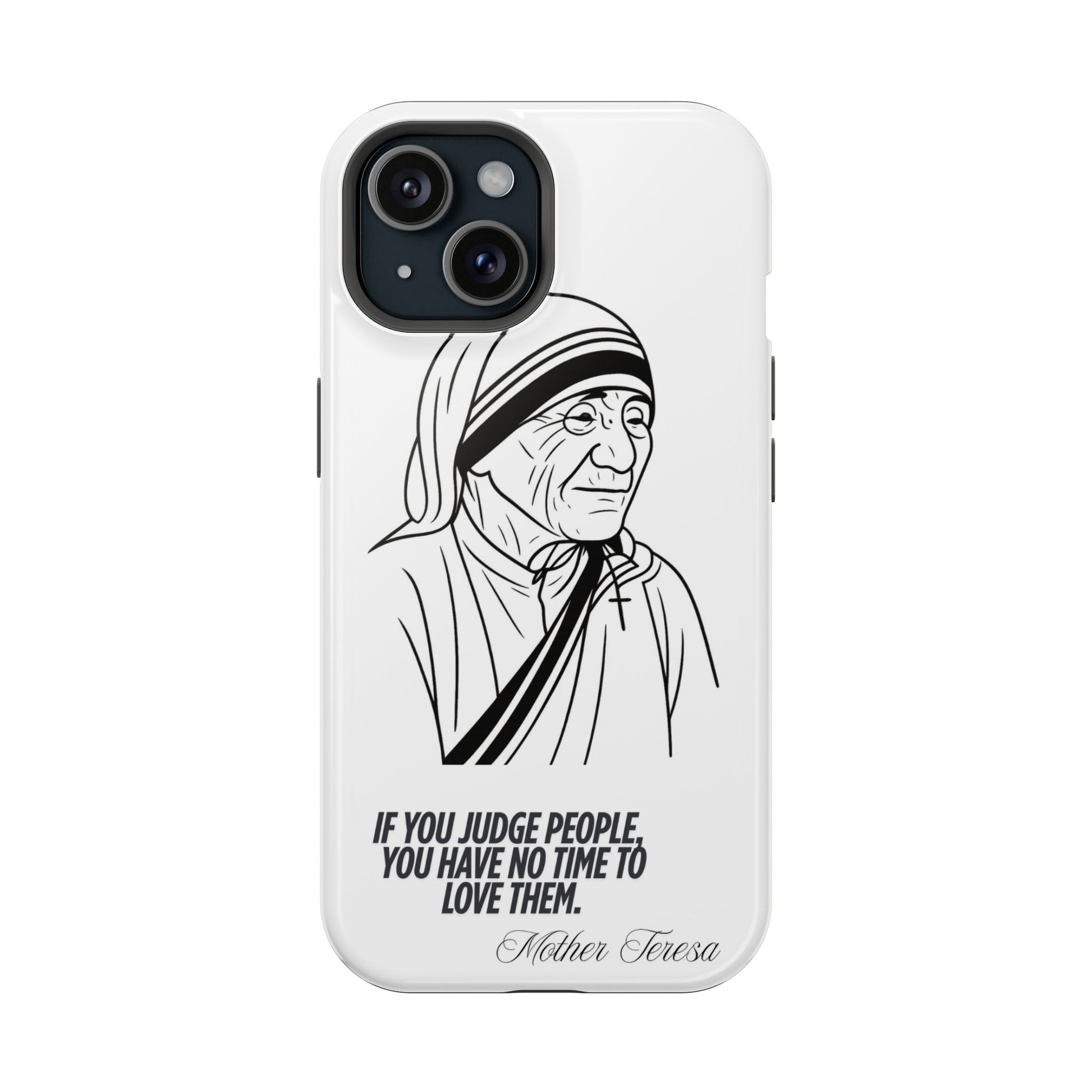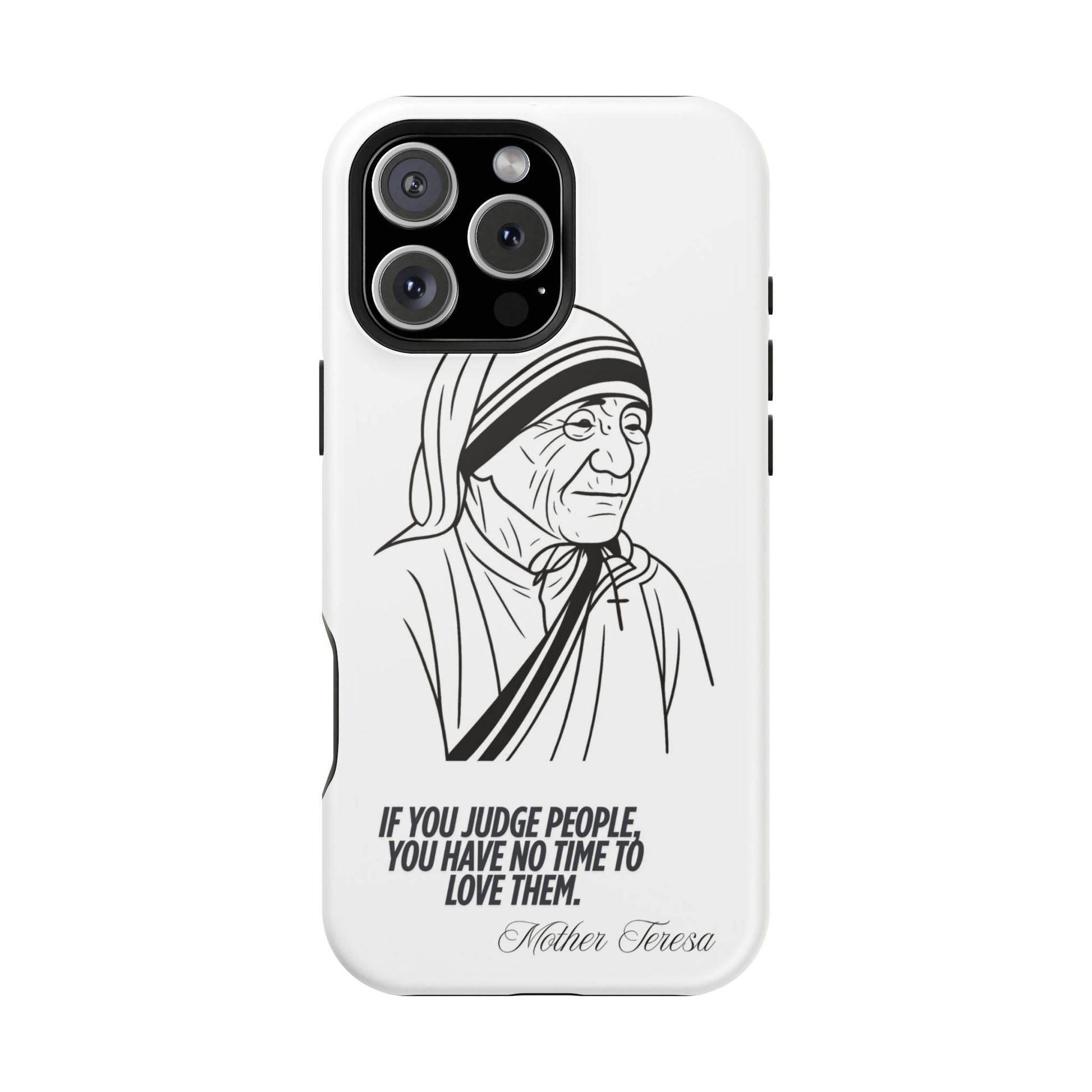 Elevate your iPhone's style while carrying a powerful message with our exclusive Mother Teresa iPhone case. Designed for models iPhone 13 to 16, this case features the inspirational quote: "If you judge people, you have no time to love them."