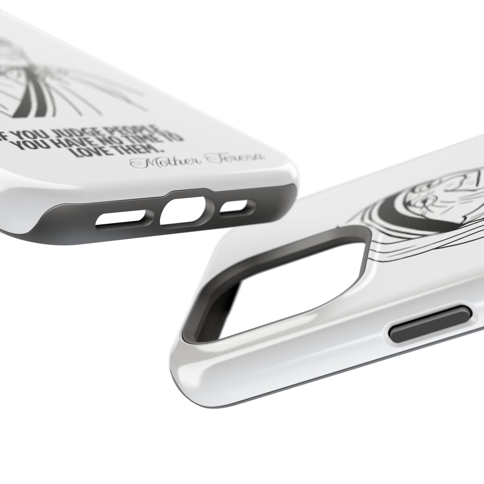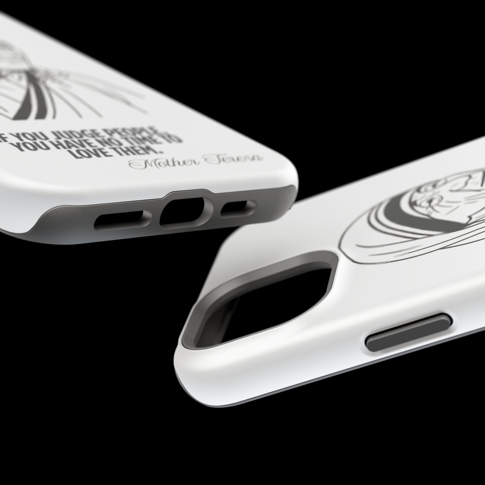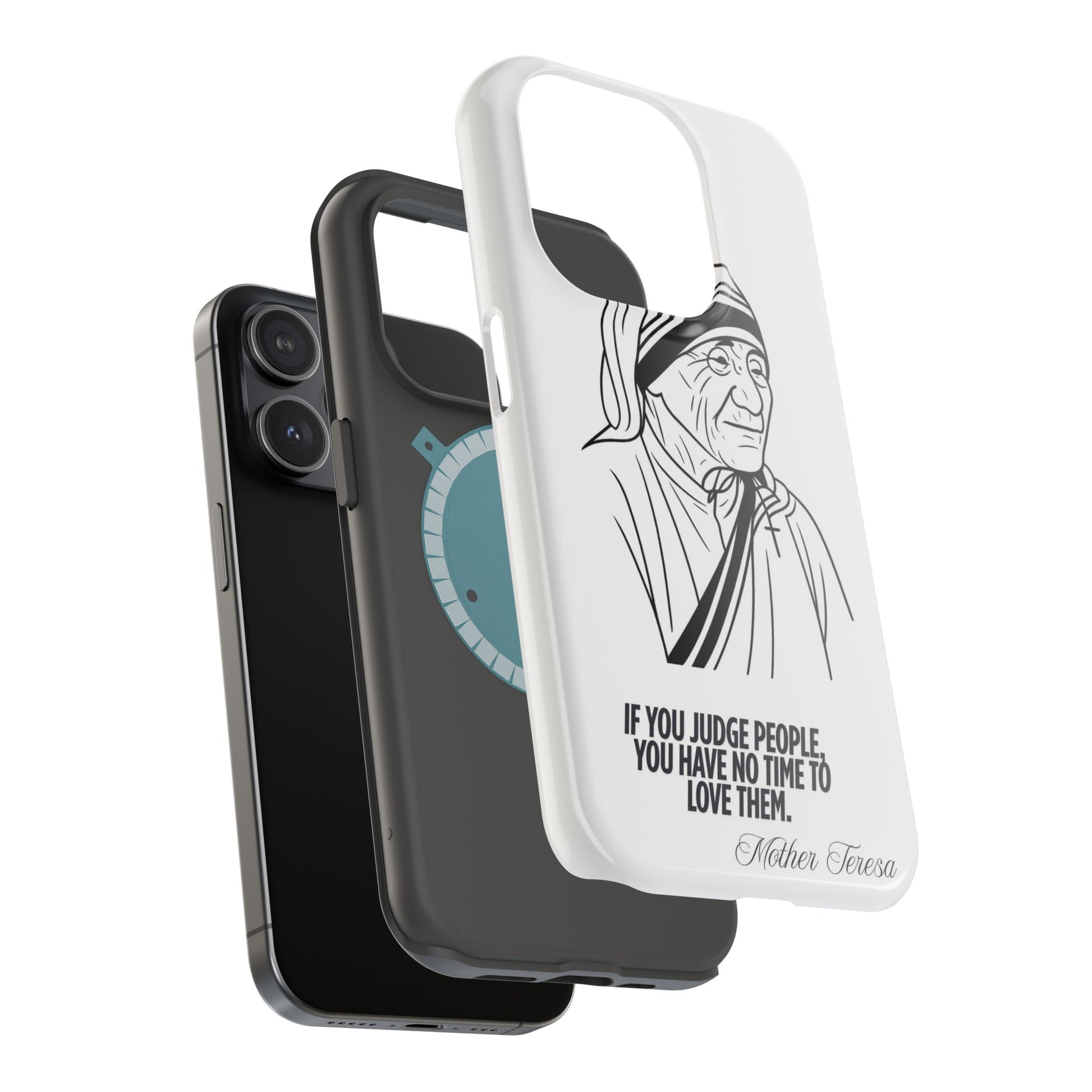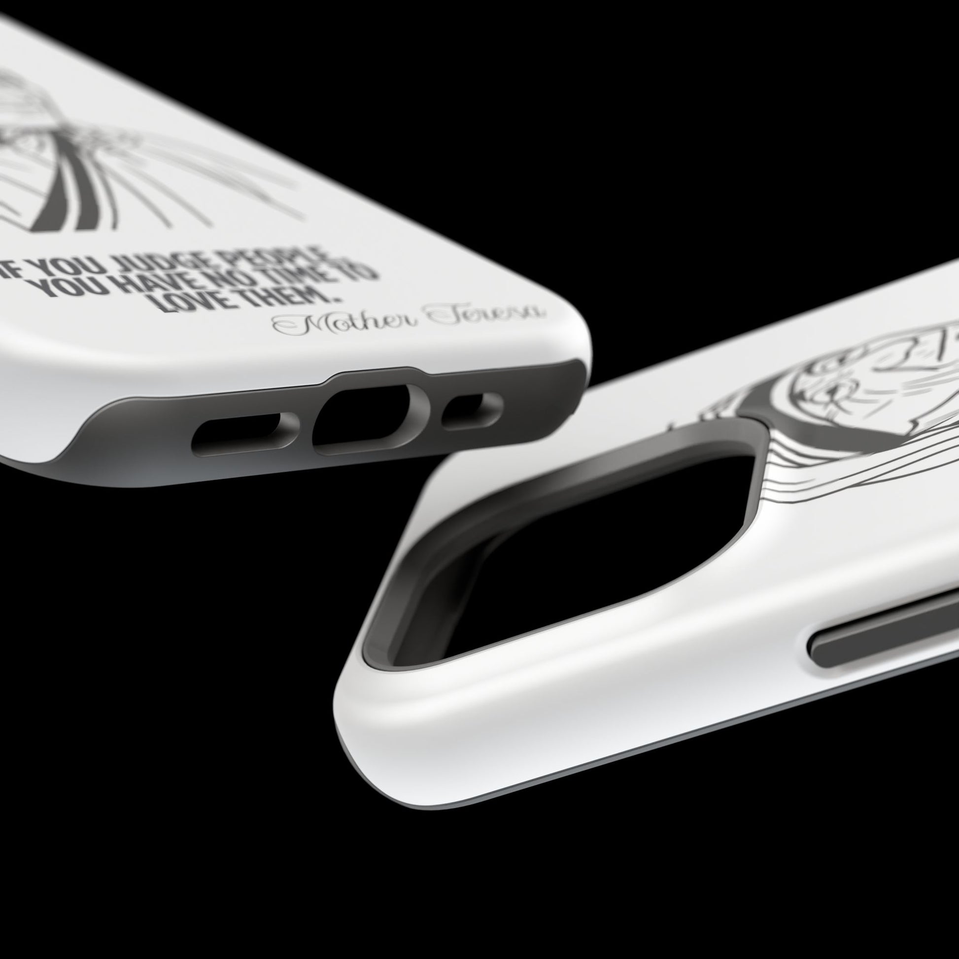 Elevate your iPhone's style while carrying a powerful message with our exclusive Mother Teresa iPhone case. Designed for models iPhone 13 to 16, this case features the inspirational quote: "If you judge people, you have no time to love them."