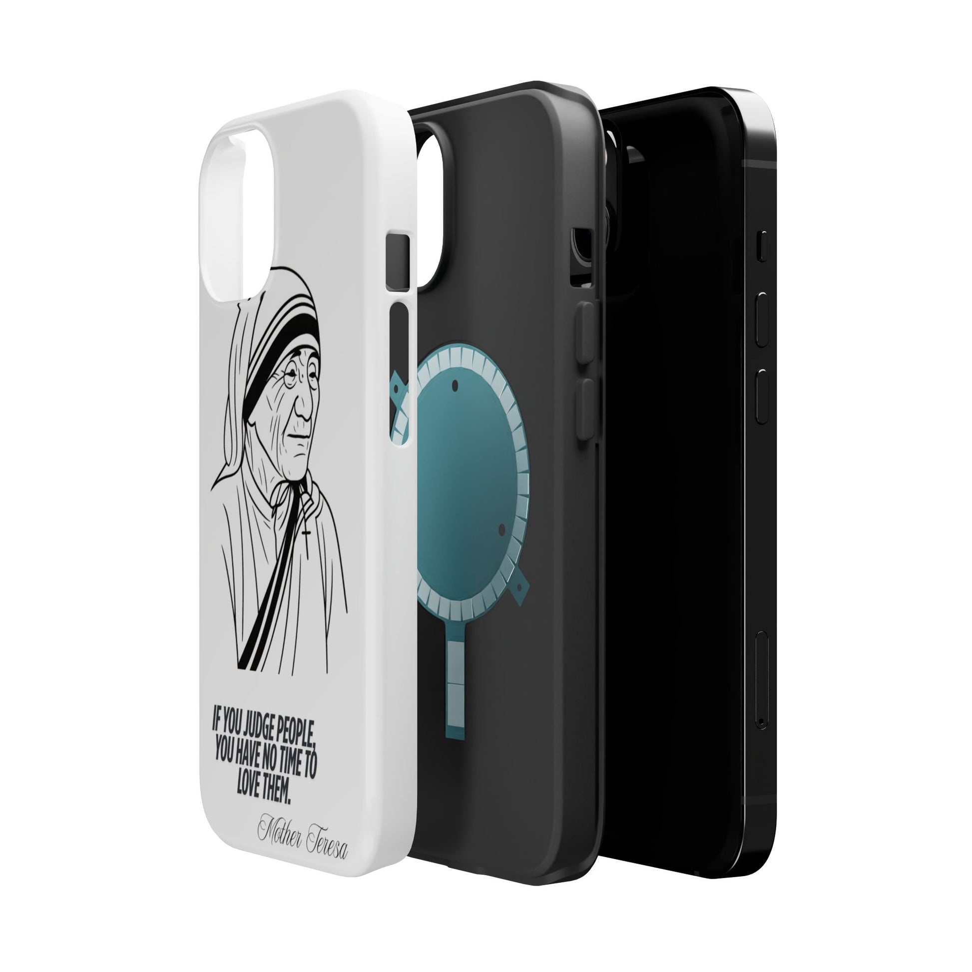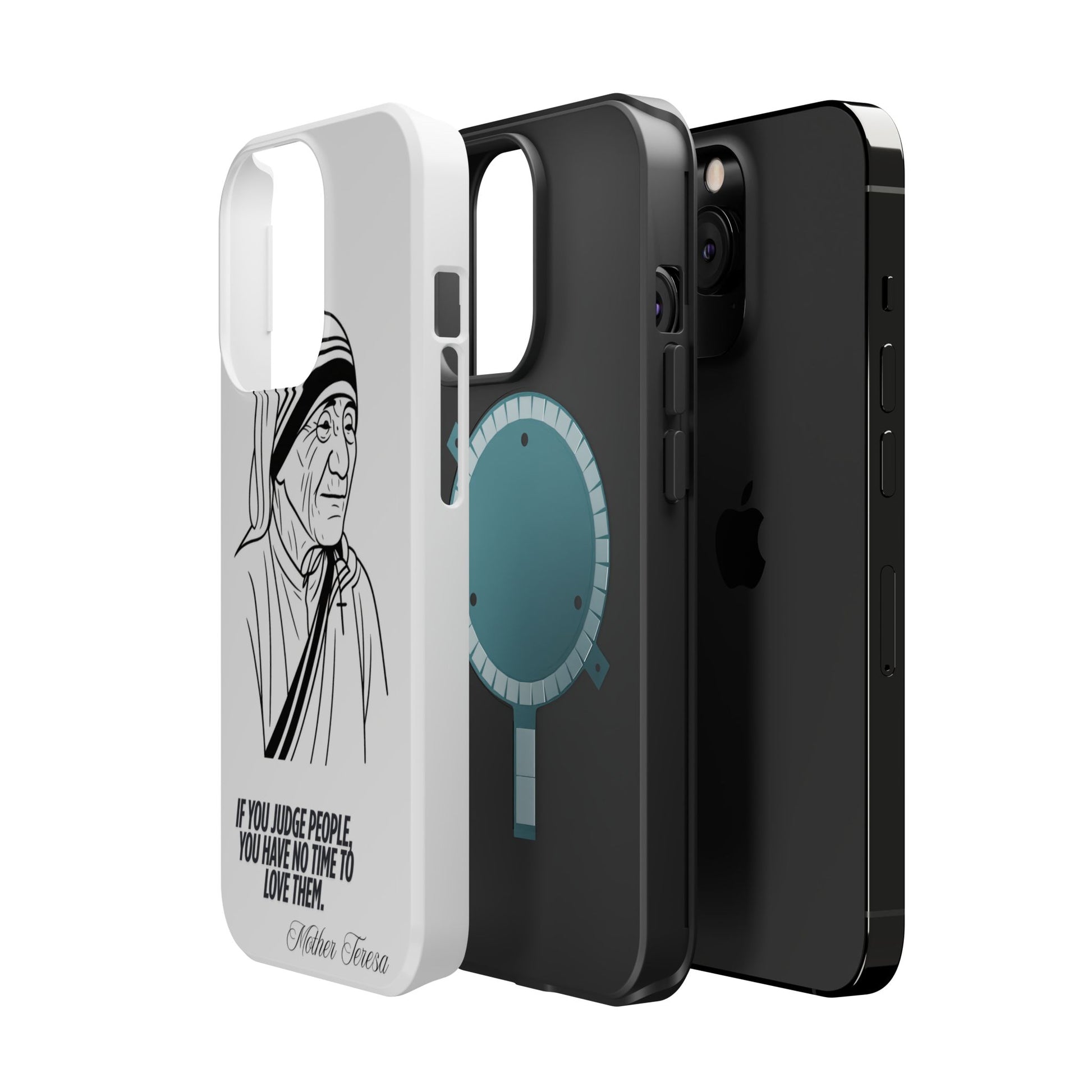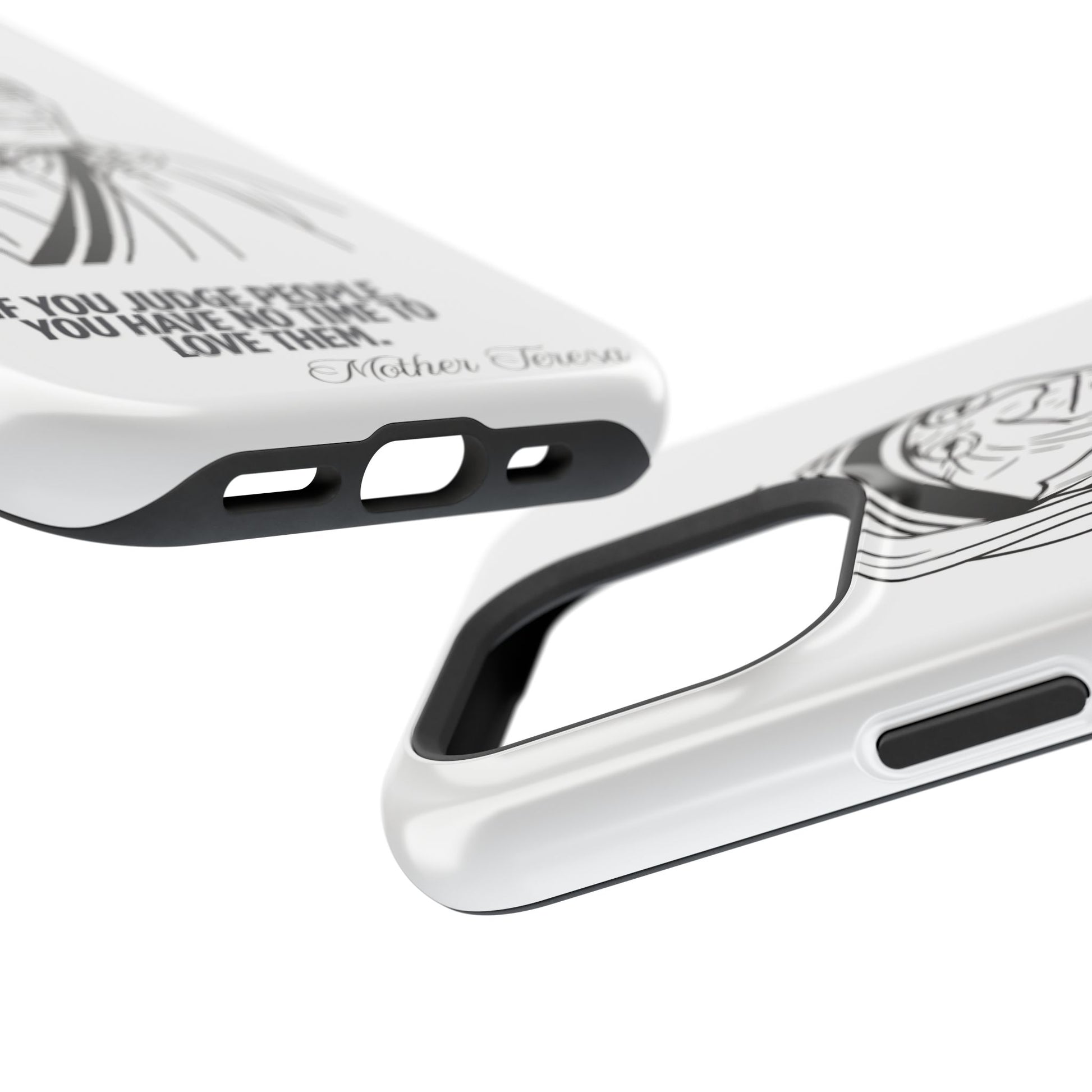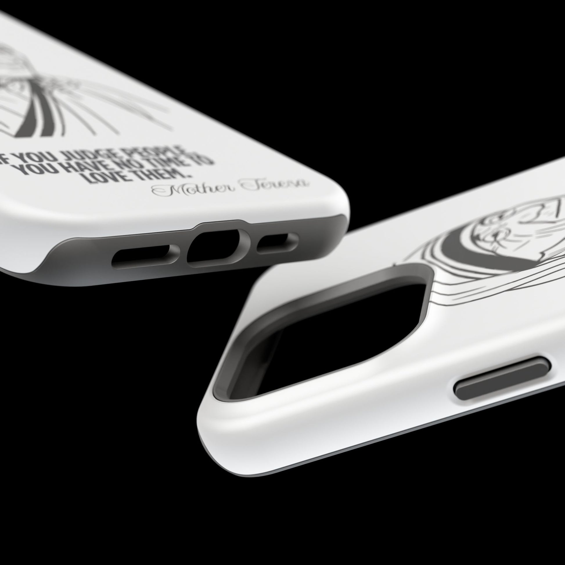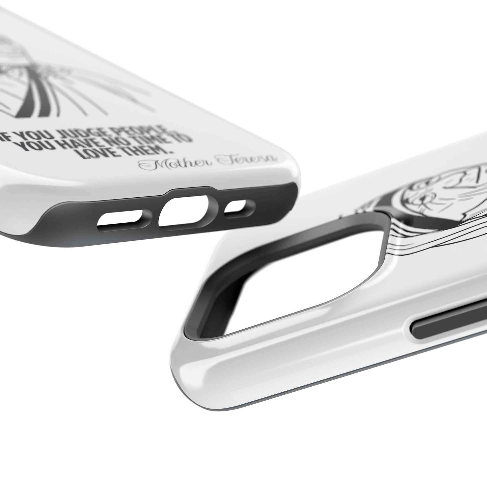 Elevate your iPhone's style while carrying a powerful message with our exclusive Mother Teresa iPhone case. Designed for models iPhone 13 to 16, this case features the inspirational quote: "If you judge people, you have no time to love them."