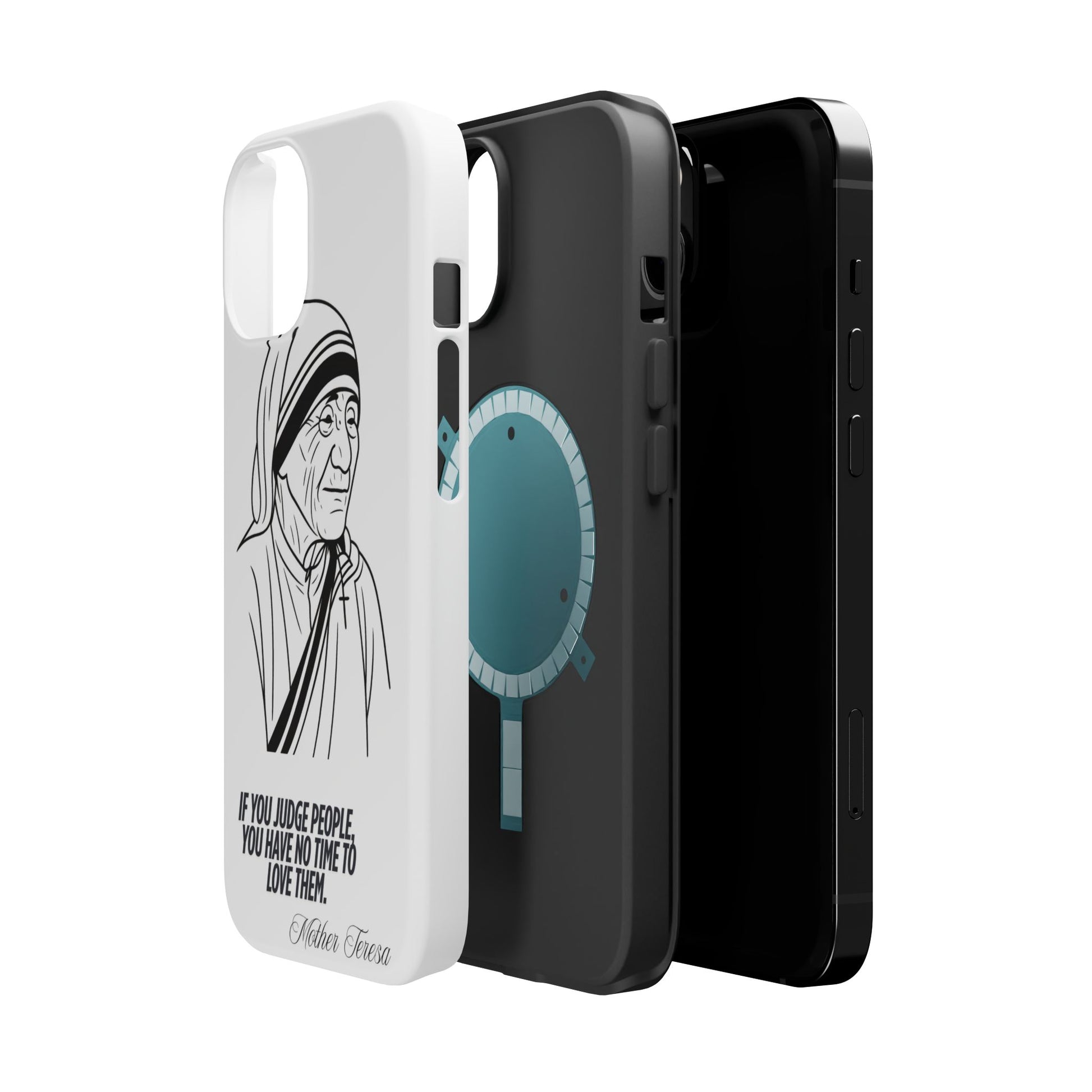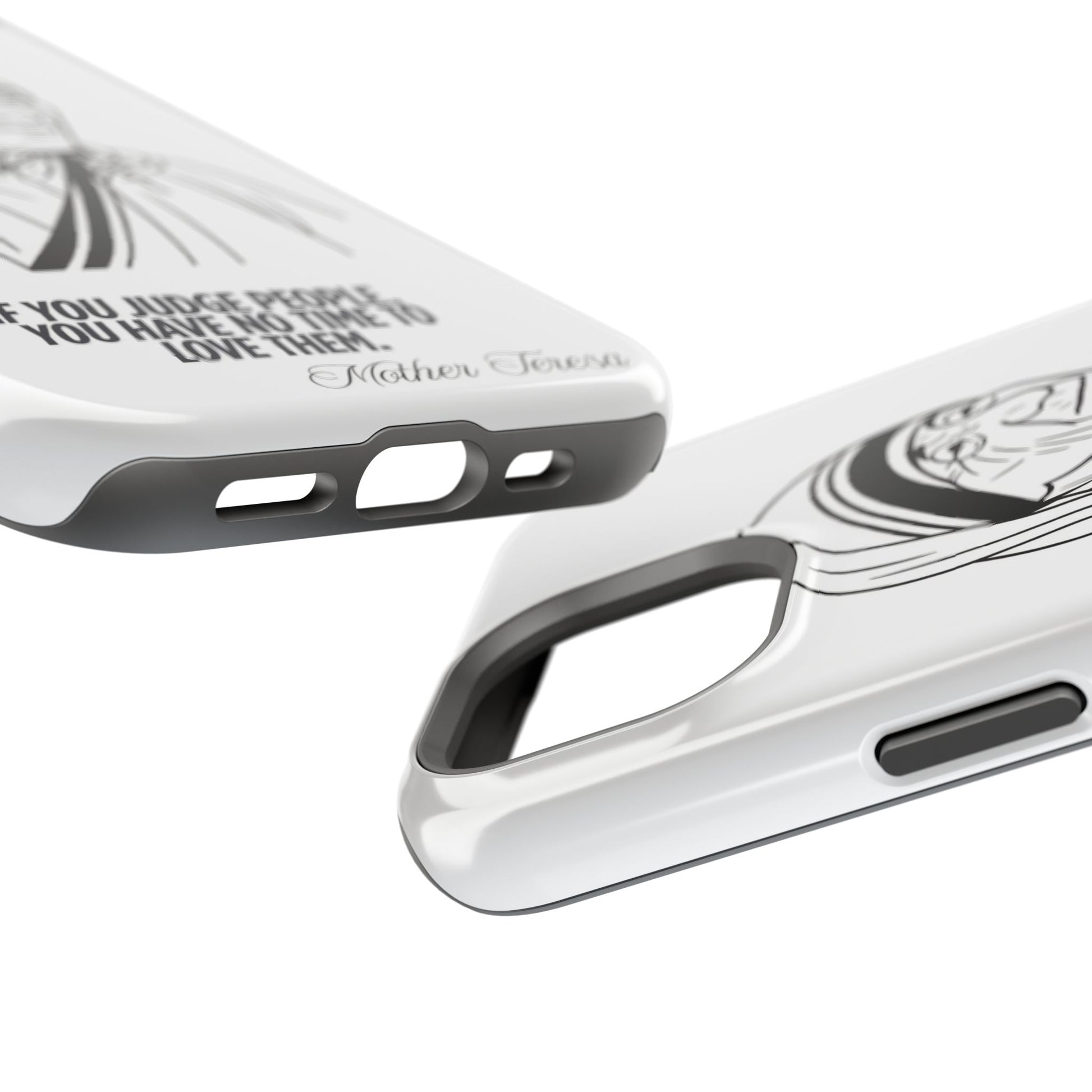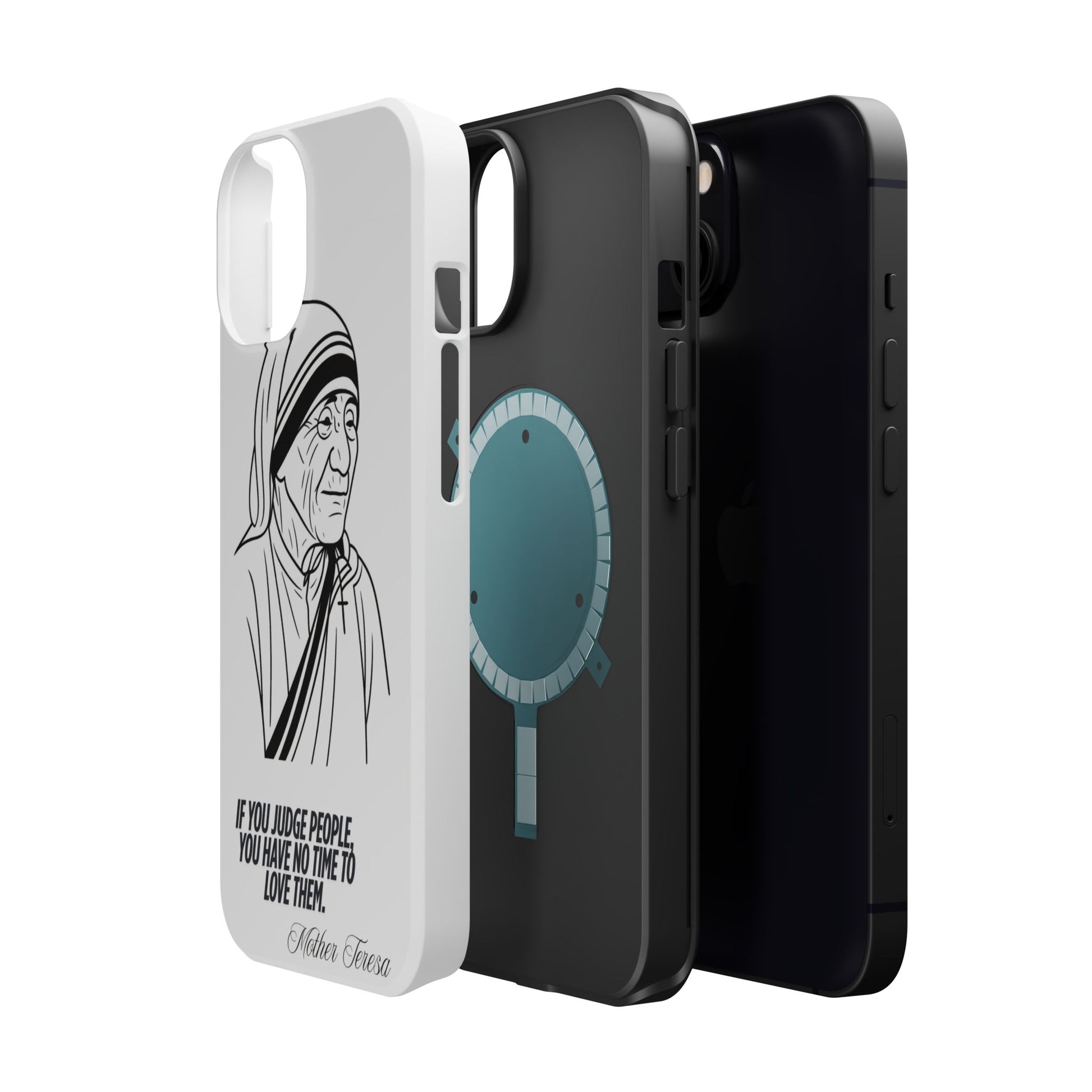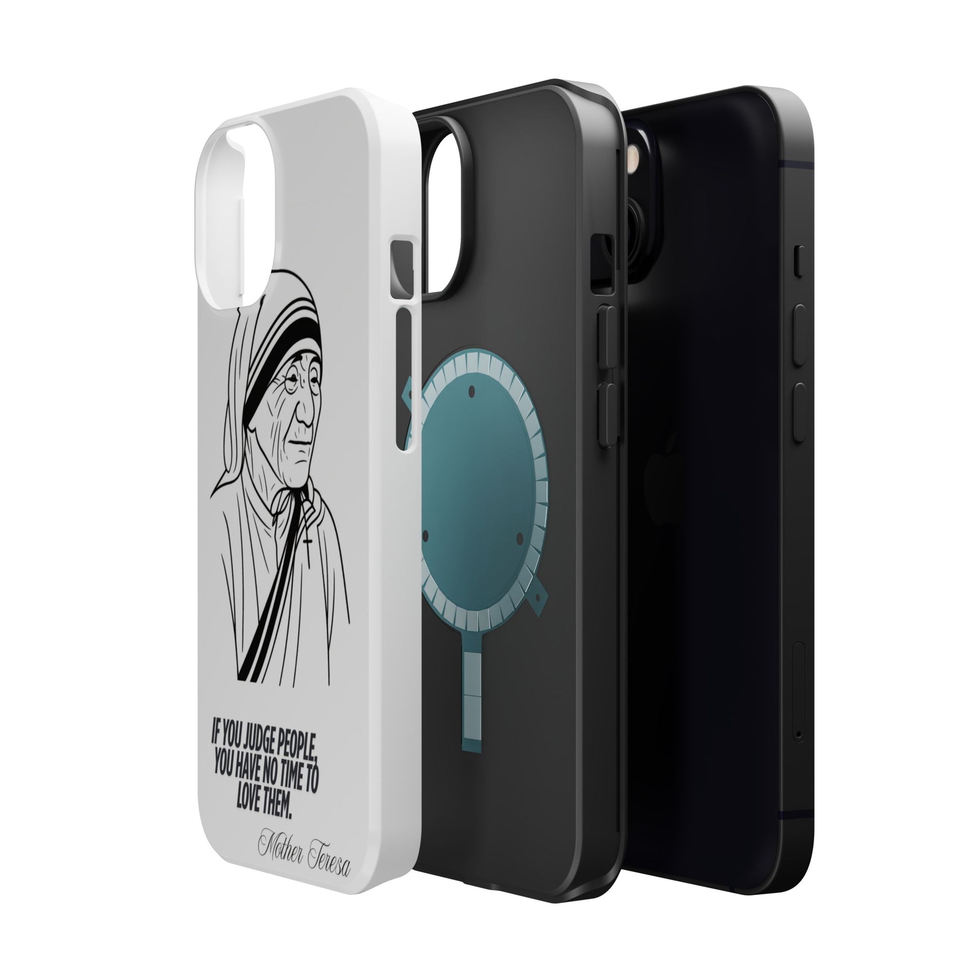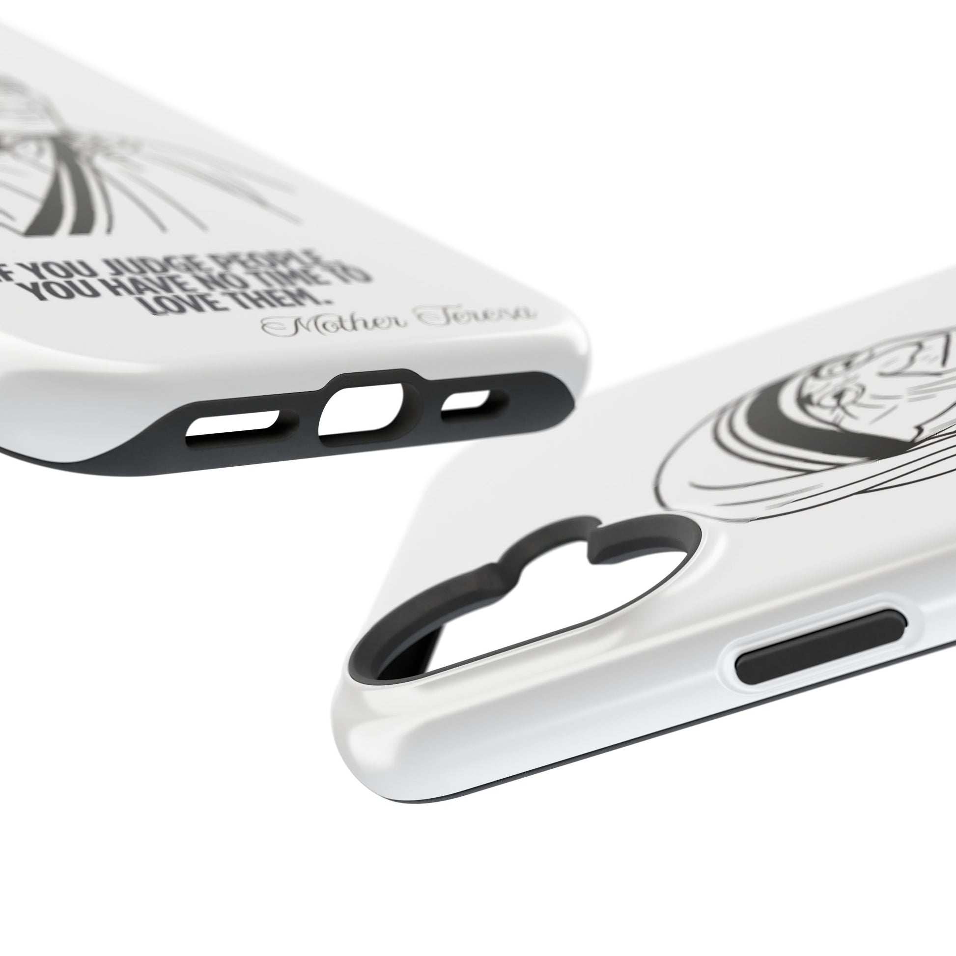 Elevate your iPhone's style while carrying a powerful message with our exclusive Mother Teresa iPhone case. Designed for models iPhone 13 to 16, this case features the inspirational quote: "If you judge people, you have no time to love them."