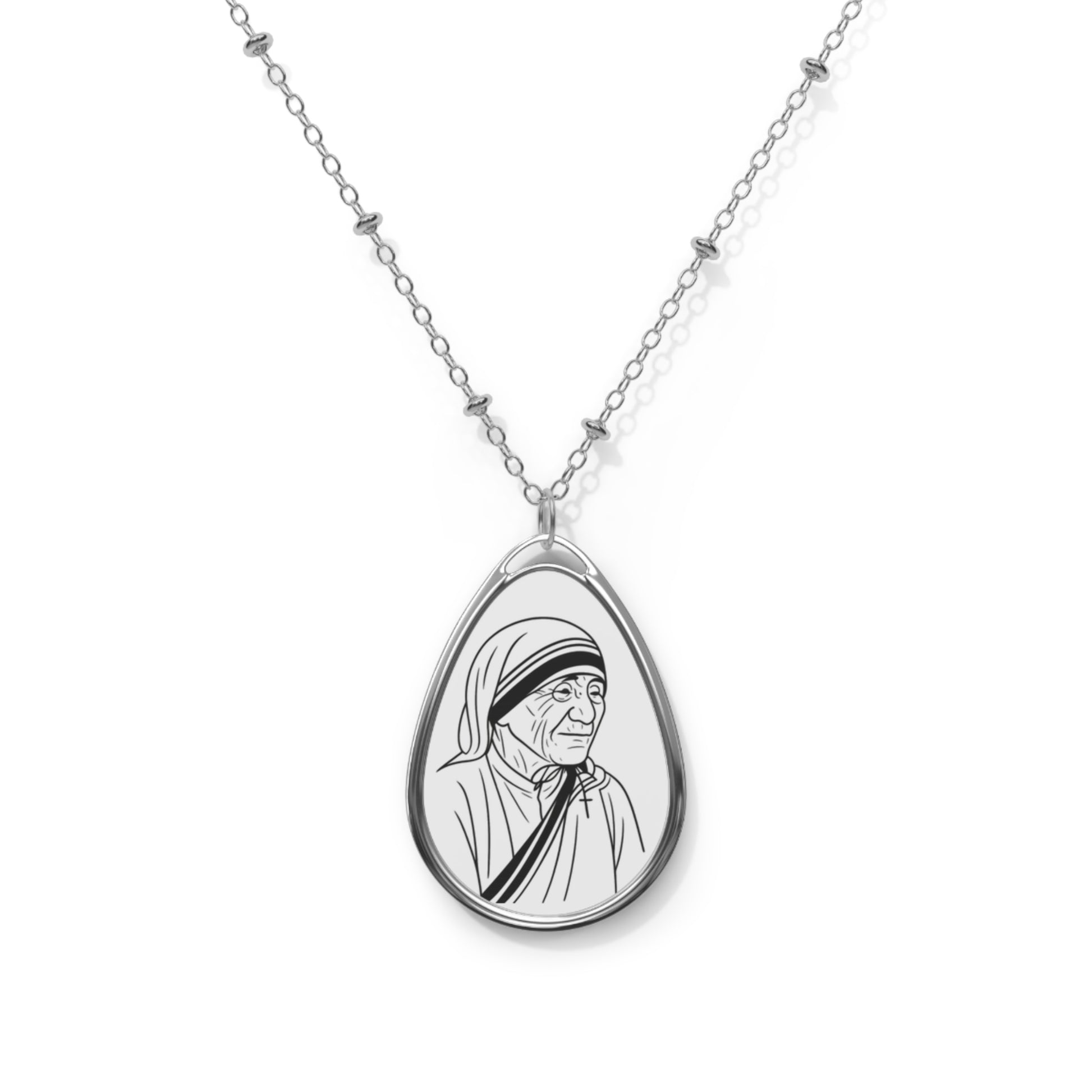 A beautiful oval necklace featuring a portrait of Mother Teresa on a white background. Made from sturdy zinc alloy, this necklace exudes elegance and grace. Perfect for those who appreciate Mother Teresa's teachings and want to carry her inspiration with them. Also, great for religious occasions, gift-giving, or everyday wear.