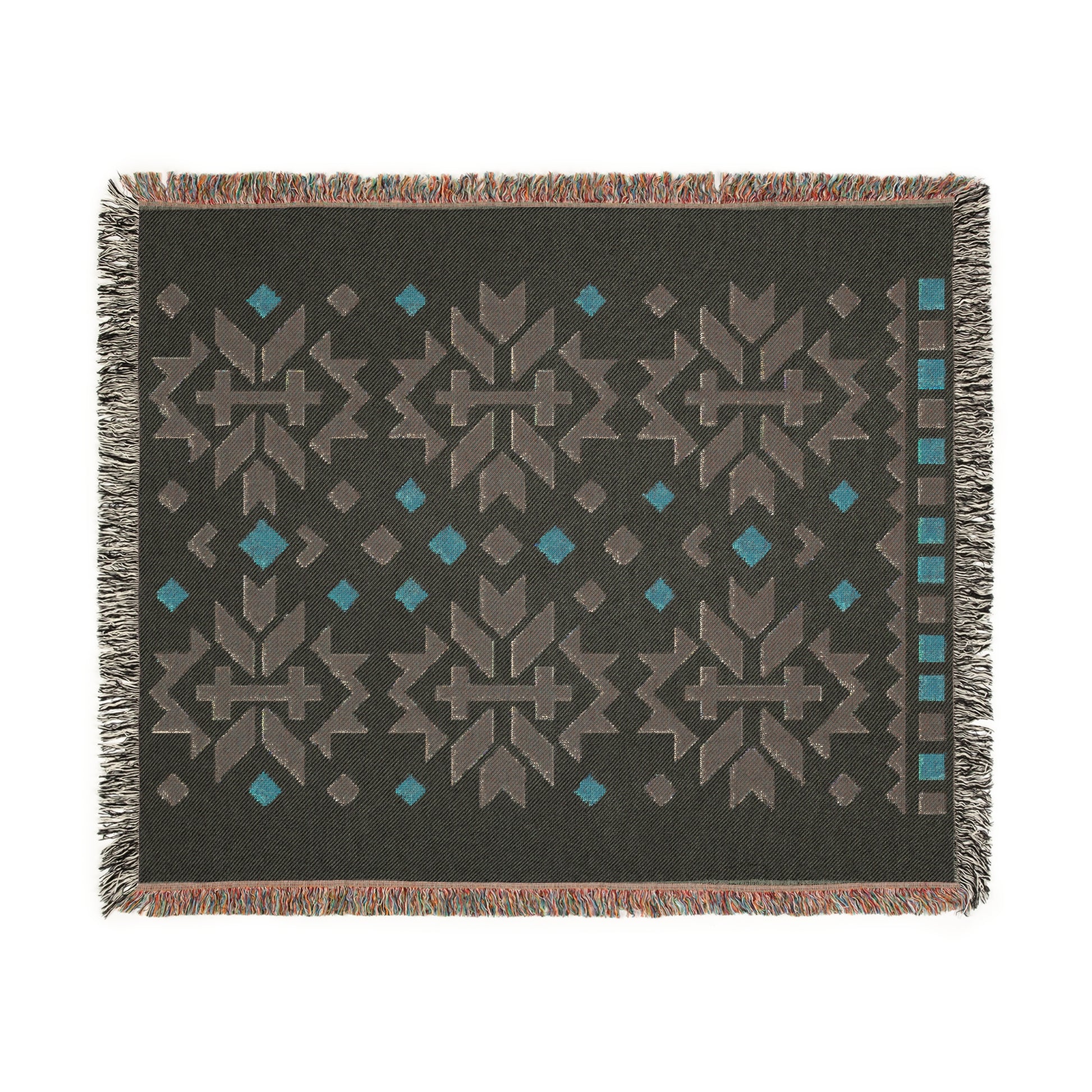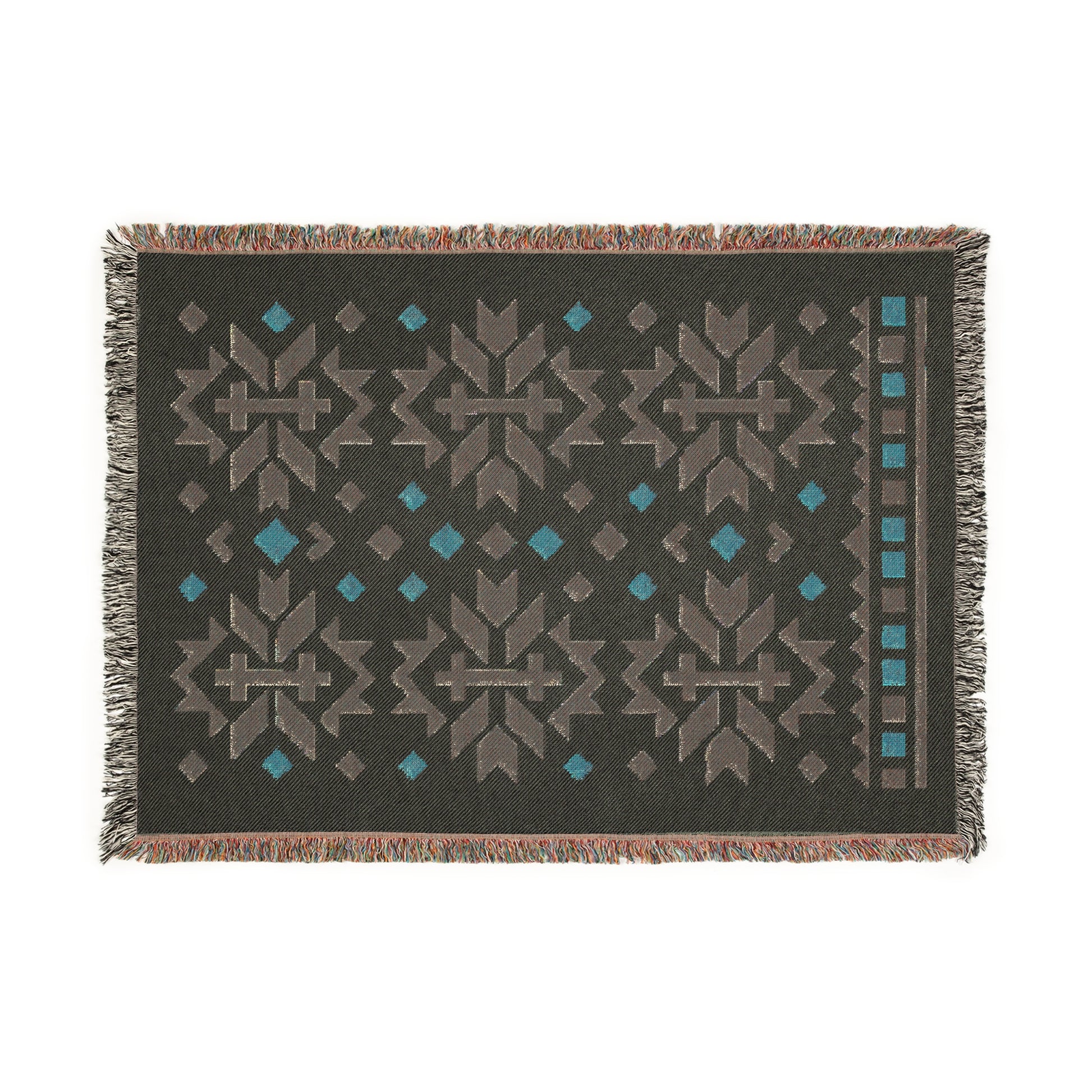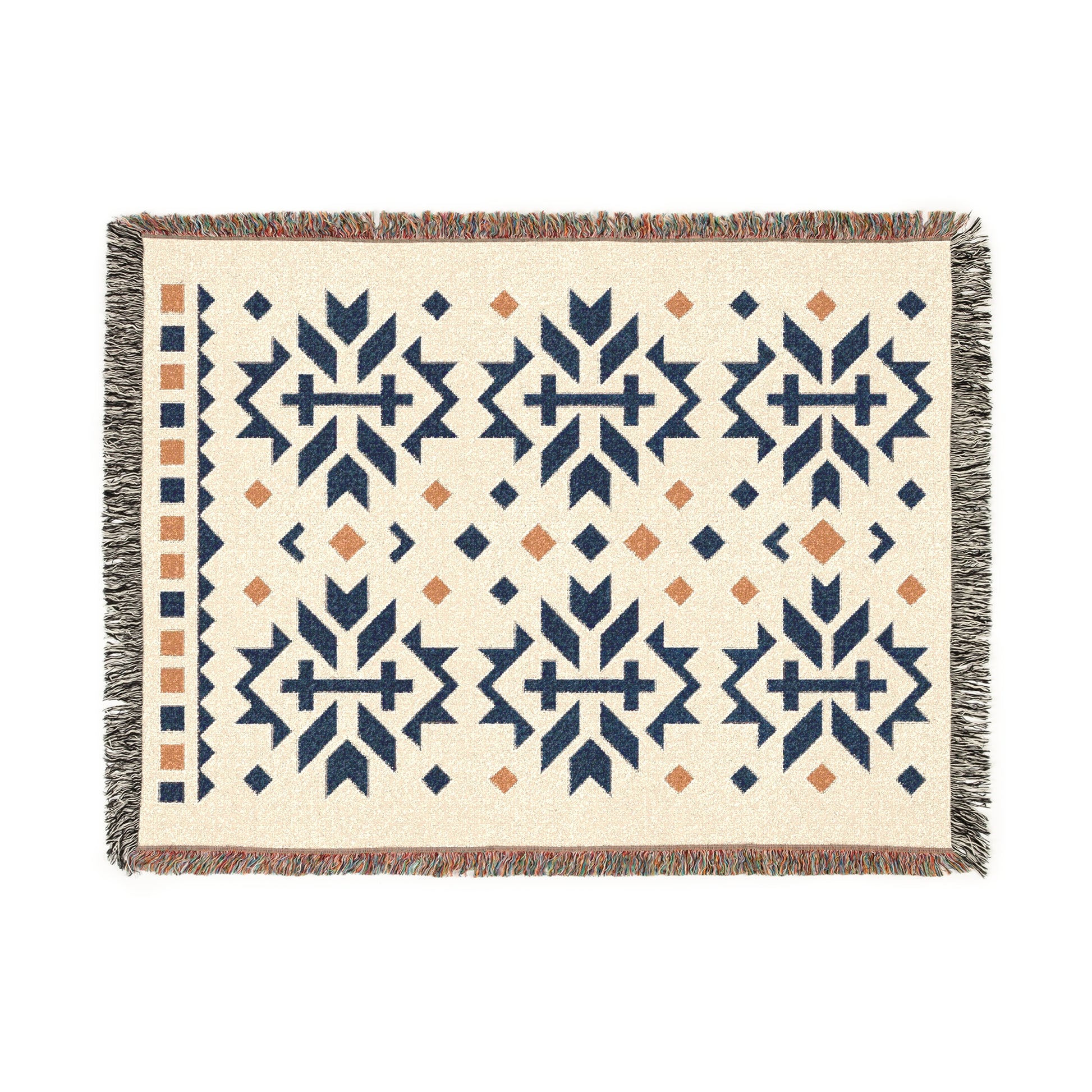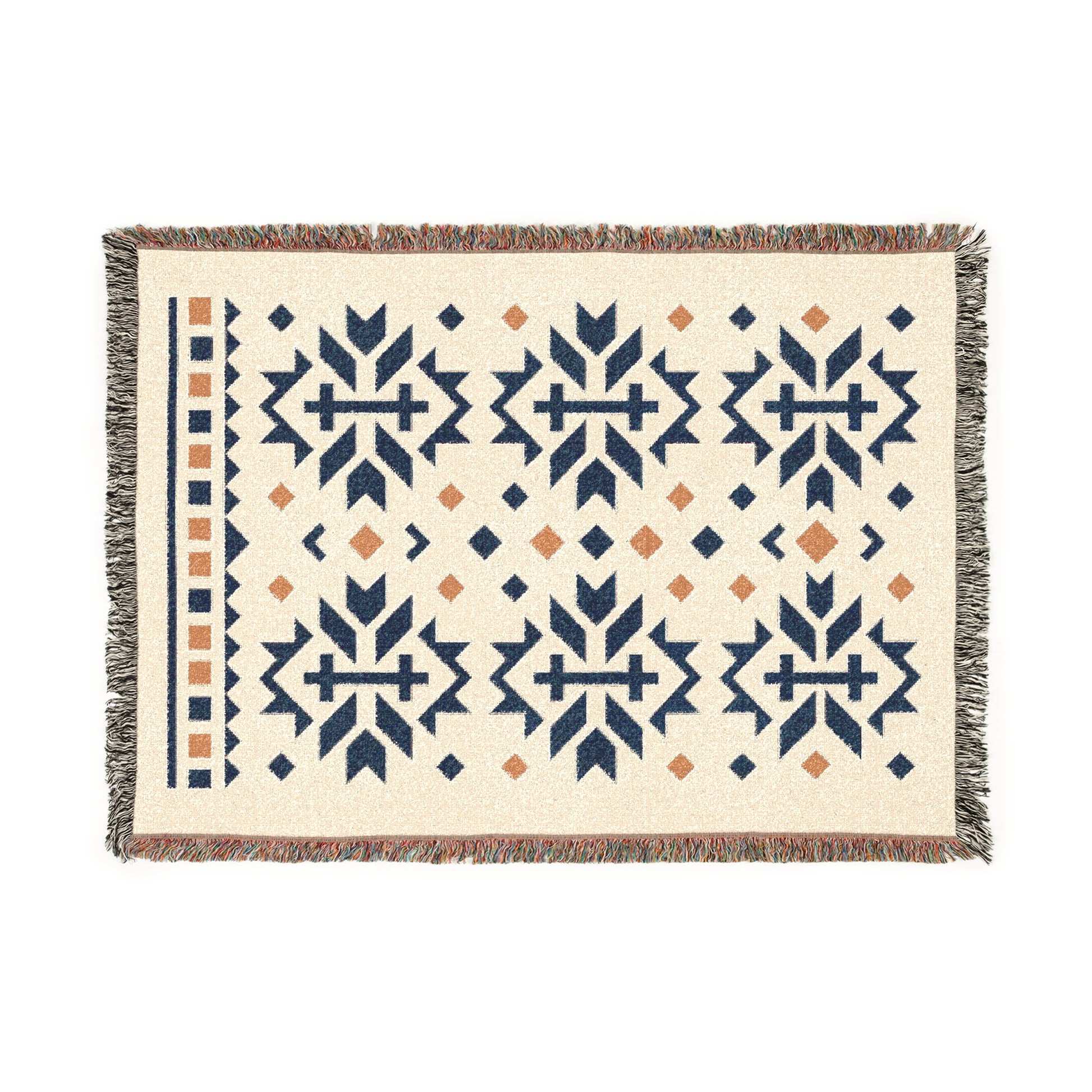 Inspired by Illyrian and Balkan folk artistry, this woven cotton throw features bold cross-shaped medallions and arrow-like geometric motifs arranged in a rhythmic, symmetrical pattern. The rich navy and warm gold tones stand out beautifully against the soft cream background, creating a vibrant yet timeless boho aesthetic that enhances both modern and rustic spaces. Soft, durable, and visually striking, it layers effortlessly on sofas, beds, or outdoor seating. Expertly woven from premium cotton, it celebrates heritage craftsmanship while remaining fully machine-washable for everyday ease.