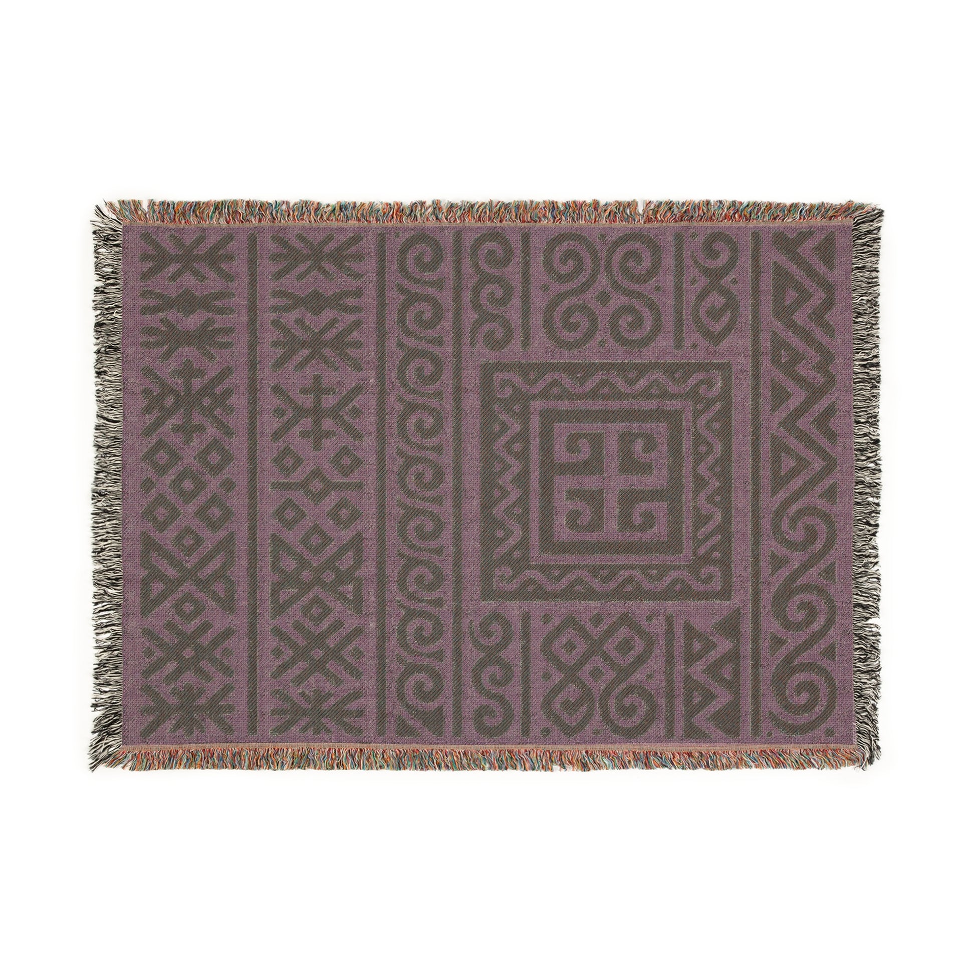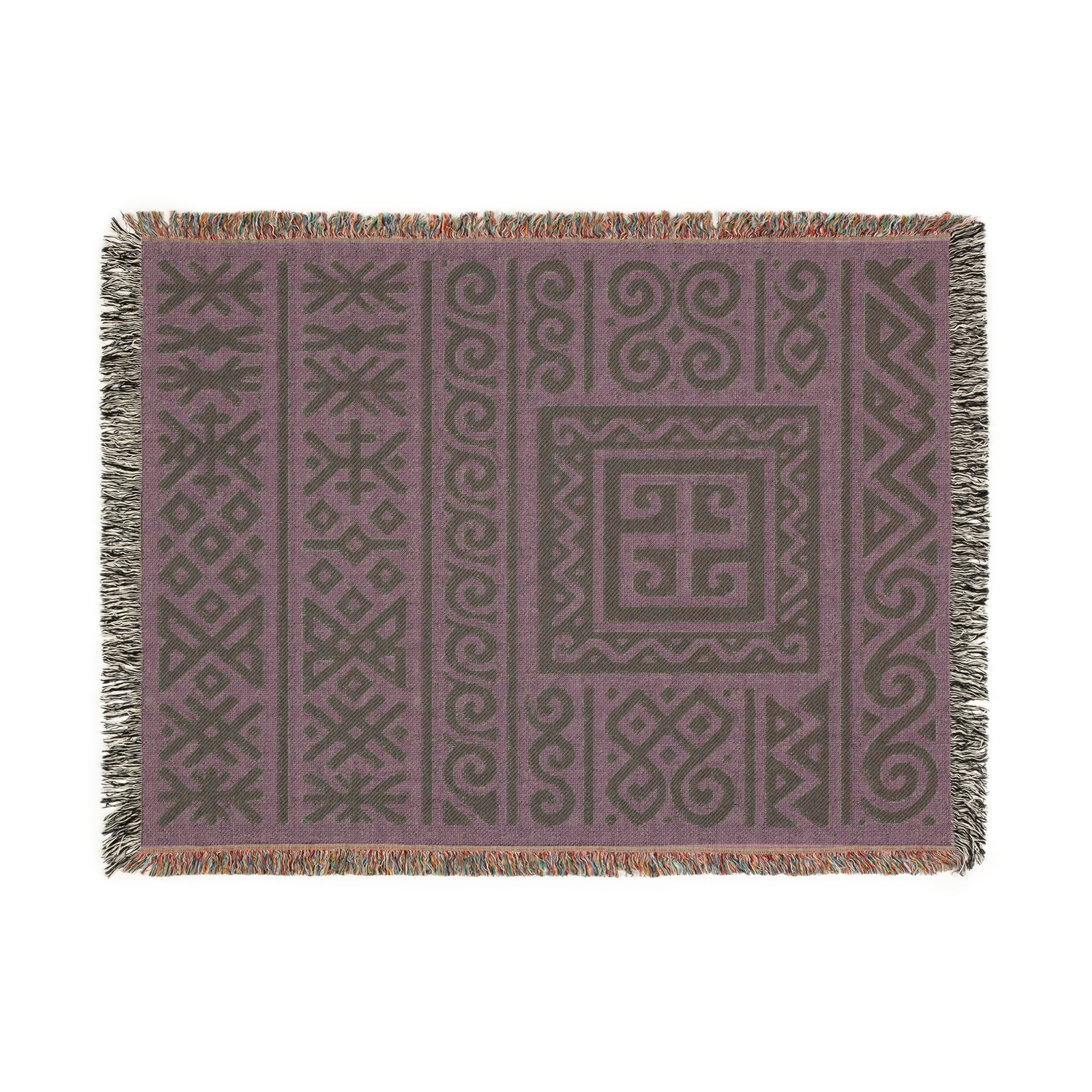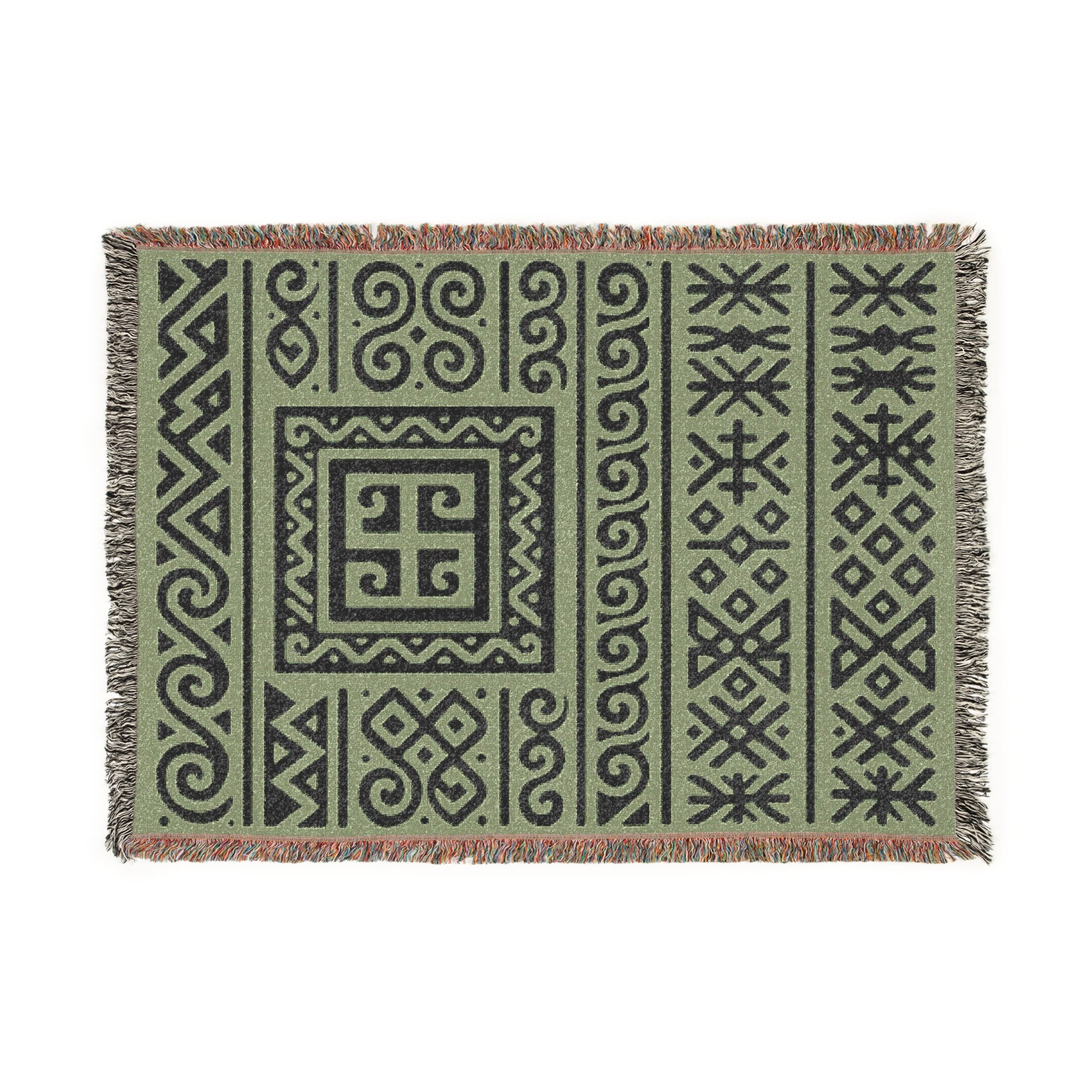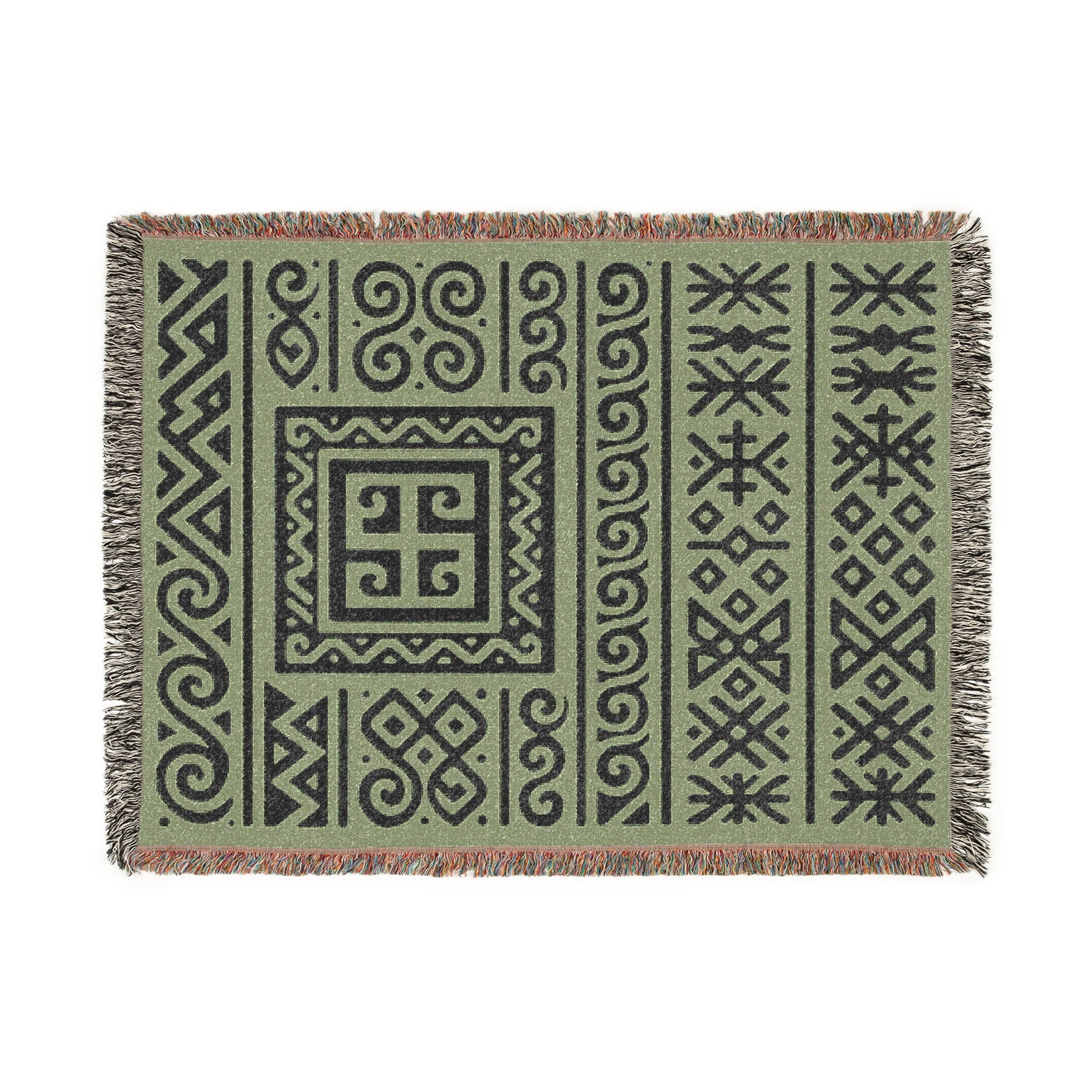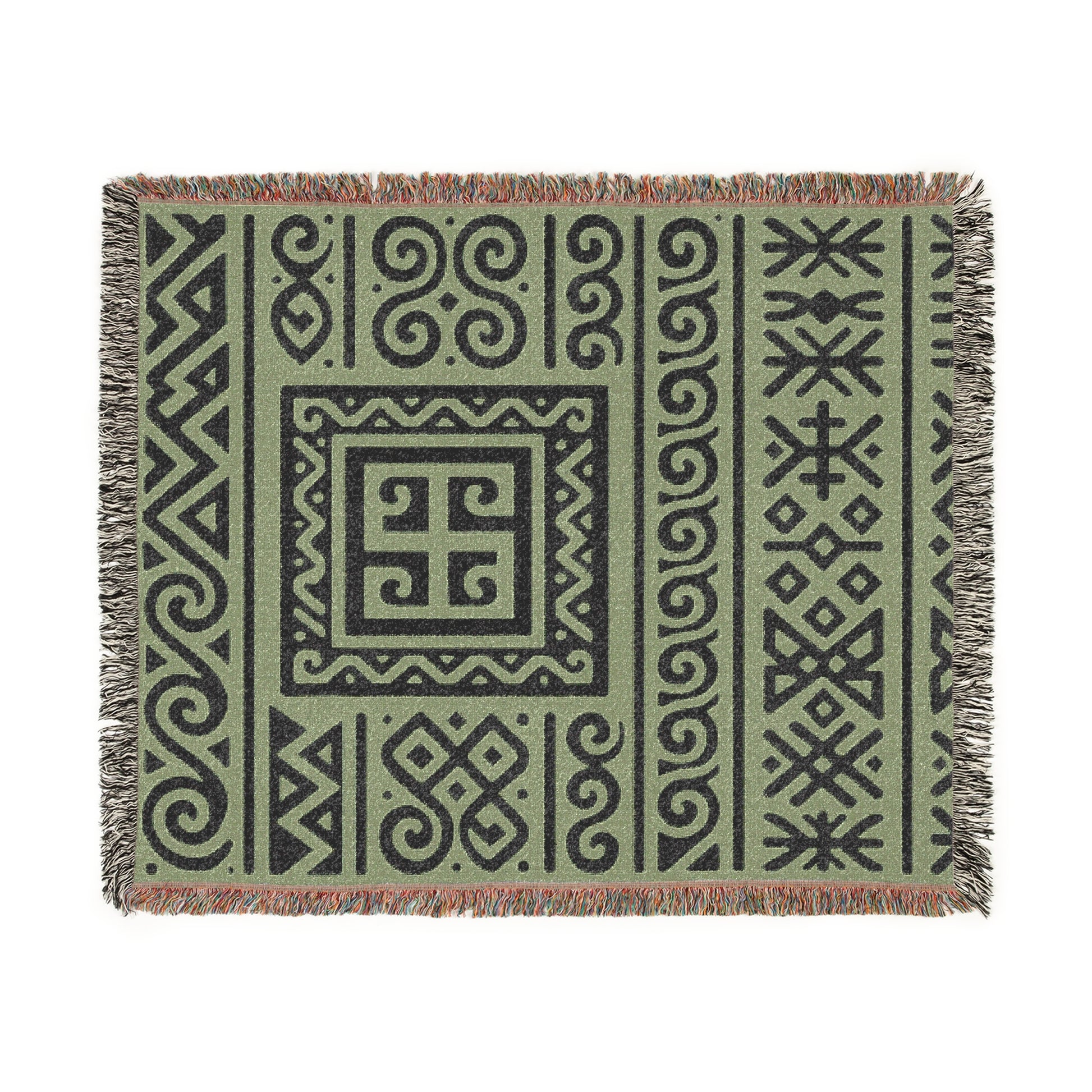 Inspired by ancient Illyrian motifs, this woven throw features bold black geometric symbols set against a calming sage green backdrop, creating a striking blend of heritage and modern minimalism. The central spiral-cross emblem is framed by rhythmic waves, diamonds, and traditional knot patterns that echo centuries-old Balkan artistry. Soft, durable, and beautifully textured, it drapes effortlessly over your sofa, bed, or reading nook while adding a timeless, earthy warmth. Crafted with premium weaving for lasting comfort, it’s the perfect statement piece for cozy evenings, layered interiors, or meaningful gifts rooted in culture and craftsmanship.
