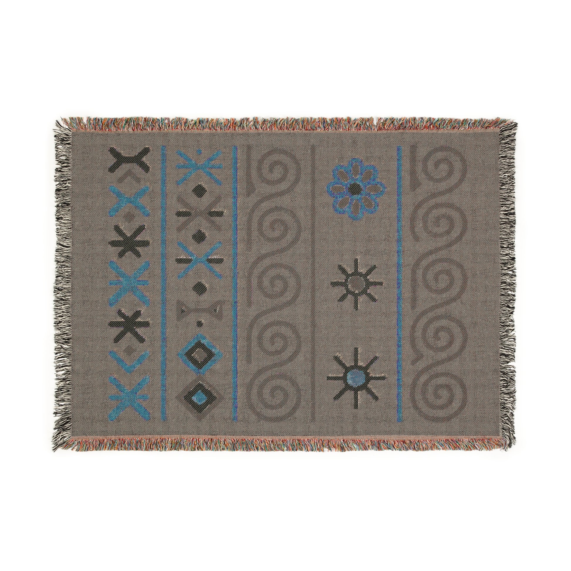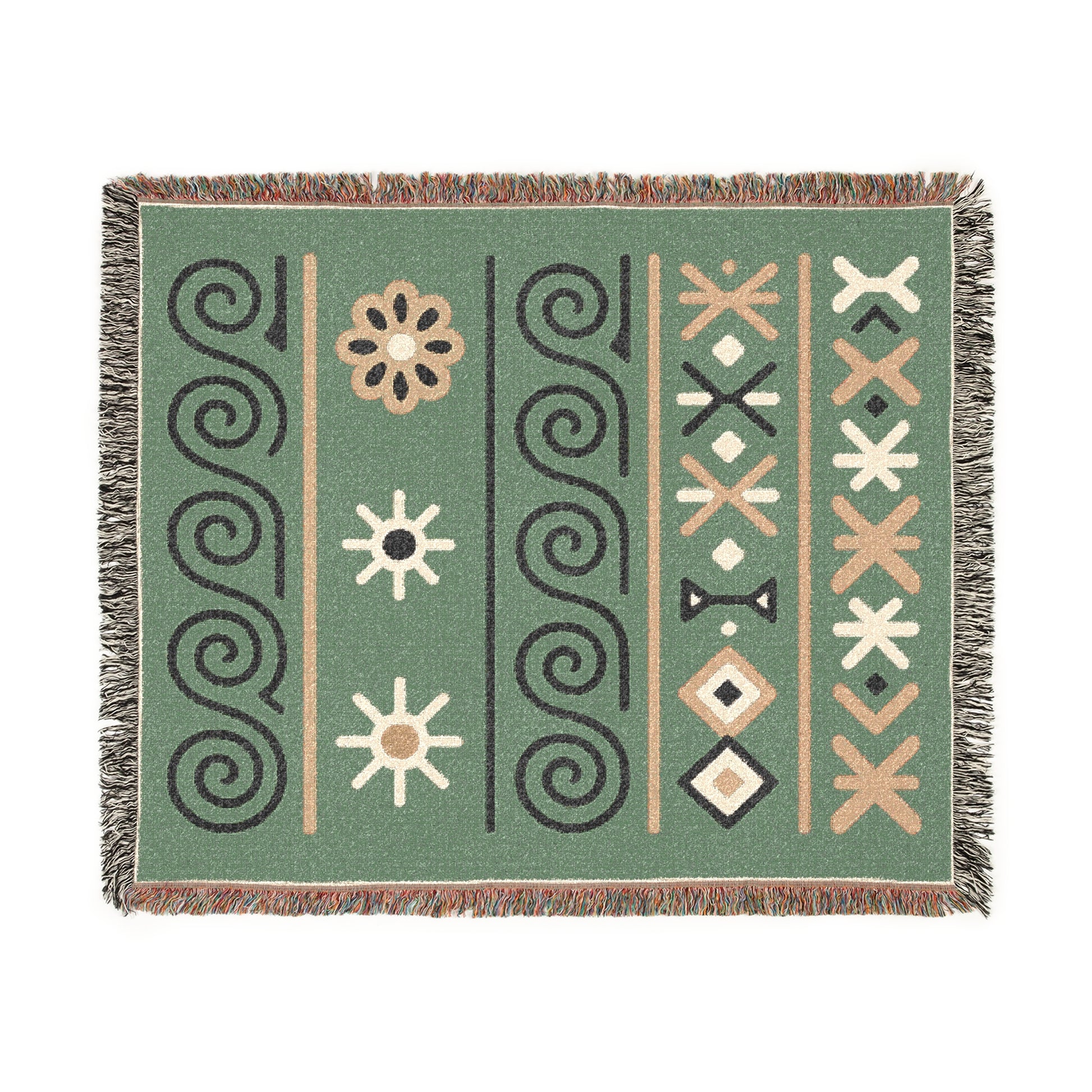 Inspired by Illyrian spirals and traditional folk sun motifs, this woven cotton throw blends gentle sage green with sand, cream, and black geometric accents for a calm yet expressive boho aesthetic. Sunbursts, floral emblems, diamonds, and rhythmic wave patterns create a soothing, balanced composition that complements both modern and rustic interiors. Soft yet durable, it drapes beautifully across sofas, beds, or outdoor seating. Expertly woven from premium cotton, it honors heritage craftsmanship while remaining fully machine-washable for everyday comfort and care.