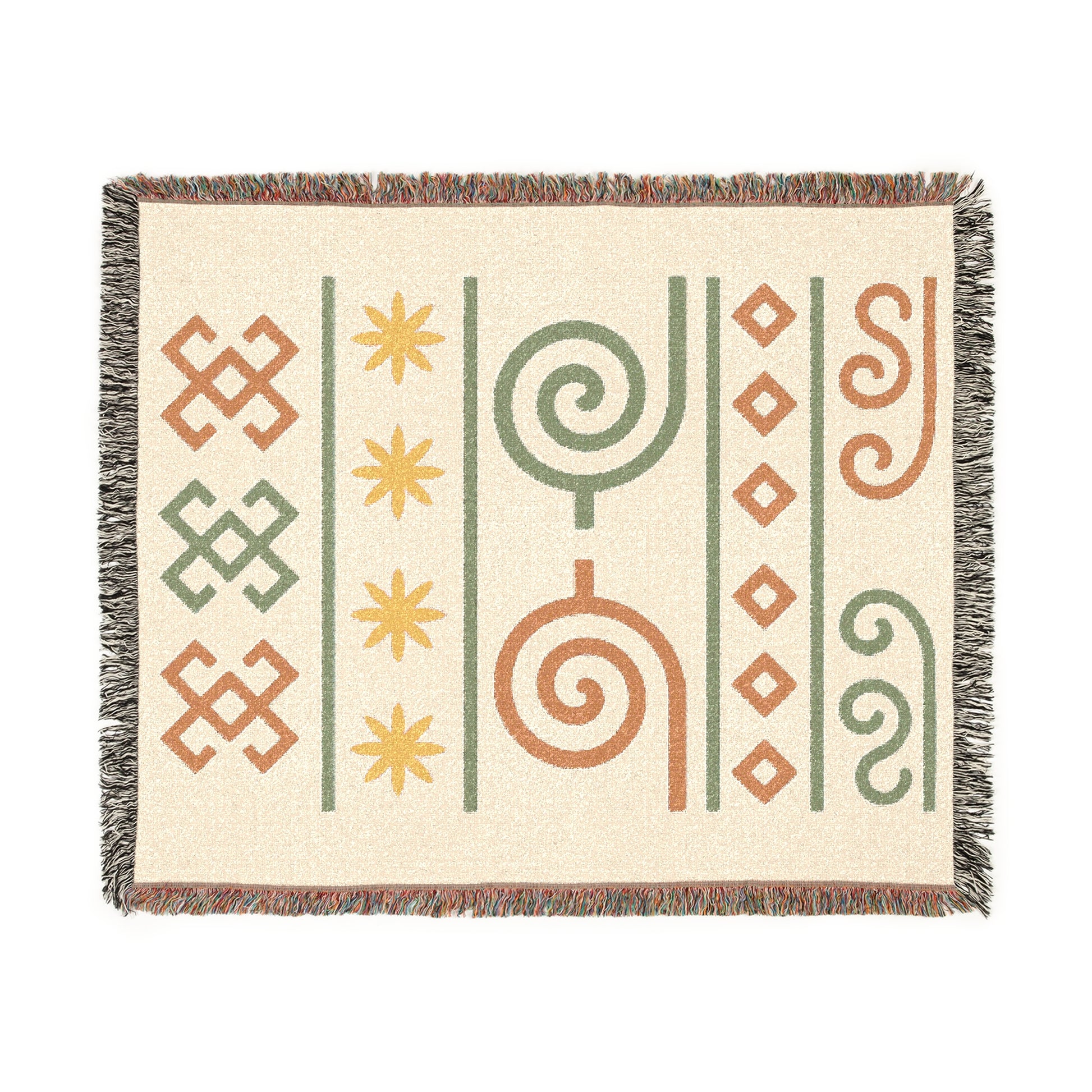 Sage, Terracotta & Gold Boho Tribal Symbol Woven Throw Blanket - Illyrian Weave